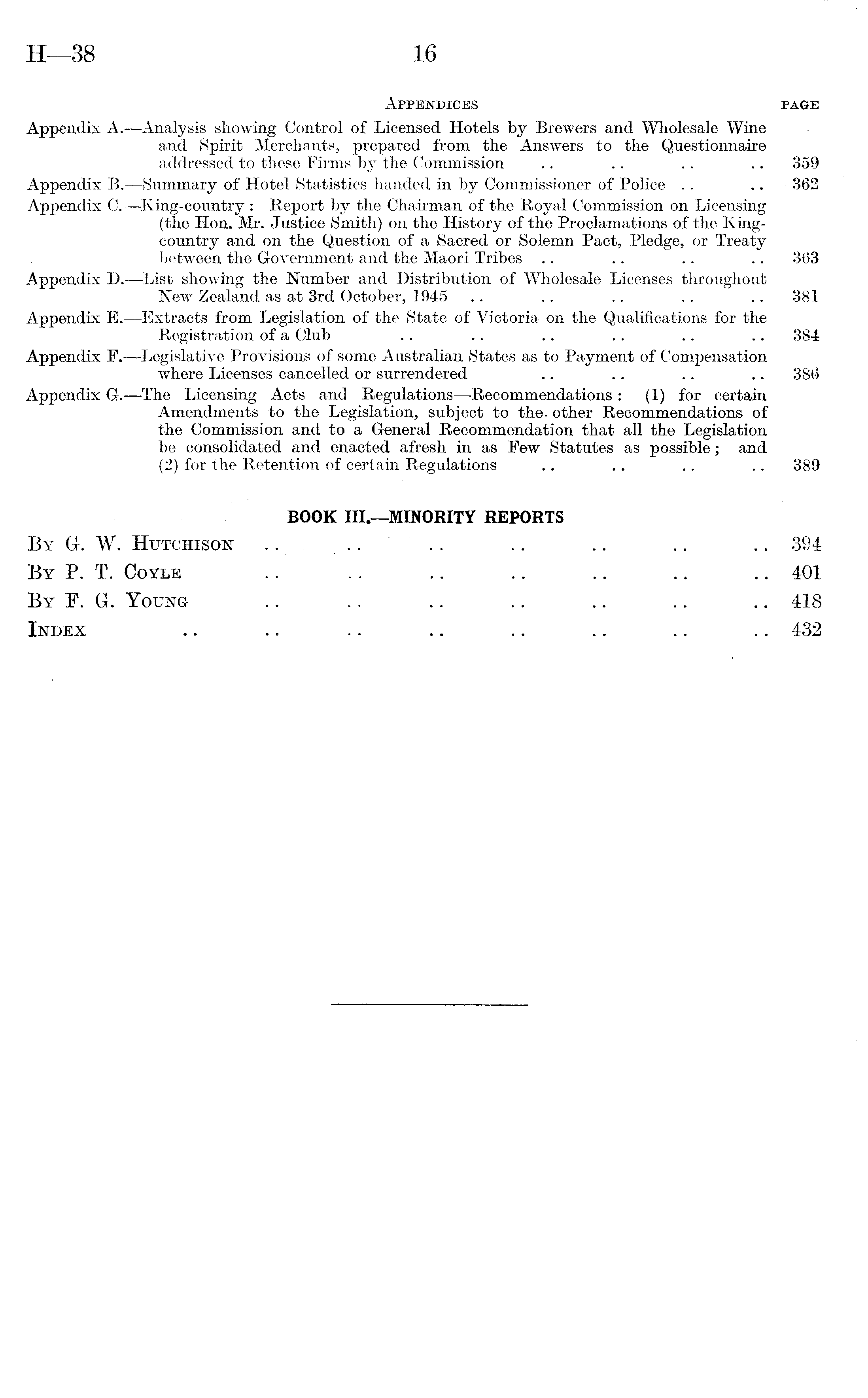 Appendices page Appendix A.—Analysis showing Control of Licensed Hotels by Brewers and Wholesale Wine and Spirit Merchants, prepared from the Answers to the Questionnaire addressed to these Firms by the Commission .. .. .. .. 359 Appendix B.—Summary of Hotel Statistics handed in by Commissioner of Police .. .. 362 Appendix C. —King-country : Report by the Chairman of the Royal Commission on Licensing (the Hon. Mr. Justice Smith) on the History of the Proclamations of the Kingcountry and on the Question of a Sacred or Solemn Pact, Pledge, or Treaty between the Government and the Maori Tribes .. .. .. .. 363 Appendix D.—List showing the Number and Distribution of Wholesale Licenses throughout New Zealand as at 3rd October, 1945 .. .. .. .. .. 381 Appendix E.—Extracts from Legislation of the State of Victoria on the Qualifications for the Registration of a Club .. .. .. .. .. .. 384 Appendix F.—Legislative Provisions of some Australian States as to Payment of Compensation where Licenses cancelled or surrendered .. .. .. .. 386 Appendix G.—The Licensing Acts and Regulations—Recommendations : (1) for certain Amendments to the Legislation, subject to the. other Recommendations of the Commission and to a General Recommendation that all the Legislation be consolidated and enacted afresh in as Few Statutes as possible; and (2) for the Retention of certain Regulations .. . I .. .. 389 BOOK lII.—MINORITY REPORTS By Gr. W. Hutchison .. .. .. .. .. .. .. 394 By P. T. Coyle .. .. .. .. .. .. .. 401 By F. Gr. Young .. .. .. .. .. .. .. 418 Index .. .. .. .. .. .. .. .. 432