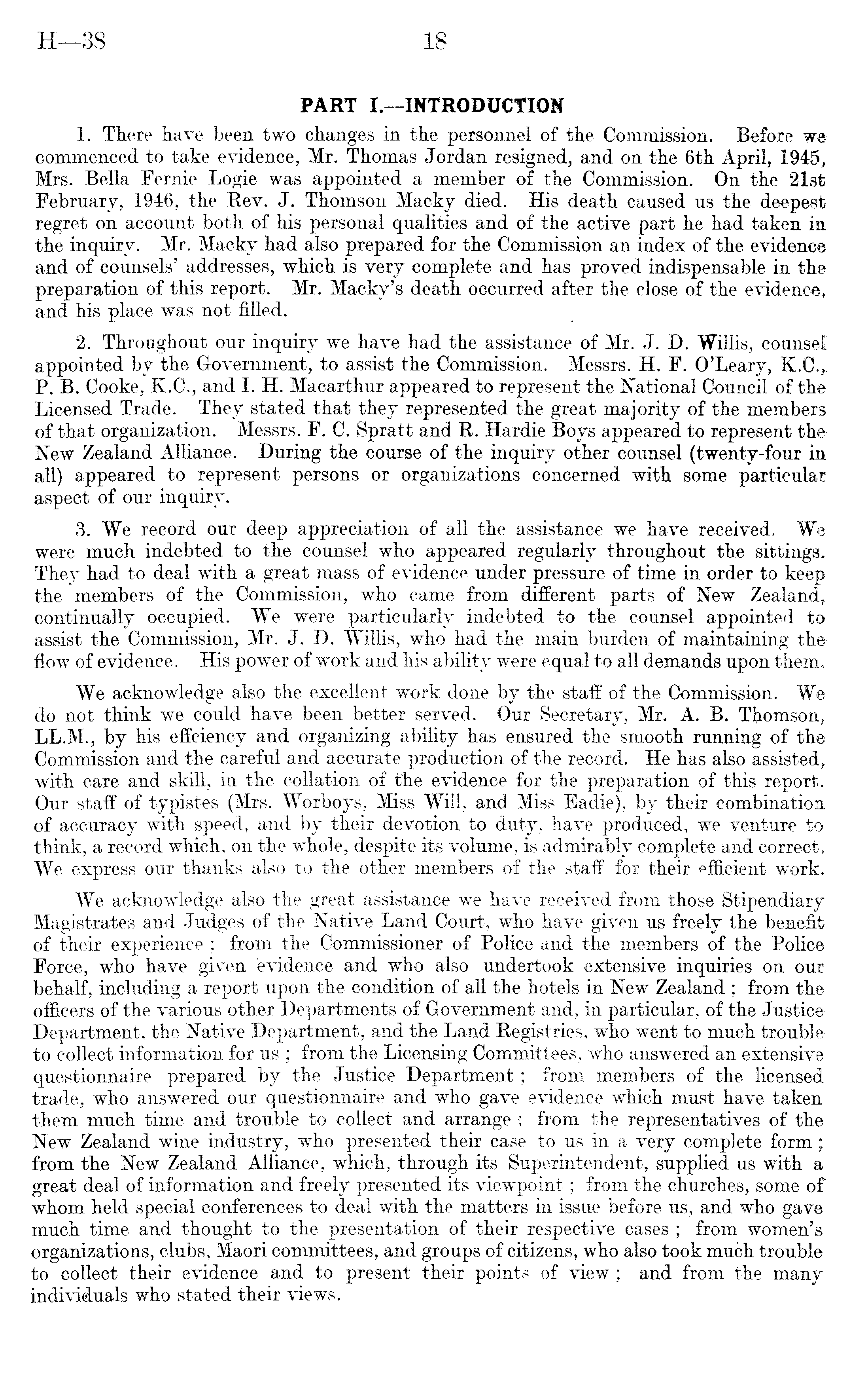 PART I.—INTRODUCTION 1. There have been two changes in the personnel of the Commission. Before wecommenced to take evidence, Mr. Thomas Jordan resigned, and on the 6th April, 1945, Mrs. Bella Fernie Logie was appointed a member of the Commission. On the 21st February, 1946, the Rev. J. Thomson Macky died. His death caused us the deepest regret on account both of his personal qualities and of the active part he had taken in the inquiry. Mr. Macky had also prepared for the Commission an index of the evidence and of counsels' addresses, which is very complete and has proved indispensable in the preparation of this report. Mr. Macky's death occurred after the close of the evidence, and his place was not filled. 2. Throughout our inquiry we have had the assistance of Mr. J. D. Willis, counsel appointed by the Government, to assist the Commission. Messrs. H. F. O'Leary, K.C., P. B. Cooke, K.C., and I. H. Macarthur appeared to represent the National Council of the Licensed Trade. They stated that they represented the great majority of the members of that organization. Messrs. F. C. Spratt and R. Hardie Boys appeared to represent the New Zealand Alliance. During the course of the inquiry other counsel (twenty-four in all) appeared to represent persons or organizations concerned with some particular aspect of our inquiry. 3. We record our deep appreciation of all the assistance we have received. We were much indebted to the counsel who appeared regularly throughout the sittings. They had to deal with a great mass of evidence under pressure of time in order to keep the members of the Commission, who came from different parts of New Zealand* continually occupied. We were particularly indebted to the counsel appointed to assist the Commission, Mr. J. D. Willis, who had the main burden of maintaining the flow of evidence. His power of work and his ability were equal to all demands upon them. We acknowledge also the excellent work done by the staff of the Commission. We do not think we could have been better served. Our Secretary, Mr. A. B. Thomson, LL.M., by his efficiency and organizing ability has ensured the smooth running of the Commission and the careful and accurate production of the record. He has also assisted* with care and skill, in the collation of the evidence for the preparation of this report. Our staff of typistes (Mrs. Worboys, Miss Will, and Miss Eadie), by their combination of accuracy with speed, and by their devotion to duty, have produced, we venture to think, a record which, on the whole, despite its volume, is admirably complete and correctWe express our thanks also to the other members of the staff for their efficient work. We acknowledge also the great assistance we have received from those Stipendiary Magistrates and Judges of the Native Land Court, who have given us freely the benefit of their experience ; from the Commissioner of Police and the members of the Police Force, who have given evidence and who also undertook extensive inquiries on our behalf, including a report upon the condition of all the hotels in New Zealand ; from the officers of the various other Departments of Government and, in particular, of the Justice Department, the Native Department, and the Land Registries, who went to much trouble to collect information for us ; from the Licensing Committees, who answered an extensive questionnaire prepared by the Justice Department; from members of the licensed trade, who answered our questionnaire and who gave evidence which must have taken them much time and trouble to collect and arrange ; from the representatives of the New Zealand wine industry, who presented their case to us in a very complete form; from the New Zealand Alliance, which, through its Superintendent, supplied us with a great deal of information and freely presented its viewpoint; from the churches, some of whom held special conferences to deal with the matters in issue before us, and who gave much time and thought to the presentation of their respective cases ; from women's organizations, clubs, Maori committees, and groups of citizens, who also took much trouble to collect their evidence and to present their points of view ; and from the many individuals who stated their views.