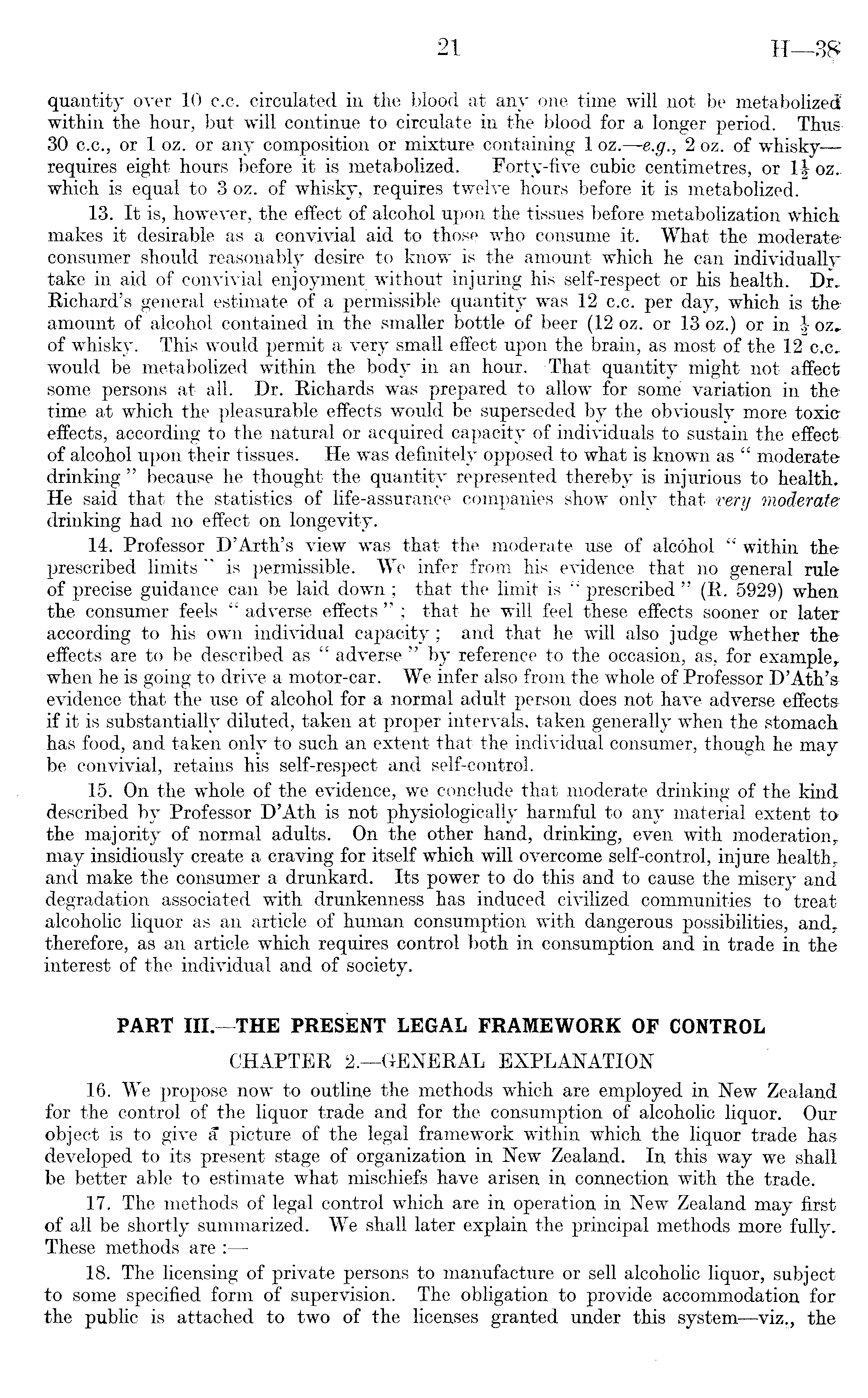 quantity over 10 c.c. circulated in the blood at any one time will not be metabolized within the hour, but will continue to circulate in the blood for a longer period. Thus 30 c.c., or 1 oz. or any composition or mixture containing 1 oz. —e.g., 2 oz. of whisky—requires eight hours before it is metabolized. Forty-five cubic centimetres, or 1| oz, which is equal to 3 oz. of whisky, requires twelve hours before it is metabolized. 13. It is, however, the effect of alcohol upon the tissues before metabolization which makes it desirable as a convivial aid to those who consume it. What the moderate consumer should reasonably desire to know is the amount which he can individually take in aid of convivial enjoyment without injuring his self-respect or his health. Dr. Richard's general estimate of a permissible quantity was 12 c.c. per day, which is the amount of alcohol contained in the smaller bottle of beer (12 oz. Or 13 oz.) or in \ oz„ of whisky. This would permit a very small effect upon the brain, as most of the 12 c.c, would be metabolized within the body in an hour. That quantity might not affect some persons at all. Dr. Richards was prepared to allow for some variation in the time at which the pleasurable effects would be superseded by the obviously more toxic effects, according to the natural or acquired capacity of individuals to sustain the effect of alcohol upon their tissues. He was definitely opposed to what is known as " moderate drinking " because he thought the quantity represented thereby is injurious to health. He said that the statistics of life-assurance companies show only that very moderate drinking had no effect on longevity. 14. Professor D'Arth's view was that the moderate use of alcohol " within the prescribed limits " is permissible. We infer from his evidence that no general rule of precise guidance can be laid down ; that the limit is " prescribed " (R. 5929) when the consumer feels " adverse effects " ; that he will feel these effects sooner or later according to his own individual capacity; and that he will also judge whether the effects are to be described as " adverse " by reference to the occasion, as, for example, when he is going to drive a motor-car. We infer also from the whole of Professor D'Ath's evidence that the use of alcohol for a normal adult person does not have adverse effects if it is substantially diluted, taken at proper intervals, taken generally when the stomach has food, and taken only to such an extent that the individual consumer, though he may be convivial, retains his self-respect and self-control. 15. On the whole of the evidence, we conclude that moderate drinking of the kind described by Professor D'Ath is not physiologically harmful to any material extent to the majority of normal adults. On the other hand, drinking, even with moderation, may insidiously create a craving for itself which will overcome self-control, injure health, and make the consumer a drunkard. Its power to do this and to cause the misery and degradation associated with drunkenness has induced civilized communities to treat alcoholic liquor as an article of human consumption with dangerous possibilities, and, therefore, as an article which requires control both in consumption and in trade in the interest of the individual and of society. PART lII.—THE PRESENT LEGAL FRAMEWORK OF CONTROL CHAPTER 2.—GENERAL EXPLANATION 16. We propose now to outline the methods which are employed in New Zealand for the control of the liquor trade and for the consumption of alcoholic liquor. Our object is to give a picture of the legal framework within which the liquor trade has developed to its present stage of organization in New Zealand. In this way we shall be better able to estimate what mischiefs have arisen in connection with the trade. 17. The methods of legal control which are in operation in New Zealand may first of all be shortly summarized. We shall later explain the principal methods more fully. These methods are : 18. The licensing of private persons to manufacture or sell alcoholic liquor, subject to some specified form of supervision. The obligation to provide accommodation for the public is attached to two of the licenses granted under this system—viz., the