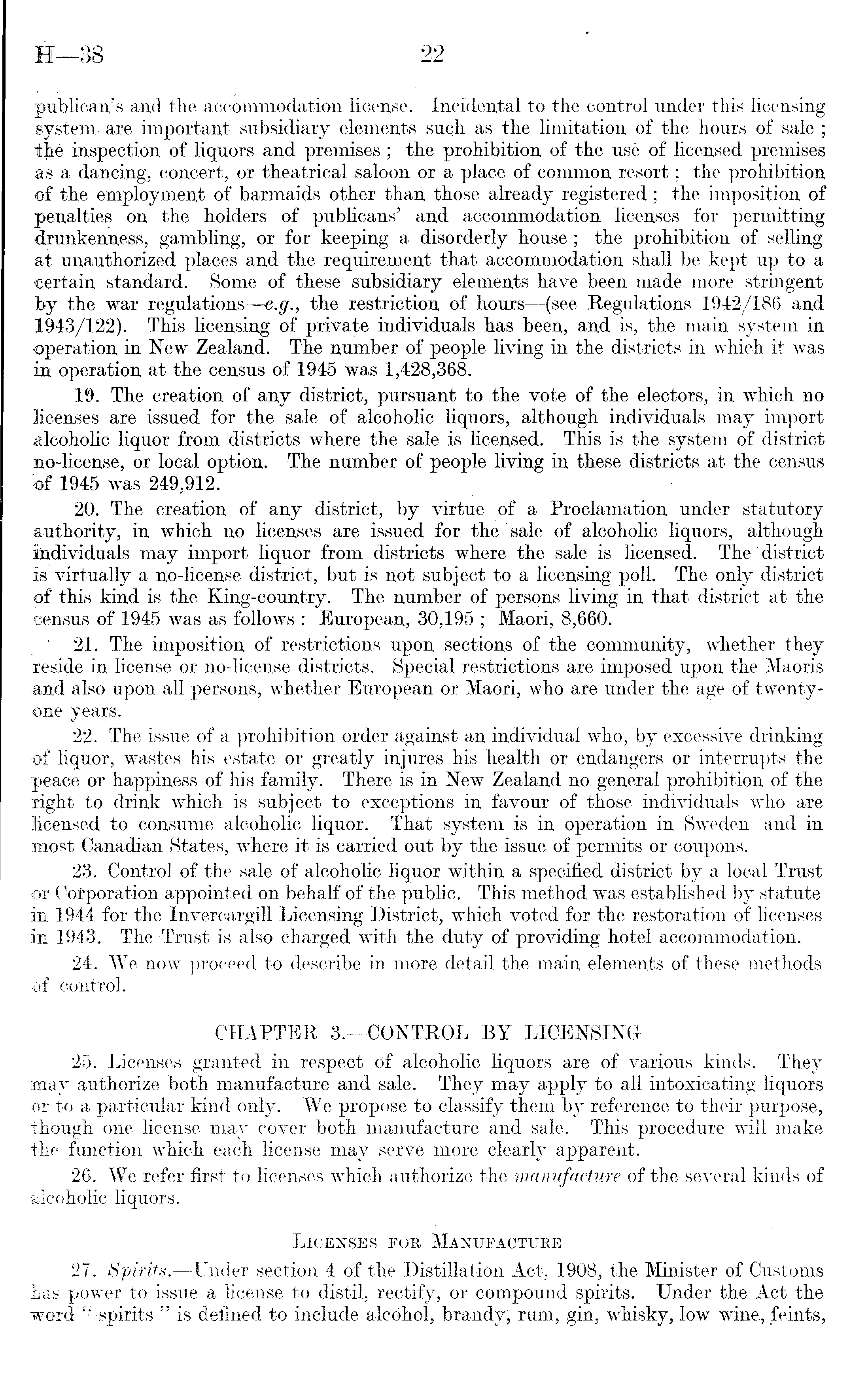 publican's and the accommodation license. Incidental to the control under this licensing system are important subsidiary elements such as the limitation of the hours of sale ; the inspection of liquors and premises ; the prohibition of the use of licensed premises as a dancing, concert, or theatrical saloon or a place of common resort; the prohibition of the employment of barmaids other than those already registered ; the imposition of penalties on the holders of publicans' and accommodation licenses for permitting drunkenness, gambling, or for keeping a disorderly house ; the prohibition of selling at unauthorized places and the requirement that accommodation shall be kept up to a certain standard. Some of these subsidiary elements have been made more stringent by the war regulations —e.g., the restriction of hours —(see Regulations 1942/186 and 1943/122). This licensing of private individuals has been, and is, the main system in Operation in New Zealand. The number of people living in the districts in which it was in operation at the census of 1945 was 1,428,368. 19. The creation of any district, pursuant to the vote of the electors, in which no licenses are issued for the sale of alcoholic liquors, although individuals may import alcoholic liquor from districts where the sale is licensed. This is the system of district no-license, or local option. The number of people living in these districts at the census of 1945 was 249,912. 20. The creation of any district, by virtue of a Proclamation under statutory authority, in which no licenses are issued for the sale of alcoholic liquors, although individuals may import liquor from districts where the sale is licensed. The district is virtually, a no-license district, but is not subject to a licensing poll. The only district of this kind is the King-country. The number of persons living in that district at the census of 1945 was as follows : European, 30,195 ; Maori, 8,660. 21. The imposition of restrictions upon sections of the community, whether they reside in license or no-license districts. Special restrictions are imposed upon the Maoris and also upon all persons, whether European or Maori, who are under the age of twentyone years. 22. The issue of a prohibition order against an individual who, by excessive drinking of liquor, wastes his estate or greatly injures his health or endangers or interrupts the peace or happiness of his family. There is in New Zealand no general prohibition of the right to drink which is subject to exceptions in favour of those individuals who are licensed to consume alcoholic liquor. That system is in operation in Sweden and in most Canadian States, where it is carried out by the issue of permits or coupons. 23. Control of the sale of alcoholic liquor within a specified district by a local Trust or Corporation appointed on behalf of the public. This method was established by statute in 1944 for the Invercargill Licensing District, which voted for the restoration of licenses in 1943. The Trust is also charged with the duty of providing hotel accommodation. 24. We now proceed to describe in more detail the main elements of these methods of control. CHAPTER 3.—CONTROL BY LICENSING 25. Licenses granted in respect of alcoholic liquors are of various kinds. They may authorize both manufacture and sale. They may apply to all intoxicating liquors or to a particular kind only. We propose to classify them by reference to their purpose, though one license may cover both manufacture and sale. This procedure will make the function which each license may serve more clearly apparent. 26. We refer first to licenses which authorize the manufacture of the several kinds of alcoholic liquors. Licenses for Manufacture 27. Spirits.—Under section 4 of the Distillation Act, 1908, the Minister of Customs has power to issue a license to distil, rectify, or compound spirits. Under the Act the word '■■■ spirits "is defined to include alcohol, brandy, rum, gin, whisky, low wine, feints,