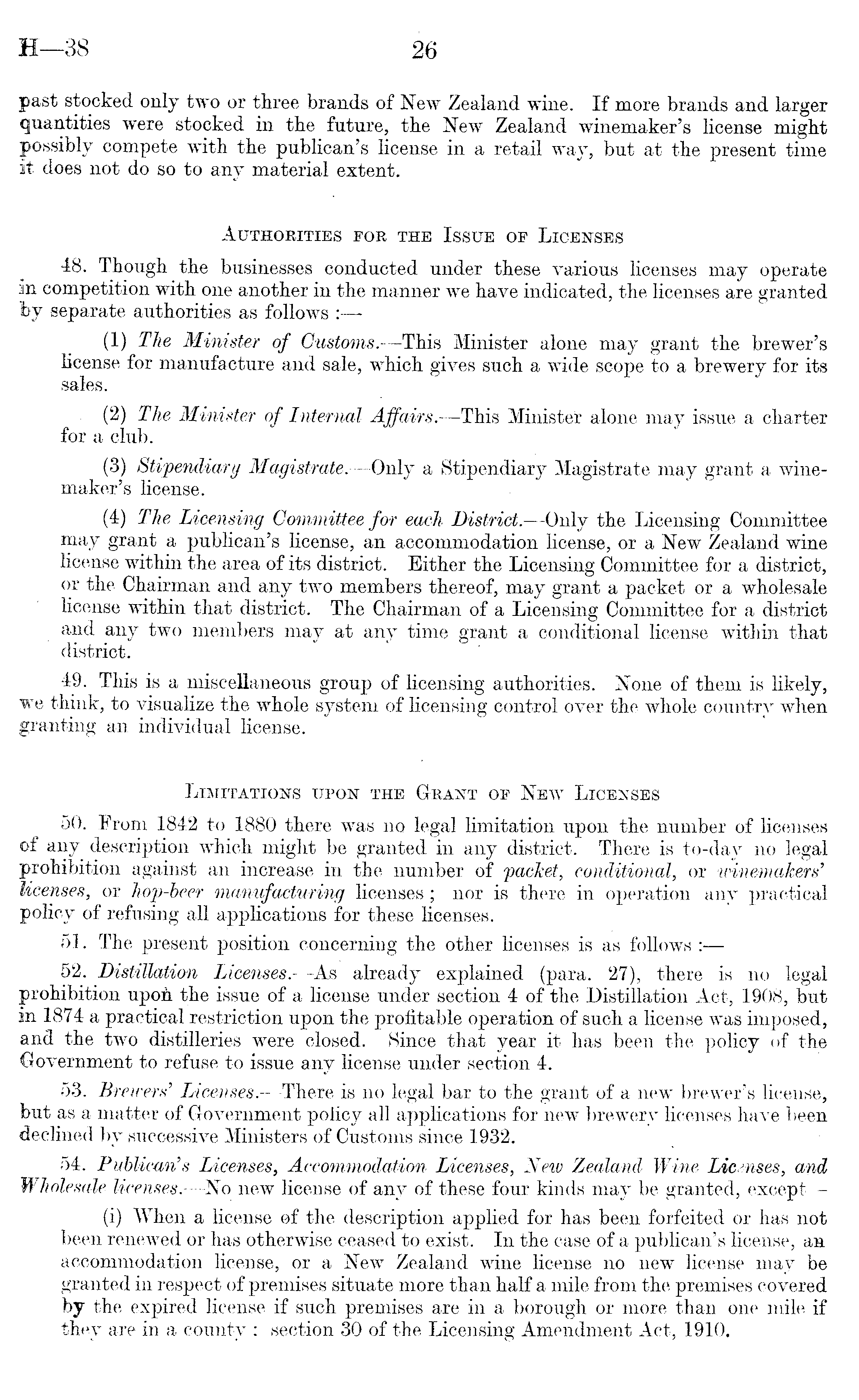 past stocked only two or three brands of New Zealand wine. If more brands and larger quantities were stocked in the future, the New Zealand winemaker's license might possibly compete with the publican's license in a retail way, but at the present time it does not do so to any material extent. Authorities for the Issue of Licenses 48. Though the businesses conducted under these various licenses may operate in competition with one another in the manner we have indicated, the licenses are granted by separate authorities as follows (1) The Minister of Customs.—This Minister alone may grant the brewer's license for manufacture and sale, which gives such a wide scope to a brewery for its sales. . (2) The Minister of Internal Affairs. —This Ministefc alone may issue a charter for a club. (3) Stipendiary Magistrate.—Only a Stipendiary Magistrate may grant a winemaker's license. (4) The Licensing Committee for each District. —Only the Licensing Committee may grant a publican's license, an accommodation license, or a New Zealand wine license within the area of its district. Either the Licensing Committee for a district, or the Chairman and any two members thereof, may grant a packet or a wholesale license within that district. The Chairman of a Licensing Committee for a district and any two members may at any time grant a conditional license within that district. 49. This is a miscellaneous group of licensing authorities. None of them is likely, we think, to visualize the whole system of licensing control over the whole country when granting an individual license. Limitations upon the Grant of New Licenses 50. From 1842 to 1880 there was no legal limitation upon the number of licenses of any description which might be granted in any district. There is to-day no legal prohibition against an increase in the number of packet, conditional, or winemakers' licenses, or hop-beer manufacturing licenses ; nor is there in operation any practical policy of refusing all applications for these licenses. 51. The present position concerning the other licenses is as follows : 52. Distillation Licenses. —As already explained (para. 27), there is no . legal prohibition upon the issue of a license under section 4 of the Distillation Act, 1908, but in 1874 a practical restriction upon the profitable operation of such a license was imposed, and the two distilleries were closed. Since that year it has been the policy of the Government to refuse to issue any license under section 4. 53. Brewers' Licenses.—There is no legal bar to the grant of a new brewer's license, but as a matter of Government policy all applications for new brewery licenses have been declined by successive Ministers of Customs since 1932. 54. Publican's Licenses, Accommodation Licenses, New Zealand Wine Licsnses, arid Wholesale licenses.—No new license of any of these four kinds may be granted, except—(i) When a license of the description applied for has been forfeited or has not been renewed or has otherwise ceased to exist. In the case of a publican's license, an accommodation license, or a New Zealand wine license no new license may be granted in respect of premises situate more than half a mile from the premises covered by the expired license if such premises are in a borough or more than one mile if they are in a county : section 30 of the Licensing Amendment Act, 1910.