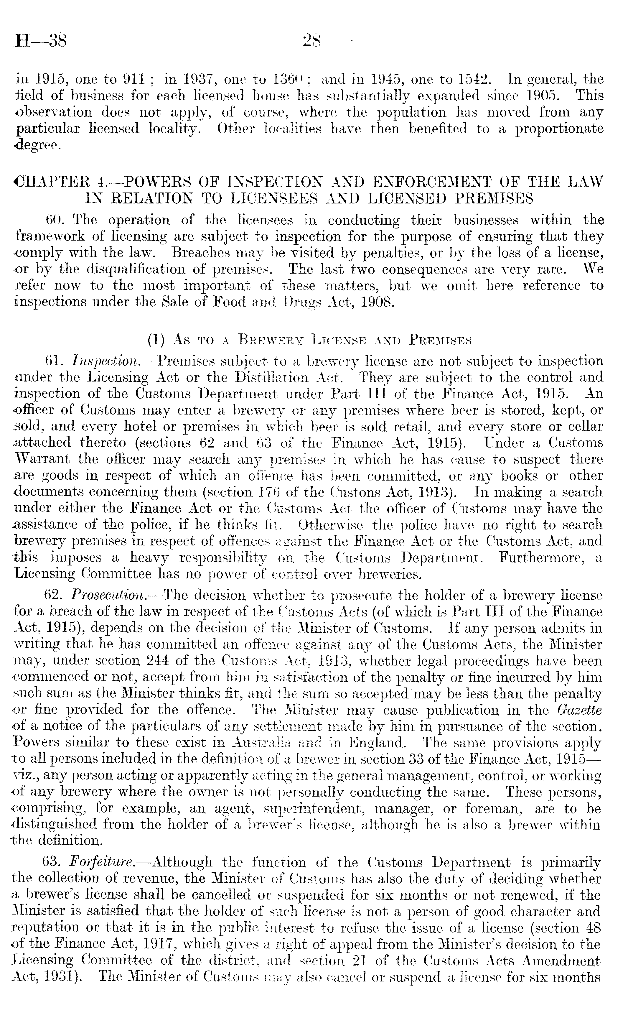 in 1915, one to 911 ; in 1937, one to 1360; and in 1945, one to 1542. In general, the field of business for each licensed house has substantially expanded since 1905. This observation does not apply, of course, where the population has moved from any particular licensed locality. Other localities have then benefited to a proportionate ■degree. CHAPTER 4.—POWERS OF INSPECTION AND ENFORCEMENT OF THE LAW IN RELATION TO LICENSEES AND LICENSED PREMISES 60. The operation of the licensees in conducting their businesses within the framework of licensing are subject to inspection for the purpose of ensuring that they ■comply with the law. Breaches may be visited by penalties, or by the loss of a license, ■or by the disqualification of premises. The last two consequences are very rare. We refer now to the most important of these matters, but we omit here reference to inspections under the Sale of Food and Drugs Act, 1908. (1) As to a Brewery License and Premises 61. Inspection.—Premises subject to a brewery license are not subject to inspection under the Licensing Act or the Distillation Act. They are subject to the control and inspection of the Customs Department under Part 111 of the Finance Act, 1915. An officer of Customs may enter a brewery or any premises where beer is stored, kept, or sold, and every hotel or premises in which beer is sold retail, and every store or cellar •attached thereto (sections 62 and 63 of the Finance Act, 1915). Under a Customs Warrant the officer may search any premises in which he has cause to suspect there •are goods in respect of which an offence has been committed, or any books or other documents concerning them (section 176 of the Custons Act, 1913). In making a search under either the Finance Act or the Customs Act the officer of Customs may have the .assistance of the police, if he thinks fit. Otherwise the police have no right to search brewery premises in respect of offences against the Finance Act or the Customs Act, and this imposes a heavy responsibility on the Customs Department. Furthermore, a Licensing Committee has no power of control over breweries. 62. Prosecution.—The decision whether to prosecute the holder of a brewery license for a breach of the law in respect of the Customs Acts (of which is Part 111 of the Finance Act, 1915), depends on the decision of the Minister of Customs. If any person admits in writing that he has committed an offence against any of the Customs Acts, the Minister may, under section 244 of the Customs Act, 1913, whether legal proceedings have been ■commenced or not, accept from him in satisfaction of the penalty or fine incurred by him such sum as the Minister thinks fit, and the sum so accepted may be less than the penalty or fine provided for the offence. The Minister may cause publication in the Gazette of a notice of the particulars of any settlement made by him in pursuance of the section. Powers similar to these exist in Australia and in England. The same provisions apply to all persons included in the definition of a brewer in section 33 of the Finance Act, 1915 viz., any person acting or apparently acting in the general management, control, or working of any brewery where the owner is not personally conducting the same. These persons, •comprising, for example, an agent, superintendent, manager, or foreman, are to be ■distinguished from the holder of a brewer's license, although he is also a brewer within the definition. 63. Forfeiture. —Although the function of the Customs Department is primarily the collection of revenue, the Minister of Customs has also the duty of deciding whether a brewer's license shall be cancelled or suspended for six months or not renewed, if the Minister is satisfied that the holder of such license is not a person of good character and reputation or that it is in the public interest to refuse the issue of a license (section 48 of the Finance Act, 1917, which gives a right of appeal from the Minister's decision to the Licensing Committee of the district, and section 21 of the Customs Acts Amendment Act, 1931). The Minister of Customs may also cancel or suspend a license for six months