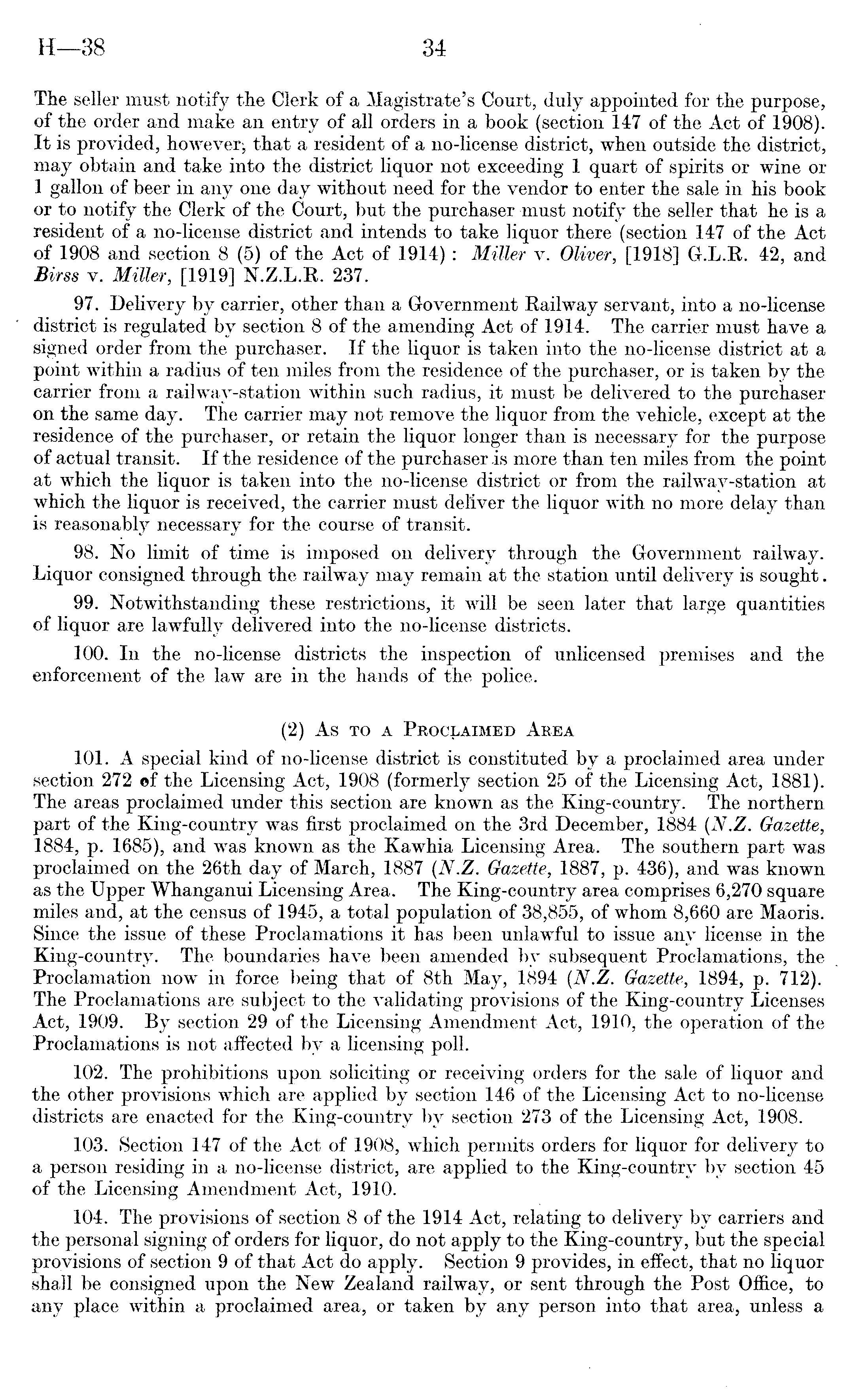 The seller must notify the Clerk of a Magistrate's Court, duly appointed for the purpose, of the order and make an entry of all orders in a book (section 147 of the Act of 1908). It is provided, however-, that a resident of a no-license district, when outside the district, may obtain and take into the district liquor not exceeding 1 quart of spirits or wine or 1 gallon of beer in any one day without need for the vendor to enter the sale in his book or to notify the Clerk of the Court, but the purchaser'must notify the seller that he is a resident of a no-license district and intends to take liquor there (section 147 of the Act of 1908 and section 8 (5) of the Act of 1914) : Miller v. Oliver, [l9lB] G.L.R. 42, and Birss v. Miller, [1919] N.Z.L.R. 237. 97. Delivery by carrier, other than a Government Railway servant, into a no-license district is regulated by section Bof the amending Act of 1914. The carrier must have a signed order from the purchaser. If the liquor is taken into the no-license district at a point within a radius of ten miles from the residence of the purchaser, or is taken by the carrier from a railway-station within such radius, it must be delivered to the purchaser on the same day. The carrier may not remove the liquor from the vehicle, except at the residence of the purchaser, or retain the liquor longer than is necessary for the purpose of actual transit. If the residence of the purchaser is more than ten miles from the point at which the liquor is taken into the no-license district or from the railway-station at which the liquor is received, the carrier must deliver the liquor with no more delay than is reasonably necessary for the course of transit. 98. No limit of time is imposed on delivery through the Government railway. Liquor consigned through the railway may remain at the station until delivery is sought. 99. Notwithstanding these restrictions, it will be seen later that large quantities of liquor are lawfully delivered into the no-license districts. 100. In the no-license districts the inspection of unlicensed premises and the enforcement of the law are in the hands of the police. (2) As to a Proclaimed Area 101. A special kind of no-license district is constituted by a proclaimed area under section 272 ©f the Licensing Act, 1908 (formerly section 25 of the Licensing Act, 1881). The areas proclaimed under this section are known as the King-country. The northern part of the King-country was first proclaimed on the 3rd December, 1884 (N.Z. Gazette, 1884, p. 1685), and was known as the Kawhia Licensing Area. The southern part was proclaimed on the 26th day of March, 1887 (N.Z. Gazette, 1887, p. 436), and was known as the Upper Whanganui Licensing Area. The King-country area comprises 6,270 square miles and, at the census of 1945, a total population of 38,855, of whom 8,660 are Maoris. Since the issue of these Proclamations it has been unlawful to issue any license in the King-country. The boundaries have been amended by subsequent Proclamations, the Proclamation now in force being that of Bth May, 1894 (N.Z. Gazette, 1894, p. 712). The Proclamations are subject to the validating provisions of the King-country Licenses Act, 1909. By section 29 of the Licensing Amendment Act, 1910, the operation of the Proclamations is not affected by a licensing poll. 102. The prohibitions upon soliciting or receiving orders for the sale of liquor and the other provisions which are applied by section 146 of the Licensing Act to no-license districts are enacted for the King-country by section 273 of the Licensing Act, 1908. 103. Section 147 of the Act of 1908, which permits orders for liquor for delivery to a person residing in a no-license district, are applied to the King-country by section 45 of the Licensing Amendment Act, 1910. 104. The provisions of section 8 of the 1914 Act, relating to delivery by carriers and the personal signing of orders for liquor, do not apply to the King-country, but the special provisions of section 9of that Act do apply. Section 9 provides, in effect, that no liquor shall be consigned upon the New Zealand railway, or sent through the Post Office, to any place within a proclaimed area, or taken by any person into that area, unless a