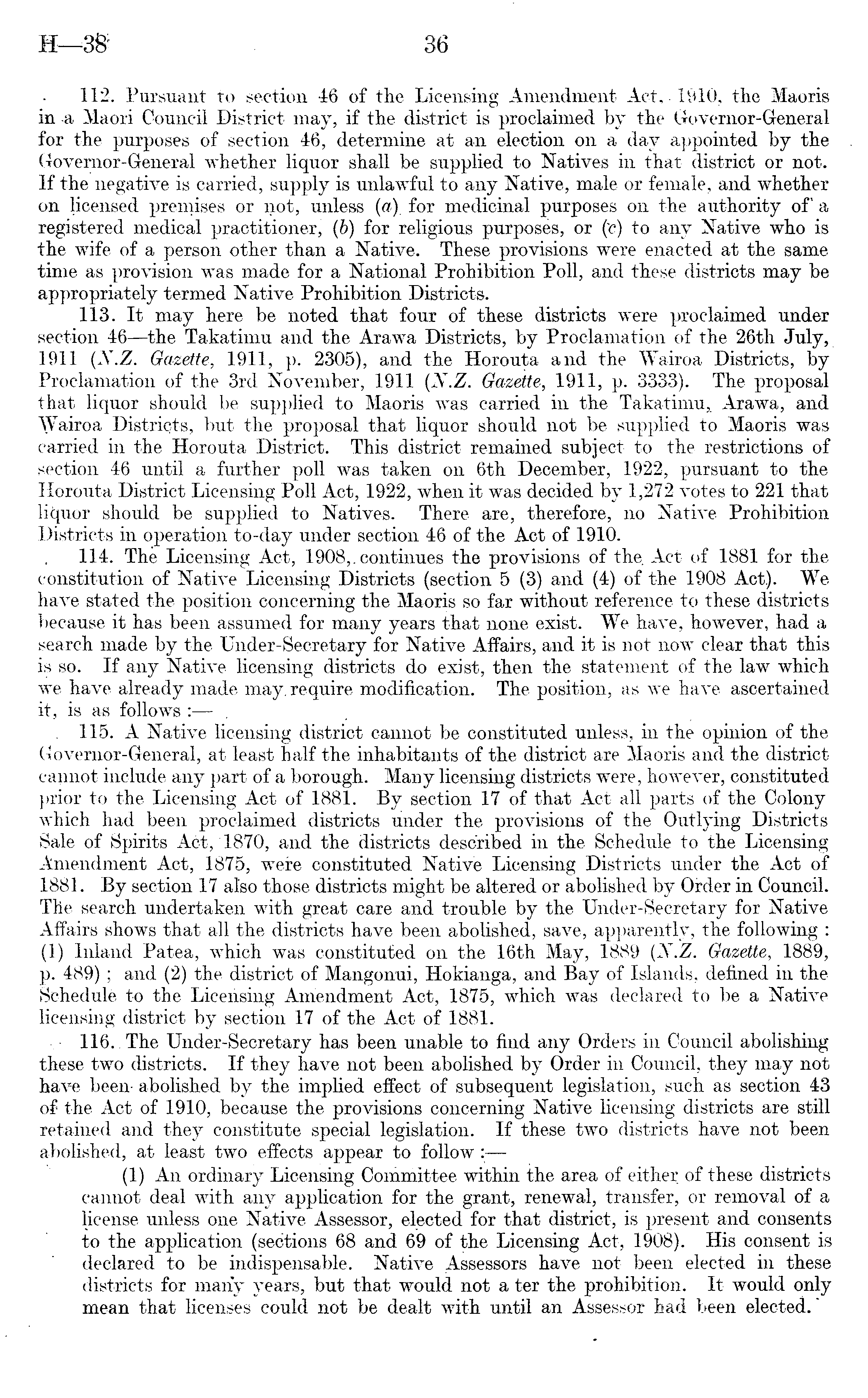 I*l2. Pursuant to section 46 of the Licensing Amendment Act, 1910, the Maoris in a Maori Council District may, if the district is proclaimed by the Governor-General for the purposes of section 46, determine at an election on a day appointed by the Governor-General whether liquor shall be supplied to Natives in that district or not. If the negative is carried, supply is unlawful to any Native, male or female, and whether on licensed premises or not, unless (cs) for medicinal purposes on the authority of' a registered medical practitioner, (b) for religious purposes, or ("c) to any Native who is the wife of a person other than a Native. These provisions were enacted at the same time as provision was made for a National Prohibition Poll, and these districts may be appropriately termed Native Prohibition Districts. 113. It may here be noted that four of these districts were proclaimed under section 46—the Takatimu and the Arawa Districts, by Proclamation of the 26th July, 1911 (N.Z. Gazette, 1911, p. 2305), and the Horouta and the Wairoa Districts, by Proclamation of the 3rd November, 1911 (N.Z. Gazette, 1911, p. 3333). The proposal that liquor should be supplied to Maoris was carried in the Takatimu,. Arawa, and Wairoa Districts, but the proposal that liquor should not be supplied to Maoris was carried in the Horouta District. This district remained subject to the restrictions of section 46 until a further poll was taken on 6th December, 1922, pursuant to the Horouta District Licensing Poll Act, 1922, when it was decided by 1,272 votes to 221 that liquor should be supplied to Natives. There are, therefore, no Native Prohibition Districts in operation to-day under section 46 of the Act of 1910. 114. The Licensing Act, 1908,. continues the provisions of the. Act of 1881 for the constitution of Native Licensing Districts (section 5 (3) and (4) of the 1908 Act). We have stated the position concerning the Maoris so far without reference to these districts because it has been assumed for many years that none exist. We have, however, had a search made by the Under-Secretary for Native Affairs, and it is not now clear that this is so. If any Native licensing districts do exist, then the statement of the law which we have already made may. require modification. The position, as we have ascertained it, is as follows : 115. A Native licensing district cannot be constituted unless, in the opinion of the Governor-General, at least half the inhabitants of the district are Maoris and the district cannot include any part of a borough. Many licensing districts were, however, constituted prior to the Licensing Act of 1881. By section 17 of that Act all parts of the Colony which had been proclaimed districts under the provisions of the Outlying Districts Sale of Spirits Act, 1870, and the districts described in the Schedule to the Licensing Amendment Act, 1875, were constituted Native Licensing Districts under the Act of 1881: By section 17 also those districts might be altered or abolished by Order in Council. The search undertaken with great care and trouble by the Under-Secretary for Native Affairs shows that all the districts have been abolished, save, apparently, the following : (1) Inland Patea, which was constituted on the 16th May, 1889 (N.Z. Gazette, 1889, p. 489) ; and (2) the district of Mangonui, Hokianga, and Bay of Islands, defined in the Schedule to the Licensing Amendment Act, 1875, which was declared to be a Native licensing district by section 17 of the Act of 1881. 116. The Under-Secretary has been unable to find any Orders in Council abolishing these two districts. If they have not been abolished by Order in Council, they may not have been- abolished by the implied effect of subsequent legislation, such as section 43 of thk Act of 1910, because the provisions concerning Native licensing districts are still retained and they constitute special legislation. If these two districts have not been abolished, at least two effects appear to follow : (1) An ordinary Licensing Committee within the area of either of these districts cannot deal with any application for the grant, renewal, transfer, or removal of a license unless one Native Assessor, elected for that district, is present and consents to the application (sections 68 and 69 of the Licensing Act, 1908). His consent is declared to be indispensable. Native Assessors have not been elected in these districts for many years, but that would not a ter the prohibition. It would only mean that licenses could not be dealt with until an Assessor had been elected."