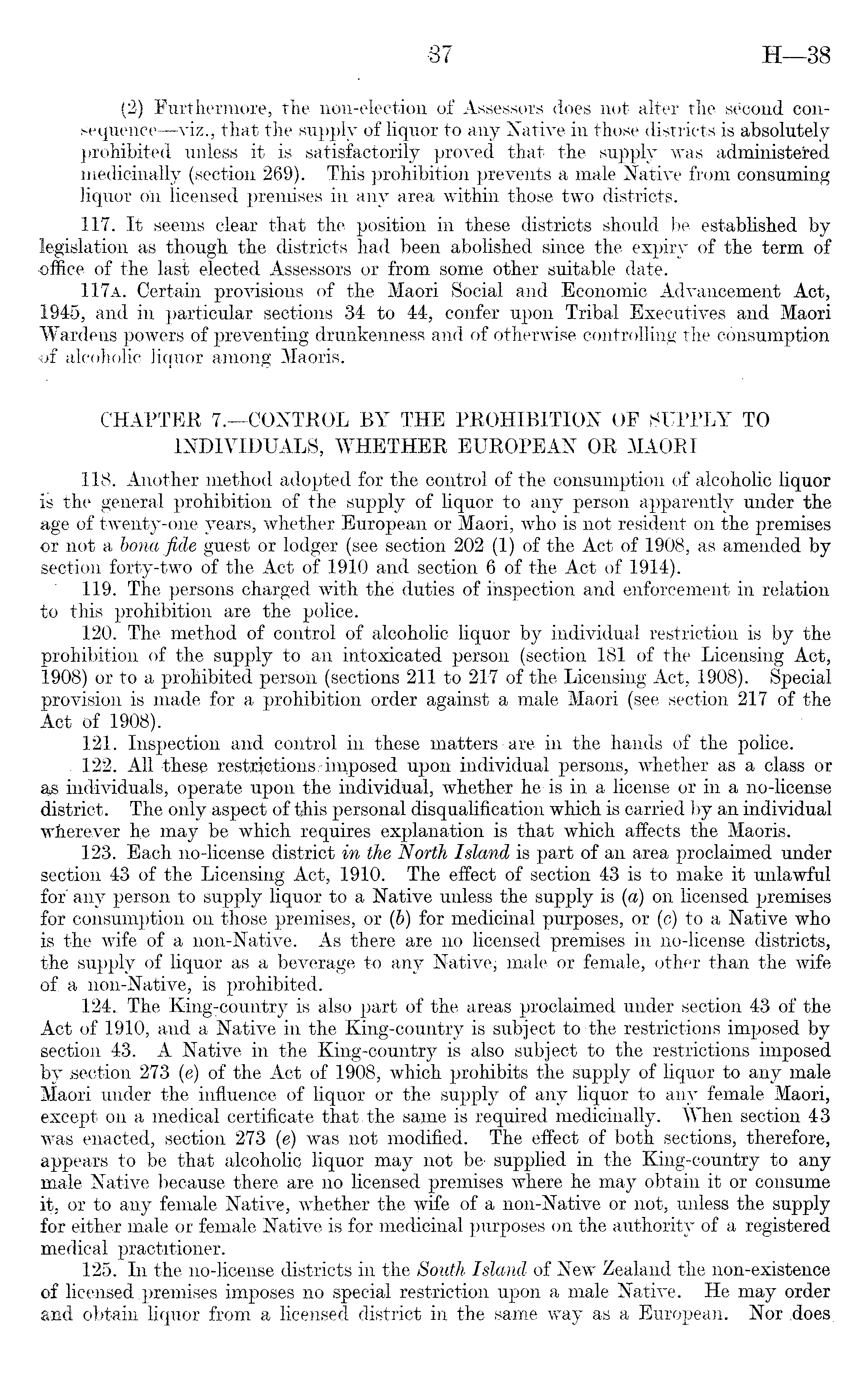 (2) Furthermore, the non-election of Assessors does not alter the second consequence —viz., that the supply of liquor to any Native in those districts is absolutely prohibited unless it is satisfactorily proved that the supply was administered medicinally (section 269). This prohibition prevents a male Native from consuming liquor on licensed premises in any area within those two districts. 117. It seems clear that the position in these districts should be established by legislation as though the districts had been abolished since the expiry of the term of office of the last elected Assessors or from some other suitable date. 117 a. Certain provisions of the Maori Social and Economic Advancement Act, 1945, and in particular sections 34 to 44, confer upon Tribal Executives and Maori Wardens powers of preventing drunkenness and of otherwise controlling the consumption of alcoholic liquor among Maoris. CHAPTER 7.—CONTROL BY THE PROHIBITION OF SUPPLY TO INDIVIDUALS, WHETHER EUROPEAN OR MAORI 118. Another method adopted for the control of the consumption of alcoholic liquor is the general prohibition of the supply of liquor to any person apparently under the age of twenty-one years, whether European or Maori, who is not resident on the premises or not a bona fide guest or lodger (see section 202 (1) of the Act of 1908, as amended by section forty-two of the Act of 1910 and section 6 of the Act of 1914). 119. The persons charged with the duties of inspection and enforcement in relation to this prohibition are the police. 120. The method of control of alcoholic liquor by individual restriction is by the prohibition of the supply to an intoxicated person (section 181 of the Licensing Act, 1908) or to a prohibited person (sections 211 to 217 of the Licensing Act, 1908). Special provision is made for a prohibition order against a male Maori (see section 217 of the Act of 1908). 121. Inspection and control in these matters are in the hands of the police. . 122. All these restrictionsimposed upon individual persons, whether as a class or as individuals, operate upon the individual, whether he is in a license or in a no-license district. The only aspect of this personal disqualification which is carried by an individual wherever he may be which requires explanation is that which affects the Maoris. 123. Each no-license district in the North Island is part of an area proclaimed under section 43 of the Licensing Act, 1910. The effect of section 43 is to make it unlawful for" any person to supply liquor to a Native unless the supply is (a) on licensed premises for consumption on those premises, or (b) for medicinal purposes, or (c) to a Native who is the wife of a non-Native. As there are no licensed premises in no-license districts, the supply of liquor as a beverage to any Native, male or female, other than the wife of a non-Native, is prohibited. 124.. The King-country is also part of the areas proclaimed under section 43 of the Act of 1910, and a Native in the King-country is subject to the restrictions imposed by section 43. A Native in the King-country is also subject to the restrictions imposed by section 273 (e) of the Act of 1908, which prohibits the supply of liquor to any male Maori under the influence of liquor or the supply of any liquor to any female Maori, except on a medical certificate that the same is required medicinally. When section 43 was enacted, section 273 (e) was not modified. The effect of both sections, therefore, appears to be that alcoholic liquor may not be. supplied in the King-country to any male Native because there are no licensed premises where he may obtain it or consume it, or to any female Native, whether the wife of a non-Native or not, unless the supply for either male or female Native is for medicinal purposes on the authority of a registered medical practitioner. 125. In the no-license districts in the South Island of New Zealand the non-existence of licensed .premises imposes no special restriction upon a male Native. He may order and obtain liquor from a licensed district in the same way as a European. Nor does