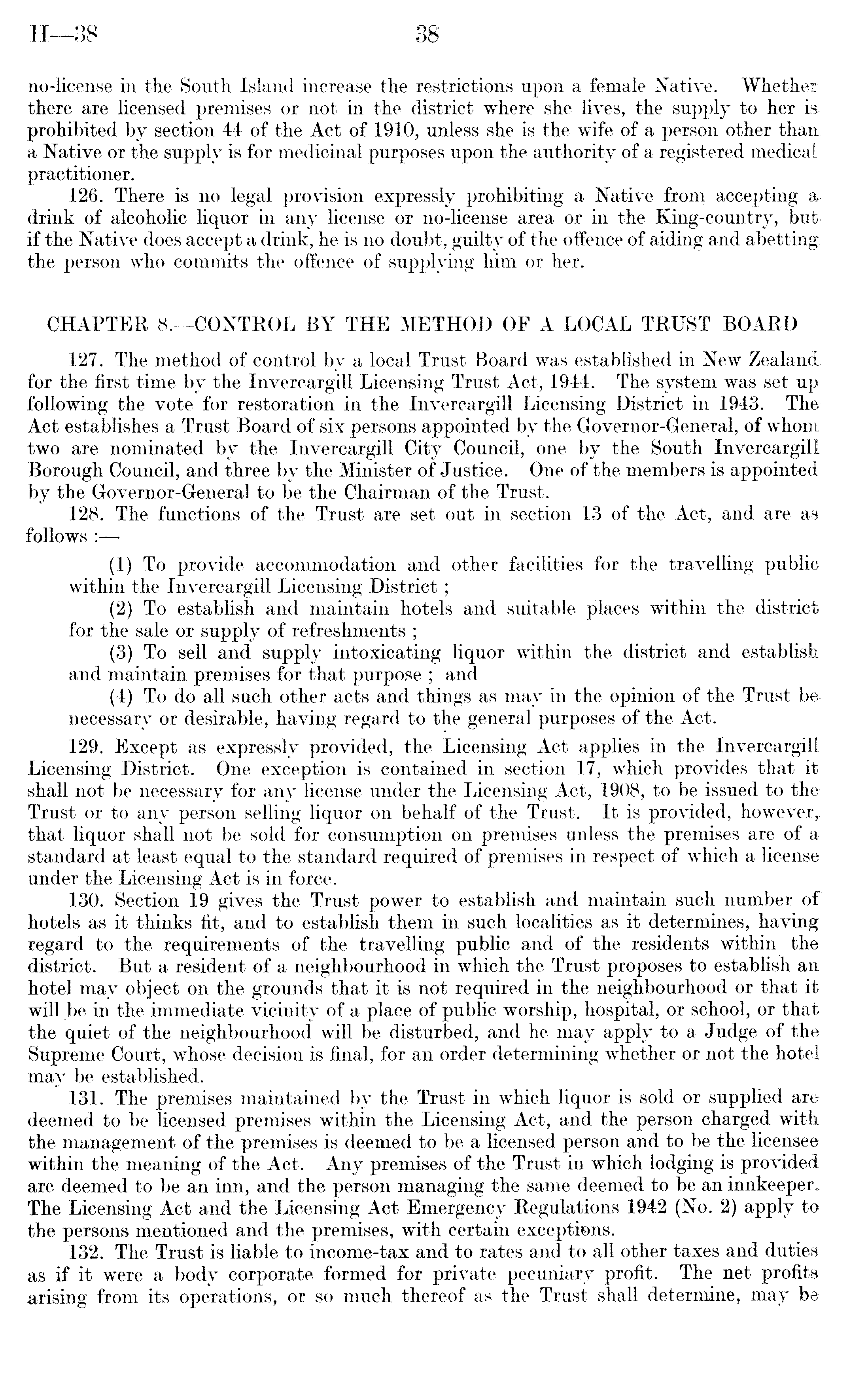 no-license in the South Island increase the restrictions upon a female Native. Whether there are licensed premises or not in the district where she lives, the supply to her isprohibited by section 44 of the Act of 1910, unless she is the wife of a person other than a Native or the supply is for medicinal purposes upon the authority of a registered medical practitioner. 126. There is no legal provision expressly prohibiting a Native from accepting a drink of alcoholic liquor in any license or no-license area or in the King-country, butif the Native does accept a drink, he is no doubt, guilty of the offence of aiding and abetting the person who commits the offence of supplying him or her. CHAPTER B.—CONTROL BY THE METHOD OF A LOCAL TRUST BOARD 127. The method of control by a local Trust Board was established in New Zealand for the first time by the Invercargill Licen-sing Trust Act, 1944. The system was set up following the vote for restoration in the Invercargill Licensing District in 1943. The Act establishes a Trust Board of six persons appointed by the Governor-General, of whom two are nominated by the Invercargill City Council, one by the South Invercargill Borough Council, and three by the Minister of Justice. One of the members is appointed by the Governor-General to be the Chairman of the Trust. 128. The functions of the Trust are set out in section 13 of the Act, and are as follows : (1) To provide accommodation and other facilities for the travelling public within the Invercargill Licensing District; (2) To establish and maintain hotels and suitable places within the district for the sale or supply of refreshments ; (3) To sell and supply intoxicating liquor within the district and establish and maintain premises for that purpose ; and (4) To do all such other acts and things as may in the opinion of the Trust benecessary or desirable, having regard to the general purposes of the Act. 129. Except as expressly provided, the Licensing Act applies in the Invercargill Licensing District. One exception is contained in section 17, which provides that it shall not be necessary for any license under the Licensing Act, 1908, to be issued to the Trust or to any person selling liquor on behalf of the Trust. It is provided, however,, that liquor shall not be sold for consumption on premises unless the premises are of a standard at least equal to the standard required of premises in respect of which a license under the Licensing Act is in force. 130. Section 19 gives the Trust power to establish and maintain such number of hotels as it thinks fit, and to establish them in such localities as it determines, having regard to the requirements of the travelling public and of the residents within the district. But a resident of a neighbourhood in which the Trust proposes to establish an hotel may object on the grounds that it is not required in the neighbourhood or that it will be in the immediate vicinity of a place of public worship, hospital, or school, or that the quiet of the neighbourhood will be disturbed, and he may apply to a Judge of the Supreme Court, whose decision is final, for an order determining whether or not the hotel may be established. 131. The premises maintained by the Trust in which liquor is sold or supplied are deemed to be licensed premises within the Licensing Act, and the person charged with the management of the premises is deemed to be a licensed person and to be the licensee within the meaning of the Act. Any premises of the Trust in which lodging is provided are deemed to be an inn, and the person managing the same deemed to be an innkeeper. The Licensing Act and the Licensing Act Emergency Regulations 1942 (No. 2) apply to the persons mentioned and the premises, with certain exceptions. 132. The Trust is liable to income-tax and to rates and to all other taxes and duties as if it were a body corporate formed for private pecuniary profit. The net profits arising from its operations, or so much thereof as the Trust shall determine, may be