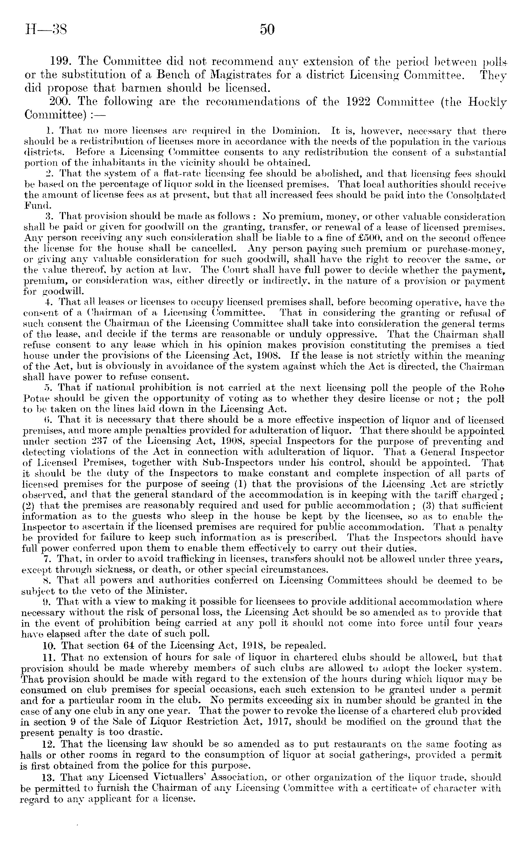 199. The Committee did not recommend any extension of the period between polls or the substitution of a Bench of Magistrates for a district Licensing Committee. They did propose that barmen should be licensed. 200. The following are the recommendations of the 1922 Committee (the Hockly Committee) : 1. That no more licenses are required in the Dominion. It is, however, necessary that there should be a redistribution of licenses more in accordance with the needs of the population in the various districts. Before a Licensing Committee consents to any redistribution the consent of a substantial portion of the inhabitants in the vicinity should be obtained. 2. That the system of a flat-rate licensing fee should be abolished, and that licensing fees should be based on the percentage of liquor sold in the licensed premises. That local authorities should receive the amount of license fees as at present, but that all increased fees should be paid into the Consolidated Fund. 3. That provision should be made as follows : No premium, money, or other valuable consideration shall be paid or given for goodwill on the granting, transfer, or renewal of a lease of licensed premises. Any person receiving any such consideration shall be liable to a fine of £5OO, and on the second offence the license for the house shall be cancelled. Any person paying such premium or purchase-money, or giving any valuable consideration for such goodwill, shall have the right to recover the same, or the value thereof, by action at law. The Court shall have full power to decide whether the payment, premium, or consideration was, either directly or indirectly, in the nature of a provision or payment fot goodwill. 4. That all leases or licenses to occupy licensed premises shall, before becoming operative, have the consent of a Chairman of a Licensing Committee. That in considering the granting or refusal of such consent the Chairman of the Licensing Committee shall take into consideration the general terms of the lease, and decide if the terms are reasonable or unduly oppressive. That the Chairman shall refuse consent to any lease which in his opinion makes provision constituting the premises a tied house under the provisions of the Licensing Act, 1908. If the lease is not strictly within the meaning of the Act, but is obviously in avoidance of the system against which the Act is directed, the Chairman shall have power to refuse consent. 5. That if national prohibition is not carried at the next licensing poll the people of the Rohe Potae should be given the opportunity of voting as to whether they desire license or not; the poll to be taken on the lines laid down in the Licensing Act. 6. That it is necessary that there should be a more effective inspection of liquor and of licensed premises, and more ample penalties provided for adulteration of liquor. That there should be appointed under section 237 of the Licensing Act, 1908, special Inspectors for the purpose of preventing and detecting violations of the Act in connection with adulteration of liquor. That a General Inspector of Licensed Premises, together with Sub-Inspectors under his control, should be appointed. That it should be the duty of the Inspectors to make constant and complete inspection of all parts of licensed premises for the purpose of seeing (1) that the provisions of the Licensing Act are strictly observed, and that the general standard of the accommodation is in keeping with the tariff charged; (2) that the premises are reasonably required and used for public accommodation ; (3) that sufficient information as to the guests who sleep in the house be kept by the licensee, so as to enable the Inspector to ascertain if the licensed premises are required for public accommodation. That a penalty be provided for failure to keep such information as is prescribed. That the Inspectors should have full power conferred upon them to enable them effectively to carry out their duties. 7. That, in order to avoid trafficking in licenses, transfers should not be allowed under three years, except through sickness, or death, or other special circumstances. 8. That all powers and authorities conferred on Licensing Committees should be deemed to be subject to the veto of the Minister. 9. That with a view to making it possible for licensees to provide additional accommodation where necessary without the risk of personal loss, the Licensing Act should be so amended as to provide that in the event of prohibition being carried at any poll it should not come into force until four years have elapsed after the date of such poll. 10. That section 64 of the Licensing Act, 1918, be repealed. 11. That no extension of hours for sale of liquor in chartered clubs should be allowed, but that provision should be made whereby members of such clubs are allowed to adopt the locker system. That provision should be made with regard to the extension of the hours during which liquor may be consumed on club premises for special occasions, each such extension to be granted under a permit and for a particular room in the club. No permits exceeding six in number should be granted in the case of any one club in any one year. That the power to revoke the license of a chartered club provided in section 9 of the Sale of Liquor Restriction Act, 1917, should be modified on the ground that the present penalty is too drastic. 12. That the licensing law should be ao amended as to put restaurants on the same footing as halls or other rooms in regard to the consumption of liquor at social gatherings, provided a permit is first obtained from the police for this purpose. 13. That any Licensed Victuallers' Association, or other organization of the liquor trade, should be permitted to furnish the Chairman of any Licensing Committee with a certificate of character with regard to any applicant for a license.