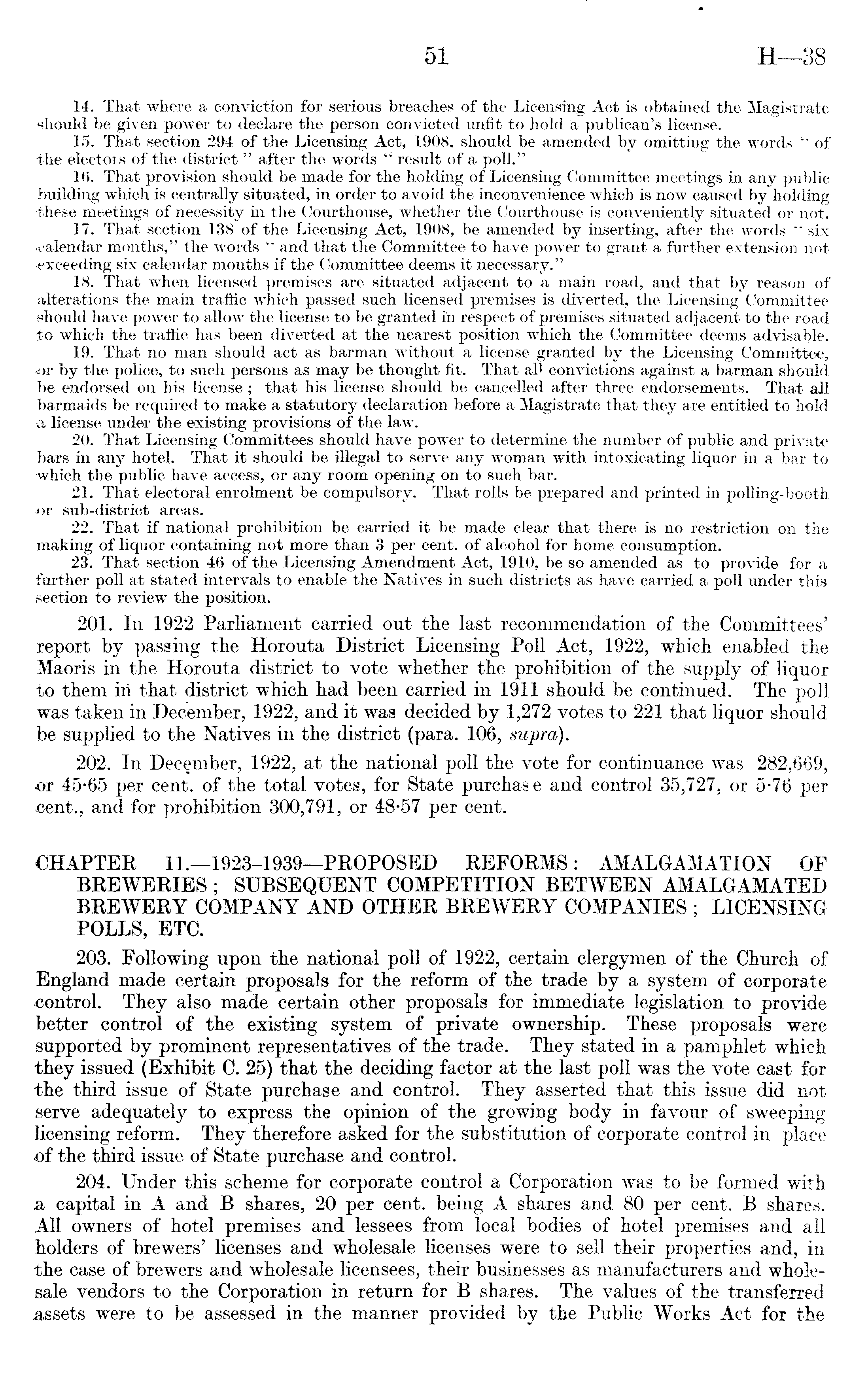 14. That where a conviction for serious breaches of the Licensing Act is obtained the Magistrate should be given power to declare the person convicted unfit to hold a publican's license. 15. That section 294 of the Licencing Act, 1908, should be amended by omitting the words " of the electors of the district " after the words " result of a poll." 16. That provision should be made for the holding of Licensing Committee meetings in any public building which is centrally situated, in order to avoid the inconvenience which is now caused by holding these meetings of necessity in the Courthouse, whether the Courthouse is conveniently situated or not. 17. That section 138 of the Licensing Act, 1908, be amended by inserting, after the words " six ■calendar months," the words " and that the Committee to have power to grant a further extension not exceeding six calendar months if the Committee deems it necessary." 18. That when licensed premises are situated adjacent to a main road, and that by reason of alterations the mam traffic which passed such licensed premises is diverted, the Licensing Committee should have power to allow the license to be granted in respect of premises situated adjacent to the road to which the traffic has been diverted at-the nearest position which the Committee deems advisable. 19. That no man should act as barman without a license granted by the Licensing Committee, «or by the police, to such persons as may be thought fit. That all convictions against a barman should be endorsed on his license; that his license should be cancelled after three endorsements. That all barmaids be required to make a statutory declaration before a Magistrate that they are entitled to hold a license under the existing provisions of the law. 20. That Licensing Committees should have power to determine the number of public and private bars in any hotel. That it should be illegal to serve any woman with intoxicating liquor in a bar to which the public have access, or any room opening on to such bar. 21. That electoral enrolment be compulsory. That rolls be prepared and printed in polling-booth or sub-district areas. 22. That if national prohibition be carried it be made clear that there is no restriction on the making of liquor containing not more than 3 per cent, of alcohol for home consumption. 23. That section 46 of the Licensing Amendment Act, 1910, be so amended as to provide for a further poll at stated intervals to enable the Natives in such districts as have carried a poll under this section to review the position. 201. In 1922 Parliament carried out the last recommendation of tlie Committees' report by passing the Horouta District Licensing Poll Act, 1922, which enabled the Maoris in the Horouta district to vote whether the prohibition of the supply of liquor to them in that district which had been carried in 1911 should be continued. The poll was taken in December, 1922, and it waa decided by 1,272 votes to 221 that liquor should be supplied to the Natives in the district (para. 106, supra). 202. In December, 1922, at the national poll the vote for continuance was 282,669, or 45-65 per cent, of the total votes, for State purchase and control 35,727, or 5-76 per cent., and for prohibition 300,791, or 48-57 per cent. CHAPTER 11.—1923-1939—PROPOSED REFORMS: AMALGAMATION OF BREWERIES ; SUBSEQUENT COMPETITION BETWEEN AMALGAMATED BREWERY COMPANY AND OTHER BREWERY COMPANIES ; LICENSING POLLS, ETC. 203. Following upon the national poll of 1922, certain clergymen of the Church of England made certain proposals for the reform of the trade by a system of corporate control. They also made certain other proposals for immediate legislation to provide better control of the existing system of private ownership. These proposals were supported by prominent representatives of the trade. They stated in a pamphlet which they issued (Exhibit C. 25) that the deciding factor at the last poll was the vote cast for the third issue of State purchase and control. They asserted that this issue did not serve adequately to express the opinion of the growing body in favour of sweeping licensing reform. They therefore asked for the substitution of corporate control in place of the third issue of State purchase and control. 204. Under this scheme for corporate control a Corporation was to be formed with a capital in A and B shares, 20 per cent, being A shares and 80 per cent. B shares. All owners of hotel premises and lessees from local bodies of hotel premises and all holders of brewers' licenses and wholesale licenses were to sell their properties and, in the case of brewers and wholesale licensees, their businesses as manufacturers and wholesale vendors to the Corporation in return for B shares. The values of the transferred assets were to be assessed in the manner provided by the Public Works Act for the