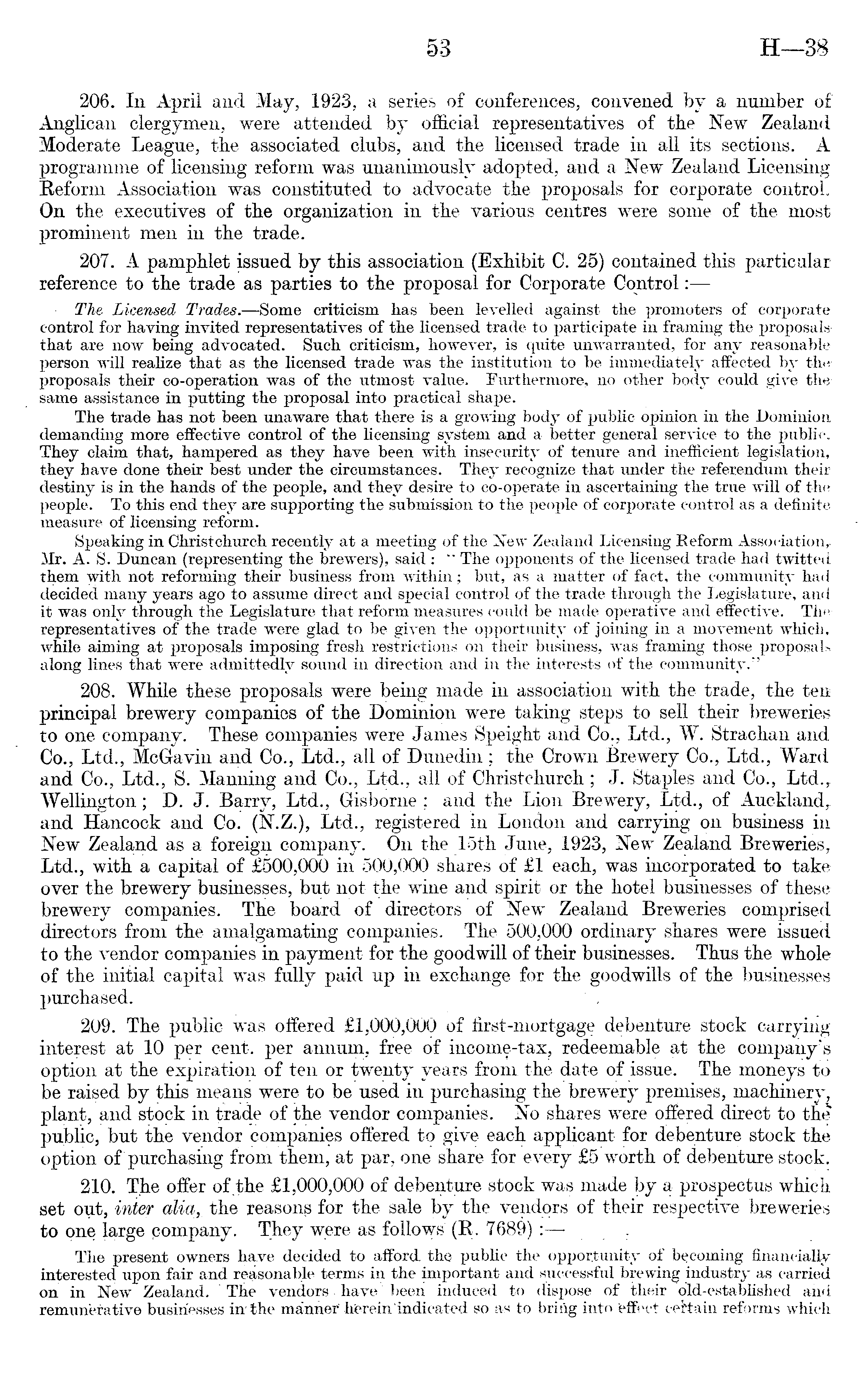 206. In April and May, 1923, a series of conferences, convened by a number of Anglican clergymen, were attended by official representatives of the New Zealand Moderate League, the associated clubs, and tlie licensed trade in all its sections. A programme of licensing reform was unanimously adopted, and a New Zealand Licensing Reform Association was constituted to advocate the proposals for corporate control. On the executives of the organization in the various centres were some of the most prominent men in the trade. 207. A pamphlet issued by this association (Exhibit C. 25) contained this particular reference to the trade as parties to the proposal for Corporate Control: — The Licensed Trades. —Some criticism has been levelled against the promoters of corporate control for having invited representatives of the licensed trade to participate in framing the proposalsthat are now being advocated. Such criticism, however, is quite unwarranted, for any reasonable person will realize that as the licensed trade was the institution to be immediately affected by the proposals their co-operation was of the utmost value. Furthermore, no other body could give the same assistance in putting the proposal into practical shape. The trade has not been unaware that there is a growing body of public opinion in the Dominion demanding more effective control of the licensing system and a better general service to the public. They claim that, hampered as they have been with insecurity of tenure and inefficient legislation, they have done their best under the circumstances. They recognize that under the referendum their destiny is in the hands of the people, and they desire to co-operate in ascertaining the true will of the people. To this end they are supporting the submission to the people of corporate control as a definite measure of licensing reform. Speaking in Christchurch recently at a meeting of the New Zealand Licensing Reform Association,. Mr. A. S. Duncan (representing the brewers), said : " The opponents of the licensed trade had twitted them with not reforming their business from within; but, as a matter of fact, the community had decided many years ago to assume direct and special control of the trade through the Legislature, and it was only through the Legislature that reform measures could be made operative and effective. The representatives of the trade were glad to be given the opportunity of joining in a movement which, while aiming at proposals imposing fresh restrictions on their business, was framing those proposals: along lines that were admittedly sound in direction and in the interests of the community." 208. While" these proposals were being made in association with the trade, the ten principal brewery companies of the Dominion were taking steps to sell their breweries to one company. These companies were James Speight and Co., Ltd., W. Strachan and Co., Ltd., McGravin and Co., Ltd., all of Dunedin; the Crown Brewery Co., Ltd., Ward and Co., Ltd., S. Manning and Co., Ltd., all of Christchurch; J. Staples and Co., Ltd., Wellington ; D. J. Barry, Ltd., Gisborne ; and the Lion Brewery, Ltd., of Auckland,, and Hancock and Co. (N.Z.), Ltd., registered in London and carrying on business in New Zealand as a foreign company. On the 15th June, 1923, New Zealand Breweries, Ltd., with a capital of'£soo,ooo in 500,000 shares of £1 each, was incorporated to take over the brewery businesses, but not the wine and spirit or the hotel businesses of these brewery companies. The board of directors of New Zealand Breweries comprised directors from the amalgamating companies. The 500,000 ordinary shares were issued to the vendor companies in payment for the goodwill of their businesses. Thus the whole of the initial capital was fully paid up in exchange for the goodwills of the businesses purchased. 209. The public was offered £1,000,000 of first-mortgage debenture stock carrying interest at 10 per cent, per annum, free of income-tax, redeemable at the company's option at the expiration of ten or twenty years from, the date of issue. The moneys to be raised by this means were to be used in purchasing the brewery premises, machinery, plant, and stock in trade of the vendor companies. No shares were offered direct to the public, but the vendor companies offered to give each applicant for debenture stock the option of purchasing from them, at par, one share for every £5 worth of debenture stock. 210. The offer of the £1,000,000 of debenture stock was made by a prospectus which set out, inter alia,, the reasons for the sale by the vendors of their respective breweries to one large company. They were as follows (R. 7689): — The present owners have decided to afford the public the opportunity of becoming financially interested upon fair and reasonable terms in the important and successful brewing industry as carried on in New Zealand. The vendors have been induced to dispose of their old-established and remunerative businesses in* the manner herein'indicated so as to brifig into effect certain reforms which