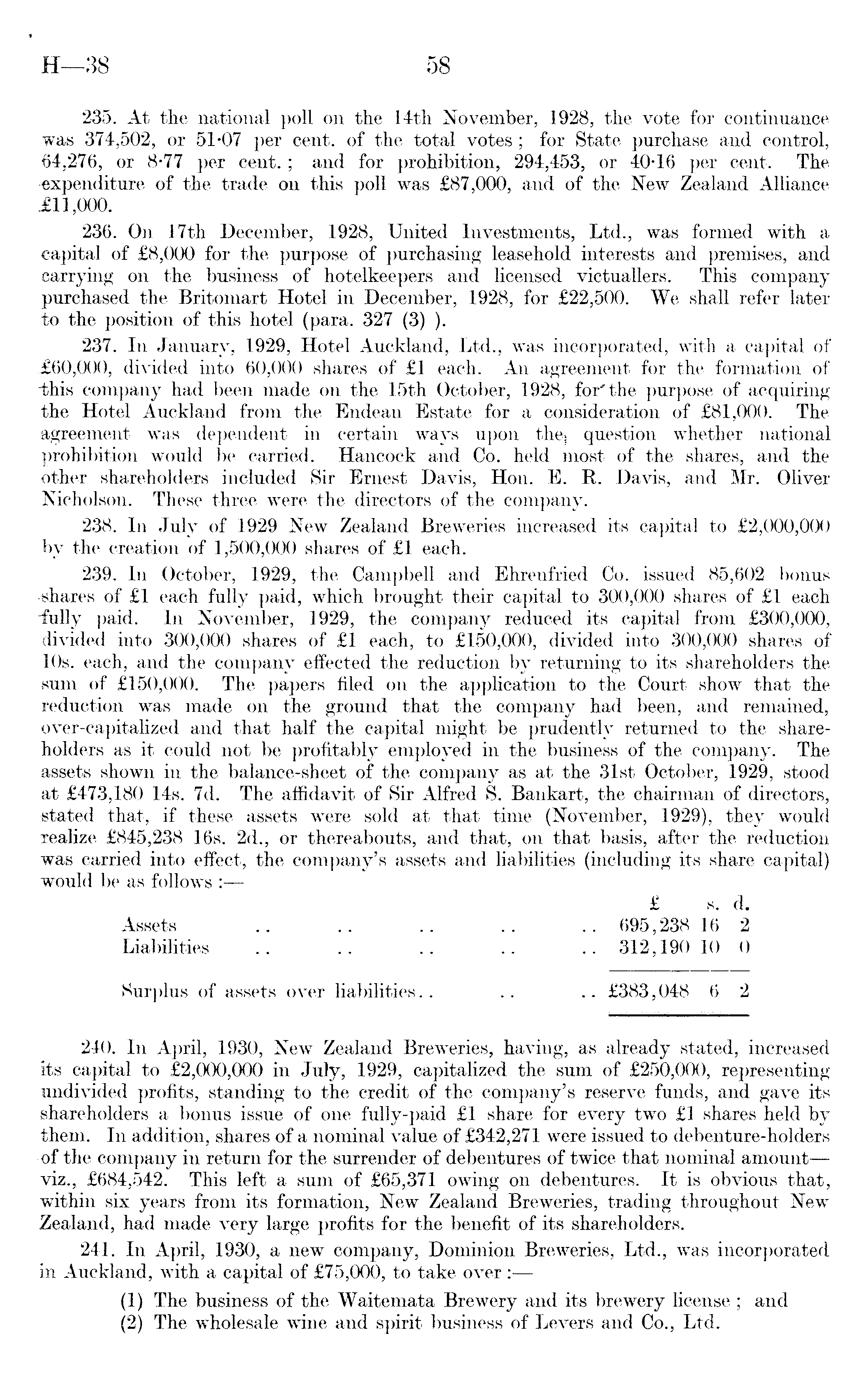 235. At the national poll on the 14th November, 1928, the vote for continuance was 374,502, or 51-07 per cent, of the total votes ; for State purchase and control, 64,276, or 8*77 per cent.; and for prohibition, 294,453, or 40-16 per cent. The expenditure of the trade on this poll was £87,000, and of the New Zealand Alliance 111,000. 236. On 17th December, 1928, United Investments, Ltd., was formed with a capital of £B,OOO for the purpose of purchasing leasehold interests and premises, and -carrying on the business of hotelkeepers and licensed victuallers. This company purchased the Britomart Hotel in December, 1928, for £22,500. We shall refer later to the position of this hotel (para. 327 (3) ). 237. In January, 1929, Hotel Auckland, Ltd., was incorporated, with a capital of £60,000, divided into 60,000 shares of £1 each. An agreement for the formation of •this company had been made on the 15th October, 1928, for'the purpose of acquiring the Hotel Auckland from the Endean Estate for a consideration of £Bl,OOO. The agreement was dependent in certain ways upon the s question whether national prohibition would be carried. Hancock and Co. held most of the shares, and the other shareholders included Sir Ernest Davis, Hon. E. R. Davis, and Mr. Oliver Nicholson. These three were the directors of the company. 238. In July of 1929 New Zealand Breweries increased its capital to £2,000,000 by the creation of 1,500,000 shares of £1 each. 239. In October, 1929, the Campbell and Ehrenfried Co. issued 85,602 bonus shares of £1 each fully paid, which brought their capital to 300,000 shares of £1 each fully paid. In November, 1929, the company reduced its capital from £300,000, divided into 300,000 shares of £1 each, to £150,000, divided into 300,000 shares of 10s. each, and the company effected the reduction by returning to its shareholders the sum of £150,000. The papers filed on the application to the Court show that the reduction was made on the ground that the company had been, and remained, •over-capitalized and that half the capital might be prudently returned to the shareholders as it could not be profitably employed in the business of the company. The .assets shown in the balance-sheet of the company as at the 31st October, 1929, stood .at £473,180 14s. 7d. The affidavit of Sir Alfred S. Bankart, the chairman of directors, stated that, if these assets were sold at that time (November, 1929), they would xealize £845,238 16s. 2d., or thereabouts, and that, on that basis, after the reduction vras carried into effect, the company's assets and liabilities (including its share capital) be as follows : £ s. d. Assets .. .. .. .. .. 695,238 16 2 Liabilities .. .. .. .. .. 312,190 10 0 Surplus of assets over liabilities.. .. .. £383,048 6 2 240. In April, 1930, New Zealand Breweries, having, as already stated, increased its capital to £2,000,000 in July, 1929, capitalized the sum of £250,000, representing undivided profits, standing to the credit of the company's reserve funds, and gave its shareholders a bonus issue of one fully-paid £1 share for every two £1 shares held by them. In addition, shares of a nominal value of £342,271 were issued to debenture-holders of the company in return for the surrender of debentures of twice that nominal amount — viz., £684,542. This left a sum of £65,371 owing on debentures. It is obvious that, within six years from its formation, New Zealand Breweries, trading throughout New Zealand, had made very large profits for the benefit of its shareholders. 241. In April, 1930, a new company, Dominion Breweries, Ltd., was incorporated in Auckland, with a capital of £75,000, to take over : (1) The business of the Waitemata Brewery and its brewery license ; and (2) The wholesale wine and spirit business of Levers and Co.", Ltd.
