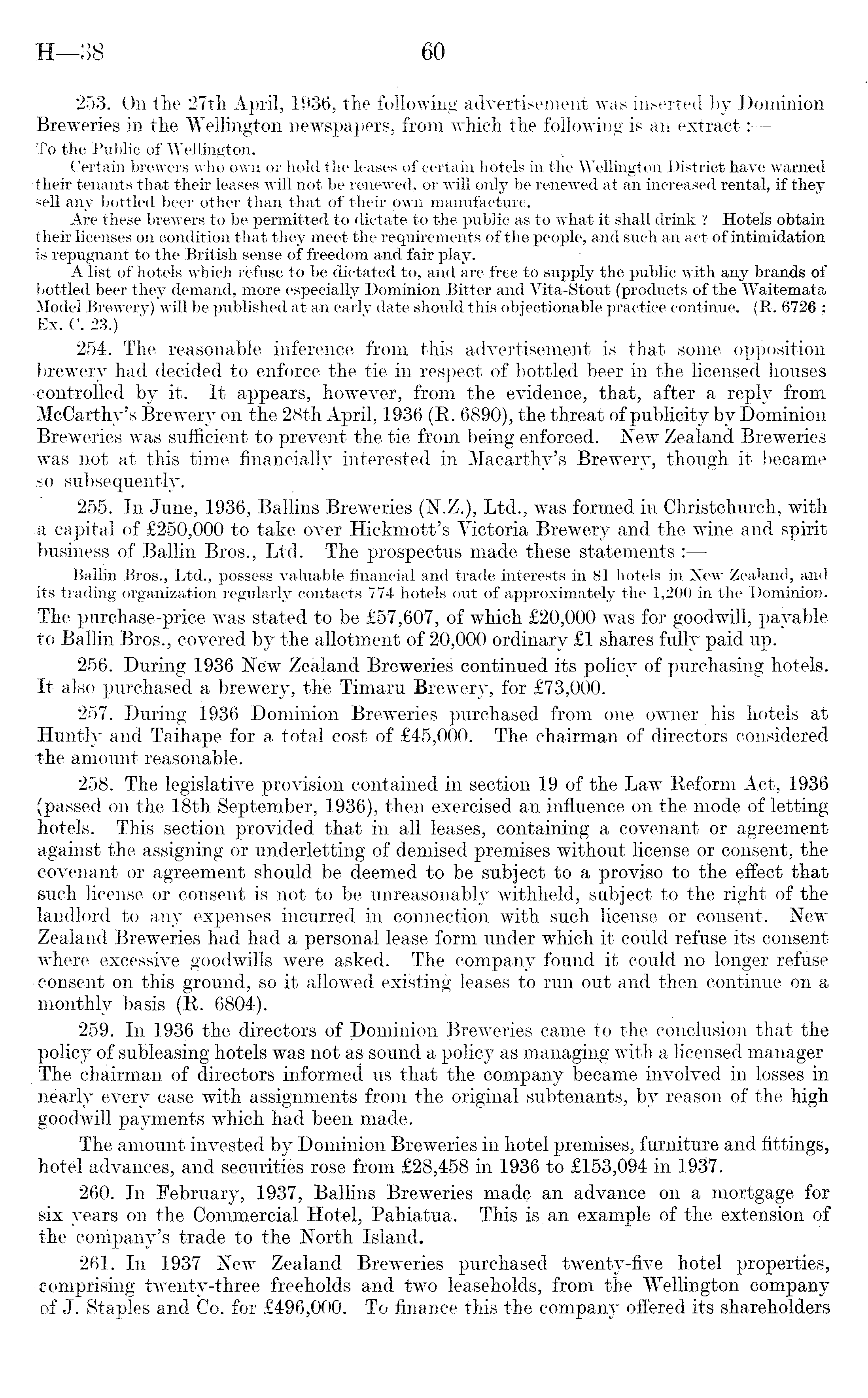 253. On the 27th April, 1936, the following advertisement was inserted by Dominion Breweries in the Wellington newspapers, from which the following is an extract: — To the Public of Wellington. Certain brewers who own or hold the leases of certain hotels in the Wellington District have warned their tenants that their leases will not be renewed, or will only be renewed at an increased rental, if they sell any bottled beer other than that of their own manufacture. Are these brewers to be permitted to dictate to the public as to what it shall drink ? Hotels obtain their licenses on condition that they meet the requirements of the people, and such an act of intimidation is repugnant to the British sense of freedom and fair play. A list of hotels which refuse to be dictated to, and are free to supply the public with any brands of bottled beer they demand, more especially Dominion Bitter and Vita-Stout (products of the Waitemata Model Brewery) will be published at an early date should this objectionable practice continue. (R. 6726 ; Ex. C. 23.) 254. The reasonable inference from this advertisement is that some opposition brewery had decided to enforce the tie in respect of bottled beer in the licensed houses •controlled by it. It appears, however, from the evidence, that, after a reply from McCarthy's Brewery on the 28th April, 1936 (R. 6890), the threat of publicity by Dominion Breweries was sufficient to prevent the tie from being enforced. New Zealand Breweries -was not at this time financially interested in Macarthy's Brewery, though it became so subsequently. 255. In June, 1936, Ballins Breweries (N.Z.), Ltd., was formed in Christchurch, with a capital of £250,000 to take over Hickmott's Victoria Brewery and the wine and spirit business of Ballin Bros., Ltd. The prospectus made these statements : Ballin Bros., Ltd., possess valuable financial and trade interests in 81 hotels in New Zealand, and its trading organization regularly contacts 774 hotels out of approximately the 1,200 in the Dominion. The purchase-price was stated to be £57,607, of which £20,000 was for goodwill, payable to Ballin Bros., covered by the allotment of 20,000 ordinary £1 shares fully paid up. 256. During 1936 New Zealand Breweries continued its policy of purchasing hotels. It also purchased a brewery, the Timaru Brewery, for £73,000. 257. During 1936 Dominion Breweries purchased from one owner his hotels at Huntly and Taihape for a total cost of £45,000. The chairman of directors considered the amount reasonable. 258. The legislative provision contained in section 19 of the Law Reform Act, 1936 (passed on the 18th September, 1936), then exercised an influence on the mode of letting hotels. This section provided that in all leases, containing a covenant or agreement .against the assigning or underletting of demised premises without license or consent, the covenant or agreement should be deemed to be subject to a proviso to the effect that such license or consent is not to be unreasonably withheld, subject to the right of the landlord to any expenses incurred in connection with such license or consent. New Zealand Breweries had had a personal lease form under which it could refuse its consent where excessive goodwills were asked. The company found it could no longer refuse •consent on this ground, so it allowed existing leases to run out and then continue on a monthly basis (R. 6804). 259. In 1936 the directors of Dominion Breweries came to the conclusion that the policy of subleasing hotels was not as sound a policy as managing with a licensed manager The chairman of directors informed us that the company became involved in losses in nearly every case with assignments from the original subtenants, by reason of the high goodwill payments which had been made. The amount invested by Dominion Breweries in hotel premises, furniture and fittings, hotel advances, and securities rose from £28,458 in 1936 to £153,094 in 1937. 260. In February, 1937, Ballins Breweries made an advance on a mortgage for six years on the Commercial Hotel, Pahiatua. This is an example of the extension of the company's trade to the North Island. 261. In 1937 New Zealand Breweries purchased twenty-five hotel properties, • comprising twenty-three freeholds and two leaseholds, from the Wellington company of J. Staples and Co. for £496,000. To finance this the company offered its shareholders