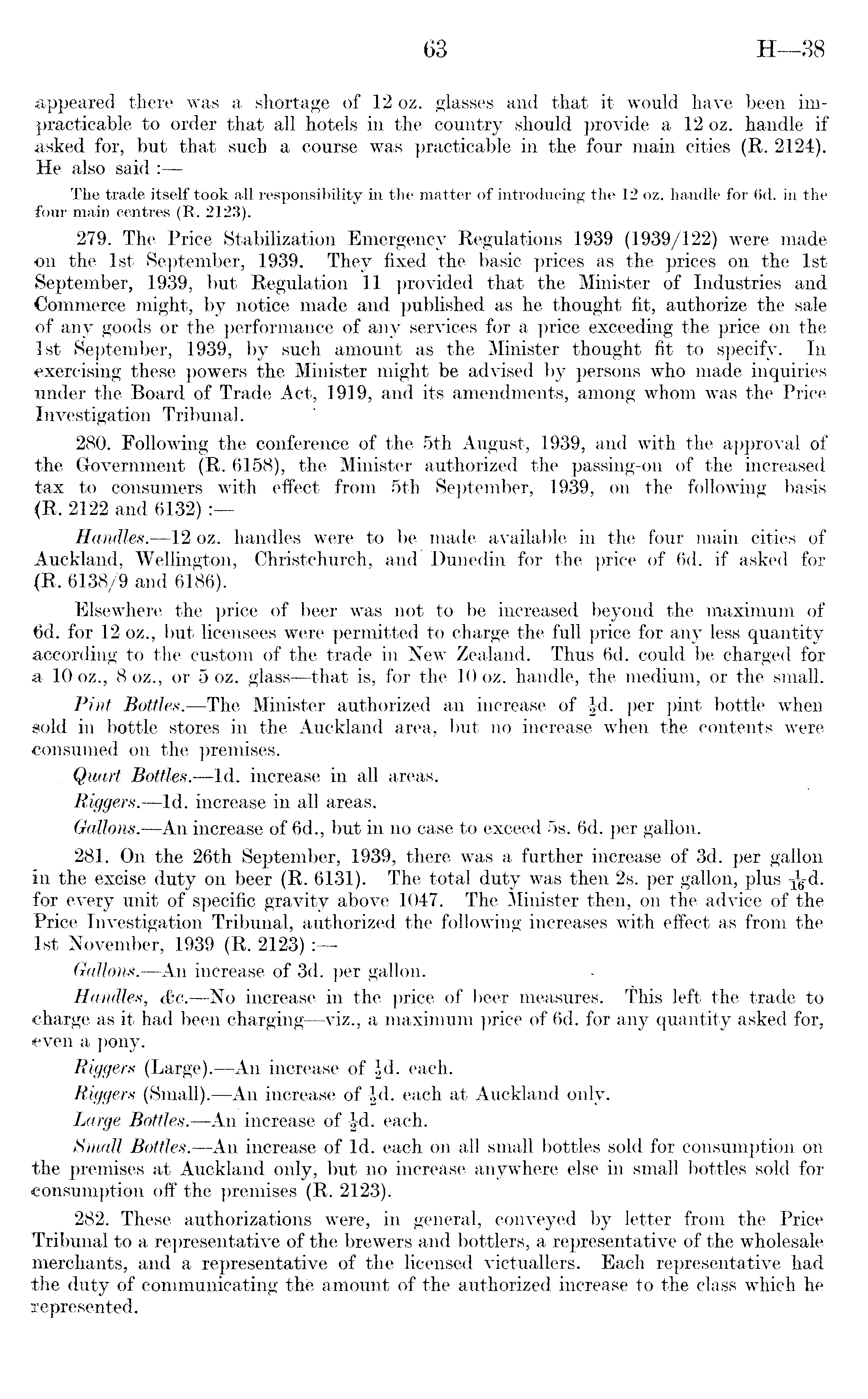 appeared there was a shortage of 12 oz. glasses and that it would have been impracticable to order that all hotels in the country should provide a 12 oz. handle if asked for, but that such a course was practicable in the four main cities (R. 2124). He also said : The trade itself took all responsibility in the matter of introducing the 12 oz. handle for 6d. in the four main centres (R. 2123). 279. The Price Stabilization Emergency Regulations 1939 (1939/122) were made on the Ist September, 1939. They fixed the basic prices as the prices on the Ist September, 1939, but Regulation 11 provided that the Minister of Industries and Commerce might, by notice made and published as he thought fit, authorize the sale of any goods or the performance of any services for a price exceeding the price on the Ist September, 1939, by such amount as the Minister thought fit to specify. In exercising these powers' the Minister might be advised by persons who made inquiries under the Board of Trade Act, 1919, and its amendments, among whom was the Price Investigation Tribunal. 280. Following the conference of the sth August, 1939, and with the approval of the Government (R. 6158), the Minister authorized the passing-oil of the increased tax to consumers with effect from sth September, 1939, on the following basis <R. 2122 and 6132) Handles. —12 oz. handles were to be made available in the four main cities of Auckland, Wellington, Christchurch, and" Dunedin for the price of 6d. if asked for (R. 6138/9 and 6186). Elsewhere the price of beer was not to be increased beyond the maximum of 6d. for 12 oz., but licensees were permitted to charge the full price for any less quantity according to the custom of the trade in New Zealand. Thus 6d. could be charged for a 10 oz., 8 oz., or 5 oz. glass—that is, for the 10 oz. handle, the medium, or the small. Pint Bottles.—The Minister authorized an increase of Jd. per pint bottle when sold in bottle stores in the Auckland area, but no increase when the contents were consumed on the premises. Quart Bottles.—ld. increase in all areas. Riggers.—ld. increase in all areas. Gallons.—An increase of 6d., but in no case to exceed ss. 6d. per gallon. 281. On the 26th September, 1939, there was a further increase of 3d. per gallon in the excise duty on beer (R. 6131). The total duty was then 2s. per gallon, plus for every unit of specific gravity above 1047. The Minister then, on the advice of the Price Investigation Tribunal, authorized the following increases with effect as from the Ist November, 1939 (R. 2123) Gallons.—An increase of 3d. per gallon. Handles, &c. —No increase in the price of beer measures. This left the trade to charge as it had been charging —viz., a maximum price of 6d. for any quantity asked for, even a pony. Riggers (Large).—An increase of |d. each. Riggers (Small). —An increase of |d. each at Auckland only. Large Bottles.—An increase of |-d. each. Small Bottles. —An increase of Id. each on all small bottles sold for consumption on the premises at Auckland only, but no increase anywhere else in small bottles sold for consumption off the premises (R. 2123). 282. These authorizations were, in general, conveyed by letter from the Price Tribunal to a representative of the brewers and bottlers, a representative of the wholesale merchants, and a representative of the licensed victuallers. Each representative had the duty of communicating the amount of the authorized increase to the class which he represented.