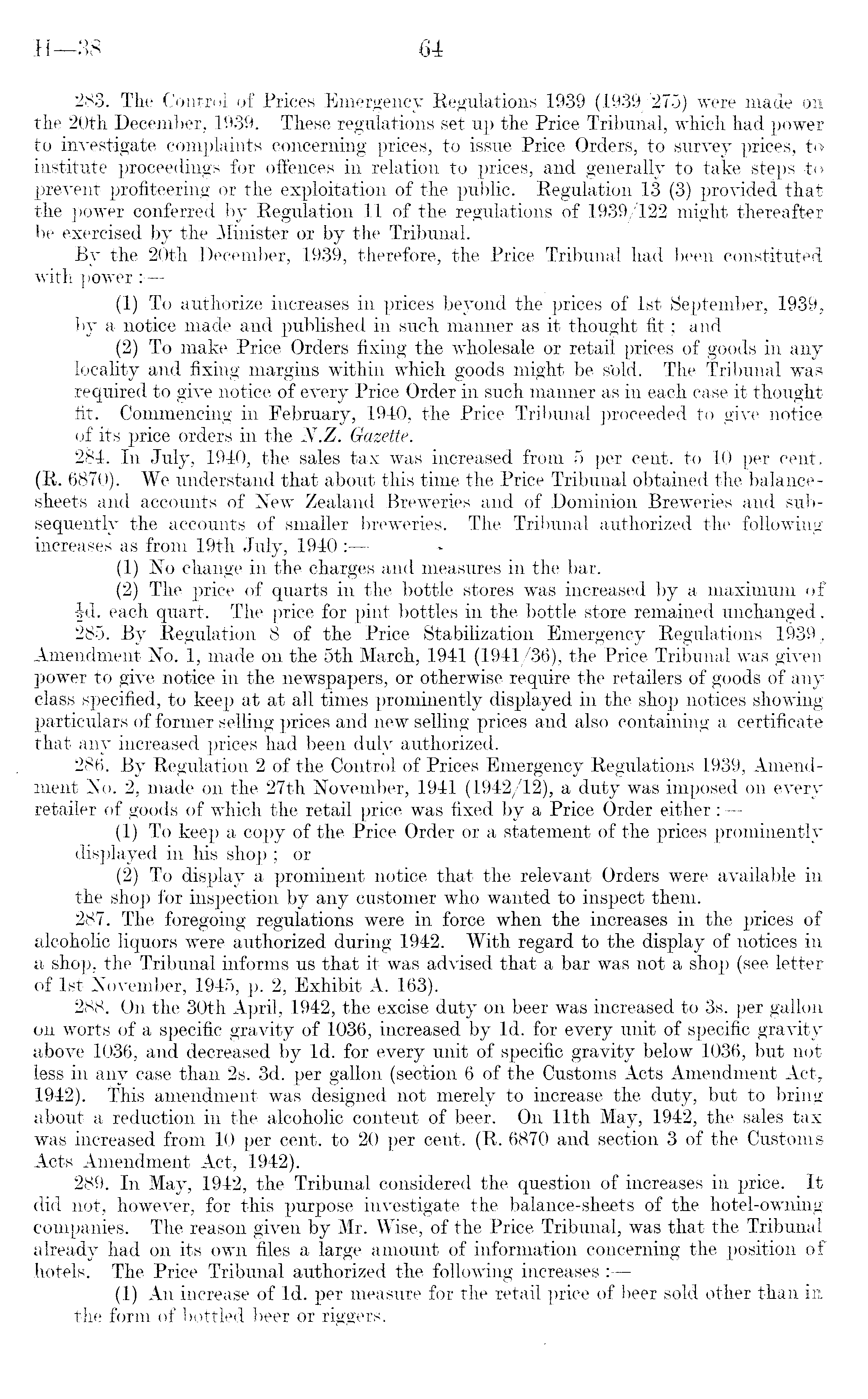 283. The Control of Prices Emergency Regulations 1939 (1939/275) were made on the 20th December, 1939. These regulations set up the Price Tribunal, which had power to investigate complaints concerning prices, to issue Price Orders, to survey prices, to institute proceedings for offences in relation to prices, and generally to take steps to prevent profiteering or the exploitation of the public. Regulation 13 (3) provided that the power conferred by Regulation 11 of the regulations of 1939/122 might thereafter be exercised by the Minister or by the Tribunal. By the 20th December, 1939, therefore, the Price Tribunal had been constituted with power: — (1) To authorize increases in prices beyond the prices of Ist September, 1939, by a notice made and published in such manner as it thought fit; and (2) To make Price Orders fixing the wholesale or retail prices of goods in any locality and fixing margins within which goods might be s'old. The Tribunal was required to give notice of every Price Order in such manner.as in each case it thought fit. Commencing in February, 1940, the Price Tribunal proceeded to give notice of its price orders in the N.Z. Gazette. 284. In July, 1940, the sales tax was increased from 5 per cent, to 10 per cent. (R. 6870). We understand that about this time the Price Tribunal obtained the balancesheets and accounts of New Zealand Breweries and of Dominion Breweries and subsequently the accounts of smaller breweries. The Tribunal authorized the following increases as from 19th July, 1940 : (1) No change in the charges and measures in the bar. (2) The price of quarts in the bottle stores was increased by a maximum of -|d. each quart. The price for pint bottles in the bottle store remained unchanged. 285. By Regulation 8 of the Price Stabilization Emergency Regulations 1939, Amendment No. 1, made on the sth March, 1941 (1941/36), the Price Tribunal was given power to give notice in the newspapers, or otherwise require the retailers of goods of any class specified, to keep at at all times prominently displayed in the shop notices showing particulars of former selling prices and new selling prices and also containing a certificate that any increased prices had been duly authorized. 286. By Regulation 2 of the Control of Prices Emergency Regulations 1939, Amendment No. 2, made on the 27th November, 1941 (1942/12), a duty was imposed on every retailer of goods of which the retail price was fixed by a Price Order either (1) To keep a copy of the Price Order or a statement of the prices prominently displayed in his shop ; or (2) To display a prominent notice that the relevant Orders were available in the shop for inspection by any customer who wanted to inspect them. 287. The foregoing regulations were in force when the increases in the prices of alcoholic liquors were authorized during 1942. With regard to the display of notices in a shop, the Tribunal informs us that it was advised that a bar was not a shop (see letter of Ist November, 1945, p. 2, Exhibit A. 163). 288. On the 30th April, 1942, the excise duty on beer was increased to 3s. per gallon on worts of a specific gravity of 1036, increased by Id. for every unit of specific gravity above 1036, and decreased by Id. for every unit of specific gravity below 1036, but not less in any case than 2s. 3d. per gallon (section 6 of the Customs Acts Amendment Act, 1942). This amendment was designed not merely to increase the duty, but to bring about a reduction in the alcoholic content of beer. On 11th May, 1942, the sales tax was increased from 10 per cent, to 20 per cent. (R. 6870 and section 3 of the Customs Acts Amendment Act, 1942). 289. In May, 1942, the Tribunal considered the question of increases in price. It did not, however, for this purpose investigate the balance-sheets of the hotel-owning companies. The reason given by Mr. Wise, of the Price Tribunal, was that the Tribunal already had on its own files a large amount of information concerning the position of hotels. The Price Tribunal authorized the following increases : (1) An increase of Id. per measure for the retail price of beer sold other than ill the form of bottled beer or riggers.
