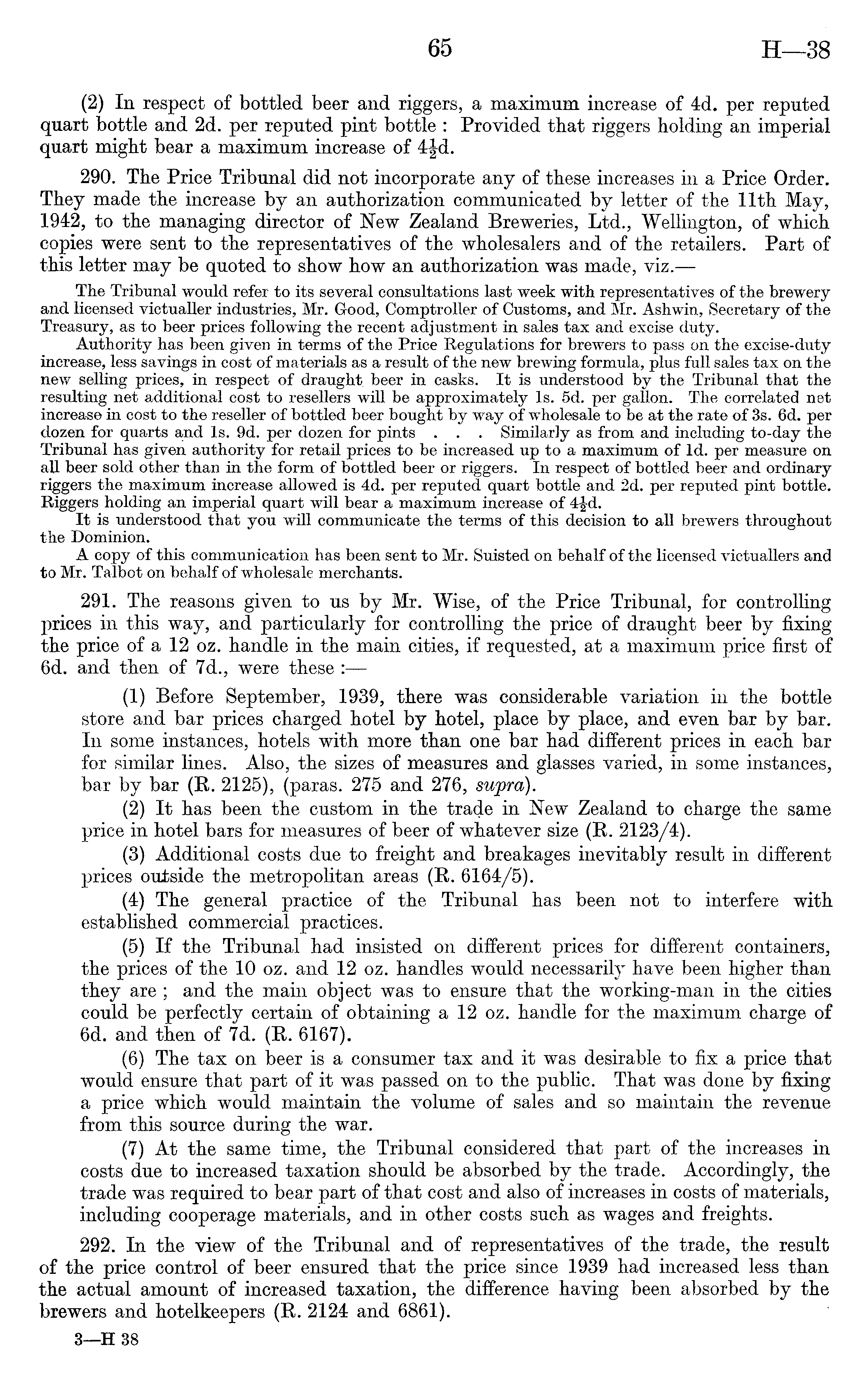 (2) In respect of bottled beer and riggers, a maximum increase of 4d. per reputed quart bottle and 2d. per reputed pint bottle : Provided that riggers holding an imperial quart might bear a maximum increase of 4|d. 290. The Price Tribunal did not incorporate any of these increases in a Price Order. They made the increase by an authorization communicated by letter of the 11th May, 1942, to the managing director of New Zealand Breweries, Ltd., Wellington, of which copies were sent to the representatives of the wholesalers and of the retailers. Part of this letter may be quoted to show how an authorization was made, viz.— The Tribunal would refer to its several consultations last week with representatives of the brewery and licensed victualler industries, Mr. Good, Comptroller of Customs, and Mr. Ashwin, Secretary of the Treasury, as to beer prices following the recent adjustment in sales tax and excise duty. Authority has been given in terms of the Price Regulations for brewers to pass on the excise-duty increase, less savings in cost of materials as a result of the new brewing formula, plus full sales tax on the new selling prices, in respect of draught, beer in casks. It is understood by the Tribunal that the resulting net additional cost to resellers will be approximately Is. sd. per gallon. The correlated net increase in cost to the reseller of bottled beer bought by way of wholesale to be at the rate of 3s. 6d. per dozen for quarts and Is. 9d. per dozen for pints . . . Similarly as from and including to-day the Tribunal has given authority for retail prices to be increased up to a maximum of Id. per measure on all beer sold other than in the form of bottled beer or riggers. In respect of bottled beer and ordinary riggers the maximum increase allowed is 4d. per reputed quart bottle and 2d. per reputed pint bottle. Riggers holding an imperial quart will bear a maximum increase of 4|-d. It is understood that you will communicate the terms of this decision to all brewers throughout the Dominion. A copy of this communication has been sent to Mr. Suisted on behalf of the licensed victuallers and to Mr. Talbot on behalf of wholesale merchants. 291. The reasons given to us by Mr. Wise, of the Price Tribunal, for controlling prices in this way, and particularly for controlling the price of draught beer by fixing the price of a 12 oz. handle in the main cities, if requested, at a maximum price first of 6d. and then of 7d., were these : (1) Before September, 1939, there was considerable variation in the bottle store and bar prices charged hotel by hotel, place by place, and even bar by bar. In some instances, hotels with more than one bar had different prices in each bar for similar lines. Also, the sizes of measures and glasses varied, in some instances, bar by bar (R. 2125), (paras. 275 and 276, supra). (2) It has been the custom in the trade in New Zealand to charge the same price in hotel bars for measures of beer of whatever size (R. 2123/4). (3) Additional costs due to freight and breakages inevitably result in different prices ouiside the metropolitan areas (R. 6164/5). (4) The general practice of the Tribunal has been not to interfere with established commercial practices. (5) If the Tribunal had insisted on different prices for different containers, the prices of the 10 oz. and 12 oz. handles would necessarily have been higher than they are ; and the main object was to ensure that the working-man in the cities could be perfectly certain of obtaining a 12 oz. handle for the maximum charge of 6d. and then of 7d. (R. 6167). (6) The tax on beer is a consumer tax and it was desirable to fix a price that would ensure that part of it was passed on to the public. That was done by fixing a price which would maintain the volume of sales and so maintain the revenue from this source during the war. (7) At the same time, the Tribunal considered that part of the increases in costs due to increased taxation should be absorbed by the trade. Accordingly, the trade was required to bear part of that cost and also of increases in costs of materials, including cooperage materials, and in other costs such as wages and freights. 292. In the view of the Tribunal and of representatives of the trade, the result of the price control of beer ensured that the price since 1939 had increased less than the actual amount of increased taxation, the difference having been absorbed by the brewers and hotelkeepers (R. 2124 and 6861).