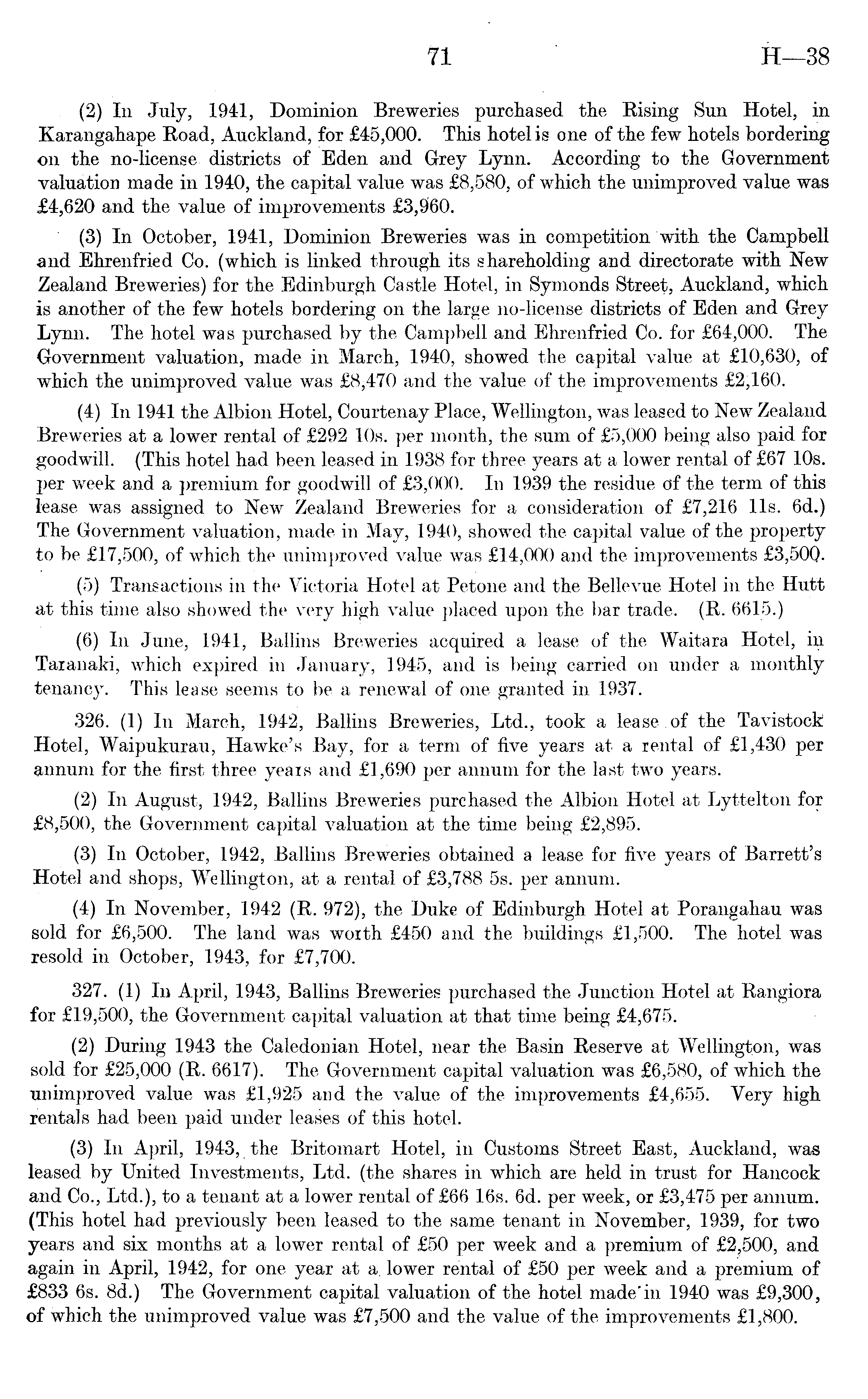 (2) In July, 1941, Dominion Breweries purchased the Rising Bun Hotel, in Karangahape Road, Auckland, for £45,000. This hotel is one of the few hotels bordering on the no-license districts of Eden and Grey Lynn. According to the Government valuation made in 1940, the capital value was £8,580, of which the unimproved value was £4,620 and the value of improvements £3,960. (3) In October, 1941, Dominion Breweries was in competition with the Campbell and Ehrenfried Co. (which is linked through its shareholding and directorate with New Zealand Breweries) for the Edinburgh Castle Hotel, in Symonds Street, Auckland, which is another of the few hotels bordering on the large no-license districts of Eden and Grey Lynn. The hotel was purchased by the Campbell and Ehrenfried Co. for £64,000. The Government valuation, made in March, 1940, showed the capital value at £10,630, of which the unimproved value was £8,470 and the value of the improvements £2,160. (4) In 1941 the Albion Hotel, Courtenay Place, Wellington, was leased to New Zealand Breweries at a lower rental of £292 10s. per month, the sum of £5,000 being also paid for goodwill. (This hotel had been leased in 1938 for three years at a lower rental of £67 10s. per week and a premium for goodwill of £3,000. In 1939 the residue of the term of this lease was assigned to New Zealand Breweries for a consideration of £7,216 lis. 6d.) The Government valuation, made in May, 1940, showed the capital value of the property to be £17,500, of which the unimproved value was £14,000 and the improvements £3,500(5) Transactions in the Victoria Hotel at Petone and the Bellevue Hotel in the Hutt at this time also showed the very high value placed upon the bar trade. (R. 6615.) (6) In June, 1941, Ballins Breweries acquired a lease of the Waitara Hotel, in Taianaki, which expired in January, 1945, and is being carried on under a monthly tenancy. This lease seems to be a renewal of one granted in 1937. 326. (1) In March, 1942, Ballins Breweries, Ltd., took a lease of the Tavistock Hotel, Waipukurau, Hawke's Bay, for a term of five years at a rental of £1,430 per annum for the first three yea is and £1,690 per annum for the last two years. (2) In August, 1942, Ballins Breweries purchased the Albion Hotel at Lyttelton for £8,500, the Government capital valuation at the time being £2,895. (3) In October, 1942, Ballins Breweries obtained a lease for five years of Barrett's Hotel and shops, Wellington, at a rental of £3,788 ss. per annum. (4) In November, 1942 (R. 972), the Duke of Edinburgh Hotel at Porangahau was sold for £6,500. The land was worth £450 and the buildings £1,500. The hotel was resold in October, 1943, for £7,700. 327. (1) In April, 1943, Ballins Breweries purchased the Junction Hotel at Rangiora for £19,500, the Government capital valuation at that time being £4,675. (2) During 1943 the Caledonian Hotel, near the Basin Reserve at Wellington, was sold for £25,000 (R. 6617). The Government capital valuation was £6,580, of which the unimproved value was £1,925 and the value of the improvements £4,655. Very high rentals had been paid under leases of this hotel. (3) In April, 1943, the Britomart Hotel, in Customs Street East, Auckland, was leased by United Investments, Ltd. (the shares in which are held in trust for Hancock and Co., Ltd.), to a tenant at a lower rental of £66 16s. 6d. per week, or £3,475 per annum. (This hotel had previously been leased to the same tenant in November, 1939, for two years and six months at a lower rental of £5O per week and a premium of £2,500, and again in April, 1942, for one year at a. lower rental of £5O per week and a premium of £833 6s. Bd.) The Government capital valuation of the hotel made'in 1940 was £9,300, of which the unimproved value was £7,500 and the value of the improvements £l,BOO.