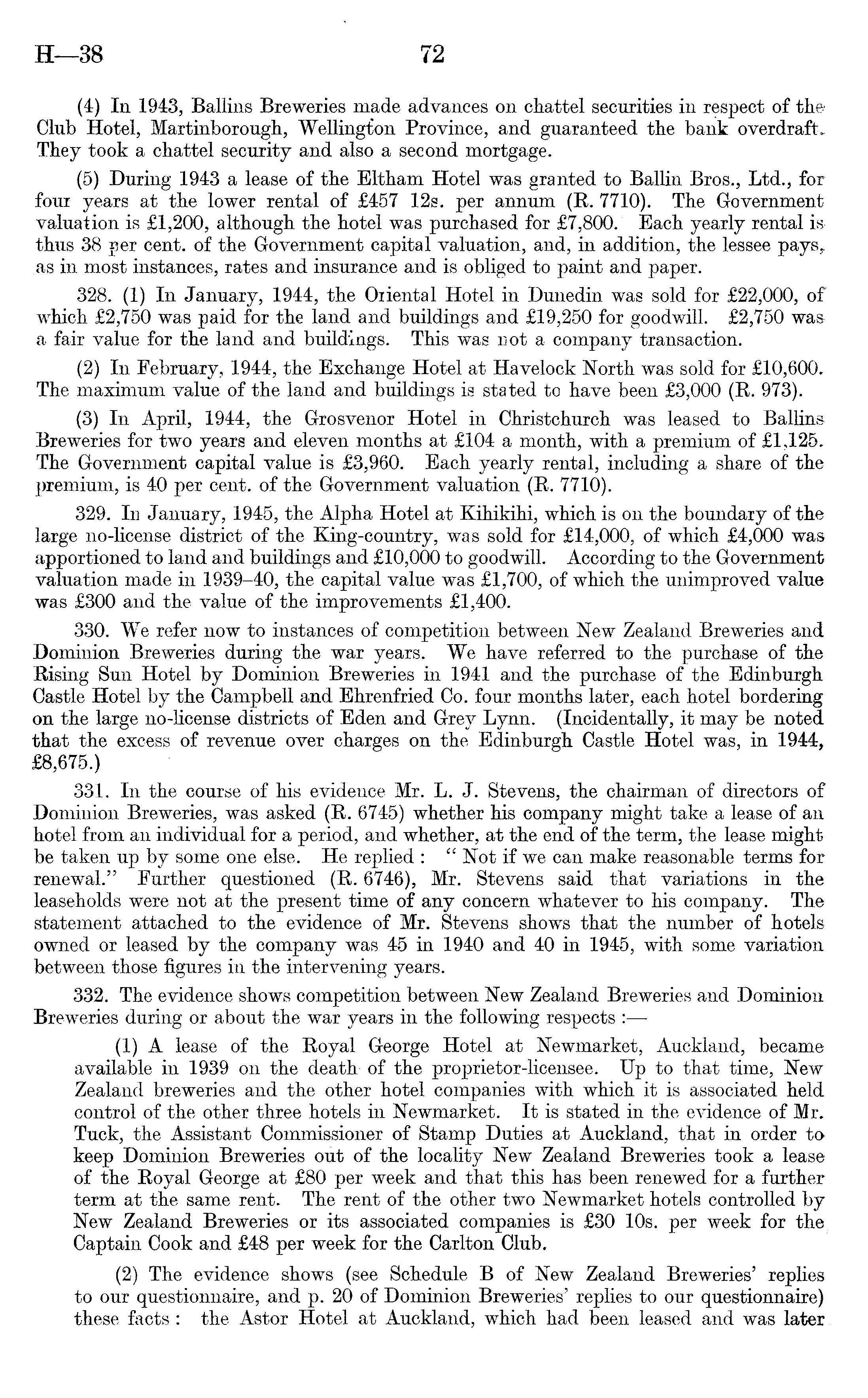 (4) In 1943, Ballins Breweries made advances on chattel securities in respect of the Club Hotel, Martinborough, Wellington Province, and guaranteed the bank overdraft. They took a chattel security and also a second mortgage. (5) During 1943 a lease of the Eltham Hotel was granted to Ballin Bros., Ltd., for four years at the lower rental of £457 12s. per annum (R. 7710). The Government valuation is £1,200, although the hotel was purchased for £7,800.' Each yearly rental is thus 38 per cent, of the Government capital valuation, and, in addition, the lessee pays,, as in most instances, rates and insurance and is obliged to paint and paper. 328. (1) In January, 1944, the Oiiental Hotel in Dunedin was sold for £22,000, of which £2,750 was paid for the land and buildings and £19,250 for goodwill. £2,750 was a fair value for the land and buildings. This was Kot a company transaction. (2) In February, 1944, the Exchange Hotel at Havelock North was sold for £10,600. The maximum value of the land and buildings is stated to have been £3,000 (R. 973). (3) In April, 1944, the Grosvenor Hotel in Christchurch was leased to Ballins Breweries for two years and eleven months at £lO4 a month, with a premium of £1,125. The Government capital value is £3,960. Each yearly rental, including a share of the premium, is 40 per cent, of the Government valuation (R. 7710). 329. In January, 1945, the Alpha Hotel at Kihikihi, which is on the boundaiy of the large no-license district of the King-country, was sold for £14,000, of which £4,000 was apportioned to land and buildings and £lO,OOO to goodwill. According to the Government valuation made in 1939-40, the capital value was £1,700, of which the unimproved value was £3OO and the value of the improvements £1,400. 330. We refer now to instances of competition between New Zealand Breweries and Dominion Breweries during the war years. We have referred to the purchase of the Rising Sun Hotel by Dominion Breweries in 1941 and the purchase of the Edinburgh Castle Hotel by the Campbell and Ehrenfried Co. four months later, each hotel bordering on the large no-license districts of Eden and Grey Lynn. (Incidentally, it may be noted that the excess of revenue over charges on the Edinburgh Castle Hotel was, in 1944, £8,675.) 331. In the course of his evidence Mr. L. J. Stevens, the chairman of directors of Dominion Breweries, was asked (R. 6745) whether his company might take a lease of an hotel from an individual for a period, and whether, at the end of the term, the lease might be taken up by some one else. He replied : " Not if we can make reasonable terms for renewal." Further questioned (R. 6746), Mr. Stevens said that variations in the leaseholds were not at the present time of any concern whatever to his company. The statement attached to the evidence of Mr. Stevens shows that the number of hotels owned or leased by the company was 45 in 1940 and 40 in 1945, with some variation between those figures in the intervening years. 332. The evidence shows competition between New Zealand Breweries and Dominion Breweries during or about the war years in the following respects (1) A lease of the Royal George Hotel at Newmarket, Auckland, became available in 1939 on the death of the proprietor-licensee. Up to that time, New Zealand breweries and the other hotel companies with which it is associated held control of the other three hotels in Newmarket. It is stated in the evidence of Mr. Tuck, the Assistant Commissioner of Stamp Duties at Auckland, that in order to keep Dominion Breweries out of the locality New Zealand Breweries took a lease of the Royal George at £BO per week and that this has been renewed for a further term at the same rent. The rent of the other two Newmarket hotels controlled by New Zealand Breweries or its associated companies is £3O 10s. per week for the Captain Cook and £4B per week for the Carlton Club. (2) The evidence shows (see Schedule B of New Zealand Breweries' replies to our questionnaire, and p. 20 of Dominion Breweries' replies to our questionnaire) these facts : the Astor Hotel at Auckland, which had been leased and was later