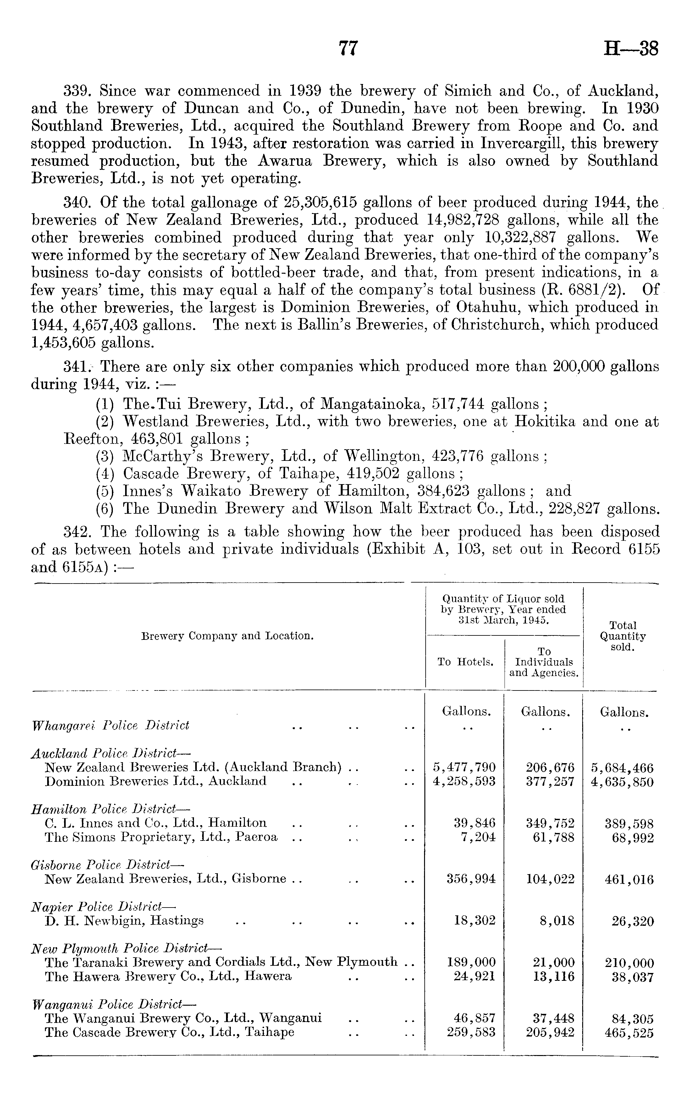 339. Since war commenced in 1939 the brewery of Simich and Co., of Auckland, and the brewery of Duncan and Co., of Dunedin, have not been brewing. In 1930 Southland Breweries, Ltd., acquired the Southland Brewery from Roope and Co. and stopped production. In 1943, after restoration was carried in Invercargill, this brewery resumed production, but the Awarua Brewery, which is also owned by Southland Breweries, Ltd., is not yet operating. 340. Of the total gallonage of 25,305,615 gallons of beer produced during 1944, the breweries of New Zealand Breweries, Ltd., produced 14,982,728 gallons, while all the other breweries combined produced during that year only 10,322,887 gallons. We were informed by the secretary of New Zealand Breweries, that one-third of the company's business to-day consists of bottled-beer trade, and that, from present indications, in a few years' time, this may equal a half of the company's total business (R. 6881/2). Of the other breweries, the largest is Dominion Breweries, of Otahuhu, which produced in 1944, 4,657,403 gallons. The next is Ballin's Breweries, of Christchurch, which produced 1,453,605 gallons. 341. There are only six other companies which produced more than 200,000 gallons during 1944, viz.:— (1) The.Tui Brewery, Ltd., of Mangatainoka, 517,744 gallons ; (2) Westland Breweries, Ltd., with two breweries, one at Hokitika and one at Reefton, 463,801 gallons; (3) McCarthy's Brewery, Ltd., of Wellington, 423,776 gallons ; (4) Cascade Brewery, of Taihape, 419,502 gallons; (5) Innes's Waikato Brewery of Hamilton, 384,623 gallons; and (6) The Dunedin Brewery and Wilson Malt Extract Co., Ltd., 228,827 gallons. 342. The following is a table showing how the beer produced has been disposed of as between hotels and private individuals (Exhibit A, 103, set out in Record 6155 and 6155 a) :