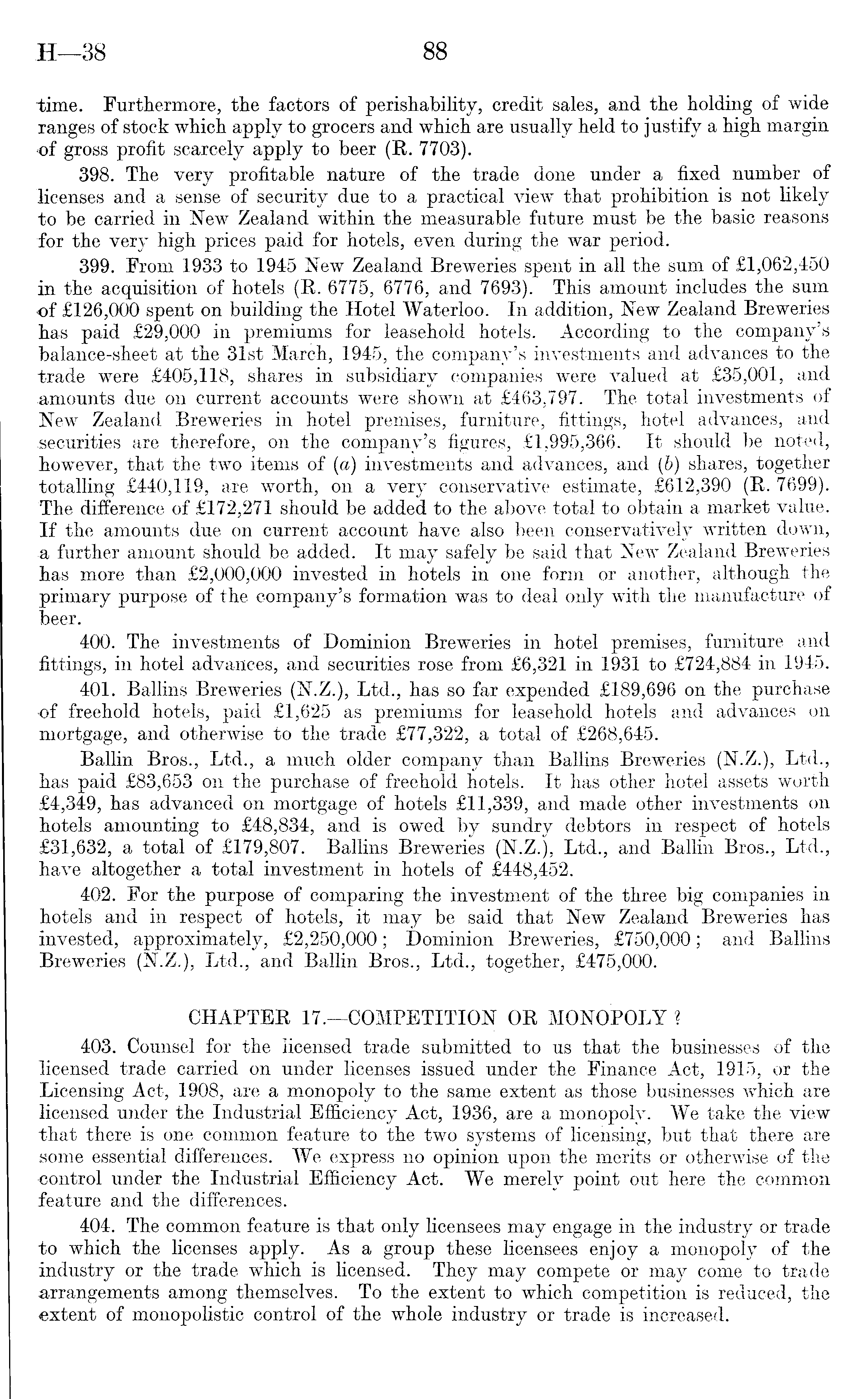 time. Furthermore, the factors of perishability, credit sales, and the holding of wide xanges of stock which apply to grocers and which are usually held to justify a high margin of gross profit scarcely apply to beer (R. 7703). 398. The very profitable nature of the trade done under a fixed number of licenses and a sense of security due to a practical view that prohibition is not likely to be carried in New Zealand within the measurable future must be the basic reasons for the very high prices paid for hotels, even during the war period. 399. From 1933 to 1945 New Zealand Breweries spent in all the sum of £1,062,450 in the acquisition of hotels (R. 6775, 6776, and 7693). This amount includes the sum of £126,000 spent on building the Hotel Waterloo. In addition, New Zealand Breweries has paid £29,000 in premiums for leasehold hotels. According to the company's balance-sheet at the 31st March, 1945, the company's investments and advances to the trade were £405,118, shares in subsidiary companies were valued at £35,001, and amounts due on current accounts were shown at £463,797. The total investments of New Zealand Breweries in hotel premises, furniture, fittings, hotel advances, and securities are therefore, on the company's figures, £1,995,366. It should be noted, however, that the two items of (a) investments and advances, and (b) shares, together totalling £440,119, are worth, on a very conservative estimate, £612,390 (R. 7699). The difference of £172,271 should be added to the above total to obtain a market value. If the amounts due on current account have also been conservatively written down, •a further amount should be added. It may safely be said that New Zealand Breweries has more than £2,000,000 invested in hotels in one form or another, although the primary purpose of the company's formation was to deal only with the manufacture of beer. 400. The investments of Dominion Breweries in hotel premises, furniture and fittings, in hotel advances, and securities rose from £6,321 in 1931 to £724,884 in 1945. 401. Ballins Breweries (N.Z.), Ltd., has so far expended £189,696 on the purchase of freehold hotels, paid £1,625 as premiums for leasehold hotels and advances on mortgage, and otherwise to the trade £77,322, a total of £268,645. Ballin Bros., Ltd., a much older company than Ballins Breweries (N.Z.), Ltd., has paid £83,653 on the purchase of freehold hotels. It has other hotel assets worth £4,349, has advanced on mortgage of hotels £11,339, and made other investments on hotels amounting to £48,834, and is owed by sundry debtors in respect of hotels £31,632, a total of £179,807. Ballins Breweries (N.Z.), Ltd., and Ballin Bros., Ltd., have altogether a total investment in hotels of £448,452. 402. For the purpose of comparing the investment of the three big companies in hotels and in respect of hotels, it may be said that New Zealand Breweries has invested, approximately, £2,250,000; Dominion Breweries, £750,000; and Ballins Breweries (N.Z.), Ltd., and Ballin Bros., Ltd., together, £475,000. CHAPTER 17.—COMPETITION OR MONOPOLY ? 403. Counsel for the licensed trade submitted to us that the businesses of the licensed trade carried on under licenses issued under the Finance Act, 1915, or the Licensing Act, 1908, are a monopoly to the same extent as those businesses which are licensed under the Industrial Efficiency Act, 1936, are a monopoly. We take the view that there is one common feature to the two systems of licensing, but that there are some essential differences. We express no opinion upon the merits or otherwise of the •control under the Industrial Efficiency Act. We merely point out here the common feature and the differences. 404. The common feature is that only licensees may engage in the industry or trade to which the licenses apply. As a group these licensees enjoy a monopoly of the industry or the trade which is licensed. They may compete or may come to trade arrangements among themselves. To the extent to which competition is reduced, the extent of monopolistic control of the whole industry or trade is increased.