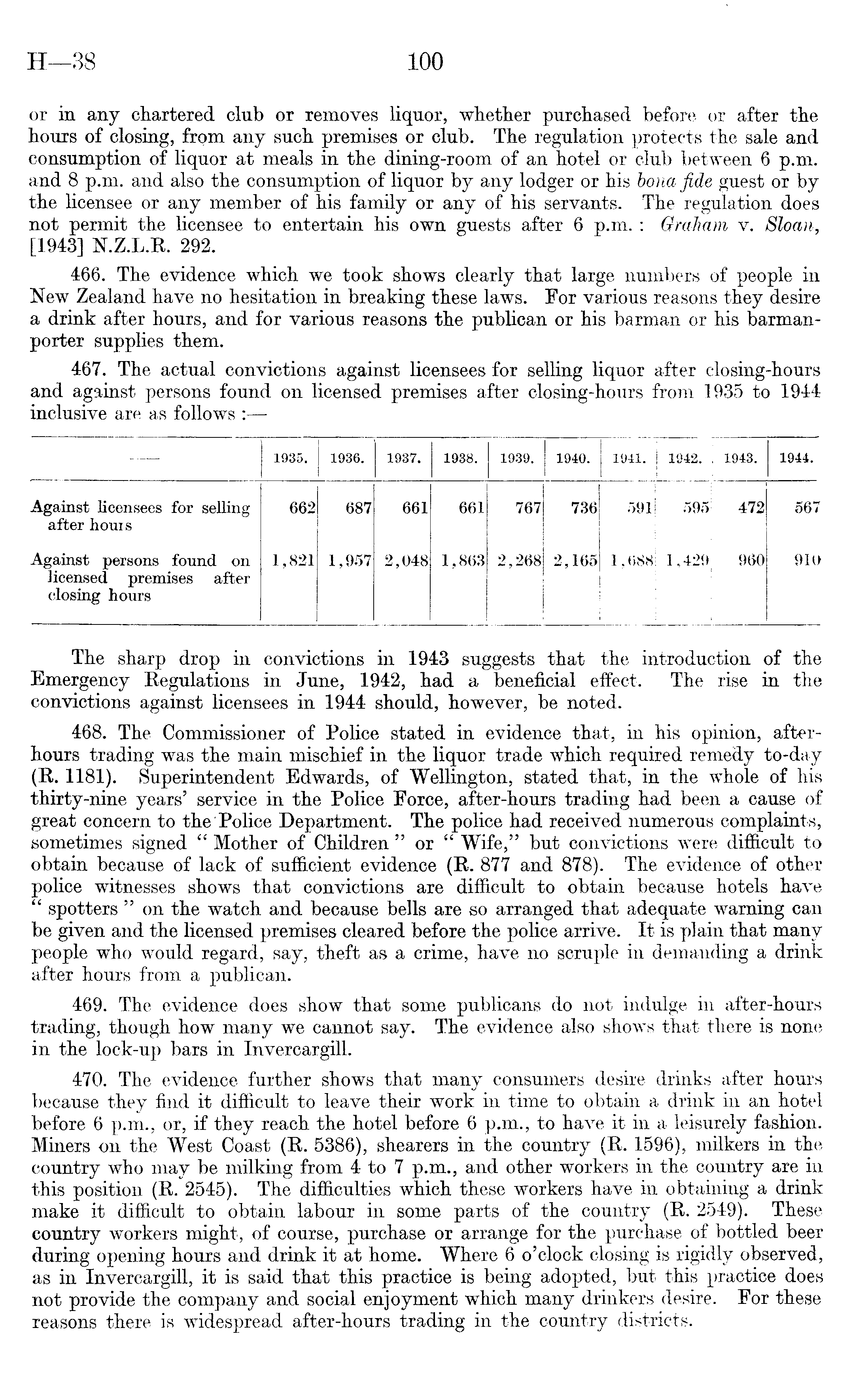 or in any chartered club or removes liquor, whether purchased before or after the hours of closing, from any such premises or club. The regulation protects the sale and consumption of liquor at meals in the dining-room of an hotel or club between 6 p.m. and 8 p.m. and also the consumption of liquor by any lodger or his bona fide guest or by the licensee or any member of his family or any of his servants. The regulation does not permit the licensee to entertain his own guests after 6 p.m. : Graham v. Sloan, [1943] N.Z.L.R. 292. 466. The evidence which we took shows clearly that large numbers of people in New Zealand have no hesitation in breaking these laws. For various reasons they desire a drink after hours, and for various reasons the publican or his barman or his barmanporter supplies them. 467. The actual convictions against licensees for selling liquor after closing-hours and against persons found on licensed premises after closing-hours from 1935 to 1944 inclusive are as follows :