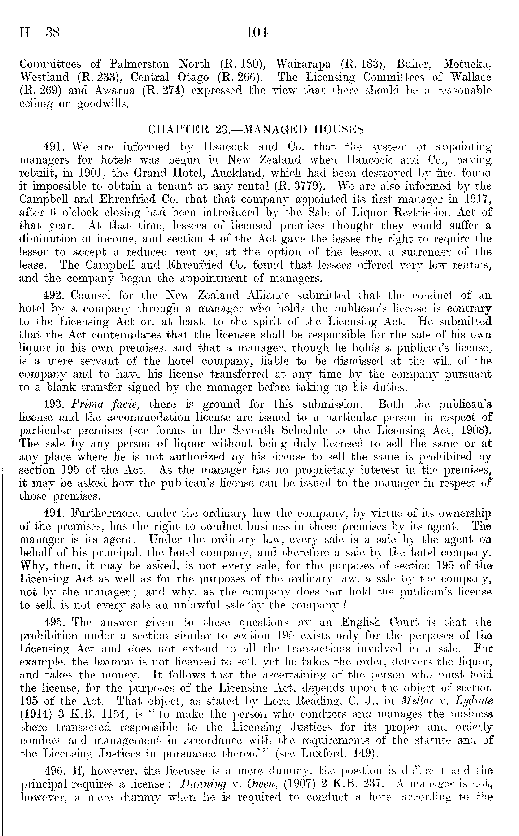 Committees of Palmerston North (R. 180), Wairarapa (R. 183), Buller, Motueka, Westland (R. 233), Central Otago (R. 266). The Licensing Committees of Wallace (R. 269) and Awarua (R. 274) expressed the view that there should be a reasonable ceiling on goodwills. CHAPTER 23.—MANAGED HOUSES 491. We are informed by Hancock and Co. that the system of appointing managers for hotels was begun in New Zealand when Hancock and Co., having rebuilt, in 1901, the Grand Hotel, Auckland, which had been destroyed by fire, found it impossible to obtain a tenant at any rental (R. 3779). We are also informed by the Campbell and Ehrenfried Co. that that company appointed its first manager in 1917, after 6 o'clock closing had been introduced by the Sale of Liquor Restriction Act of that year. At that time, lessees of licensed premises thought they would suffer a diminution of income, and section 4 of the Act gave the lessee the right to require the lessor to accept a reduced rent or, at the option of the lessor, a surrender of the lease. The Campbell and Ehrenfried Co. found that lessees offered very low rentals, and the company began the appointment of managers. 492. Counsel for the New Zealand Alliance submitted that the conduct of an hotel by a company through a manager who holds the publican's license is contrary to the Licensing Act or, at least, to the spirit of the Licensing Act. He submitted that the Act contemplates that the licensee shall be responsible for the sale of his own liquor in his own premises, and that a manager, though he holds a publican's license, is a mere servant of the hotel company, liable to be dismissed at the will of the company and to have his license transferred at any time by the company pursuant to a blank transfer signed by the manager before taking up his duties. 493. Prima facie, there is ground for this submission. Both the publican's license and the accommodation license are issued to a particular person in respect of particular premises (see forms in the Seventh Schedule to the Licensing Act, 1908). The sale by any person of liquor without being duly licensed to sell the same or at any place where he is not authorized by his license to sell the same is prohibited by section 195 of the Act. As the manager has no proprietary interest in the premises, it may be asked how the publican's license can be issued to the manager in respect of those premises. 494. Furthermore, under the ordinary law the company, by virtue of its ownership of the premises, has the right to conduct business in those premises by its agent. The manager is its agent. Under the ordinary law, every sale is a sale by the agent on behalf of his principal, the hotel company, and therefore a sale by the hotel company. Why, then, it may be asked, is not every sale, for the purposes of section 195 of the Licensing Act as well as for the purposes of the ordinary law, a sale by the company, not by the manager ; and why, as the company does not hold the publican's license to sell, is not every sale an unlawful sale "by the company ? 495. The answer given to these questions by an English Court is that the prohibition under a section similar to section 195 exists only for the purposes of the Licensing Act and does not extend to all the transactions involved in a sale. For example, the barman is not licensed to sell, yet he takes the order, delivers the liquor, and takes the money. It follows that the ascertaining of the person who must hold the license, for the purposes of the Licensing Act, depends upon the object of section 195 of the Act. That object, as stated by Lord Reading, C. J., in Mellor v. Lydiate (1914) 3 K.B. 1154, is " to make the person who conducts and manages the business there transacted responsible to the Licensing Justices for its proper and orderly conduct and management in accordance with the requirements of the statute and of the Licensing Justices in pursuance thereof" (see Luxford, 149). 496. If, however, the licensee is a mere dummy, the position is different and the principal requires a license : Dunning v. Owen, (1907) 2 K.B. 237. A manager is not, however, a mere dummy when he is required to conduct a hotel according to the