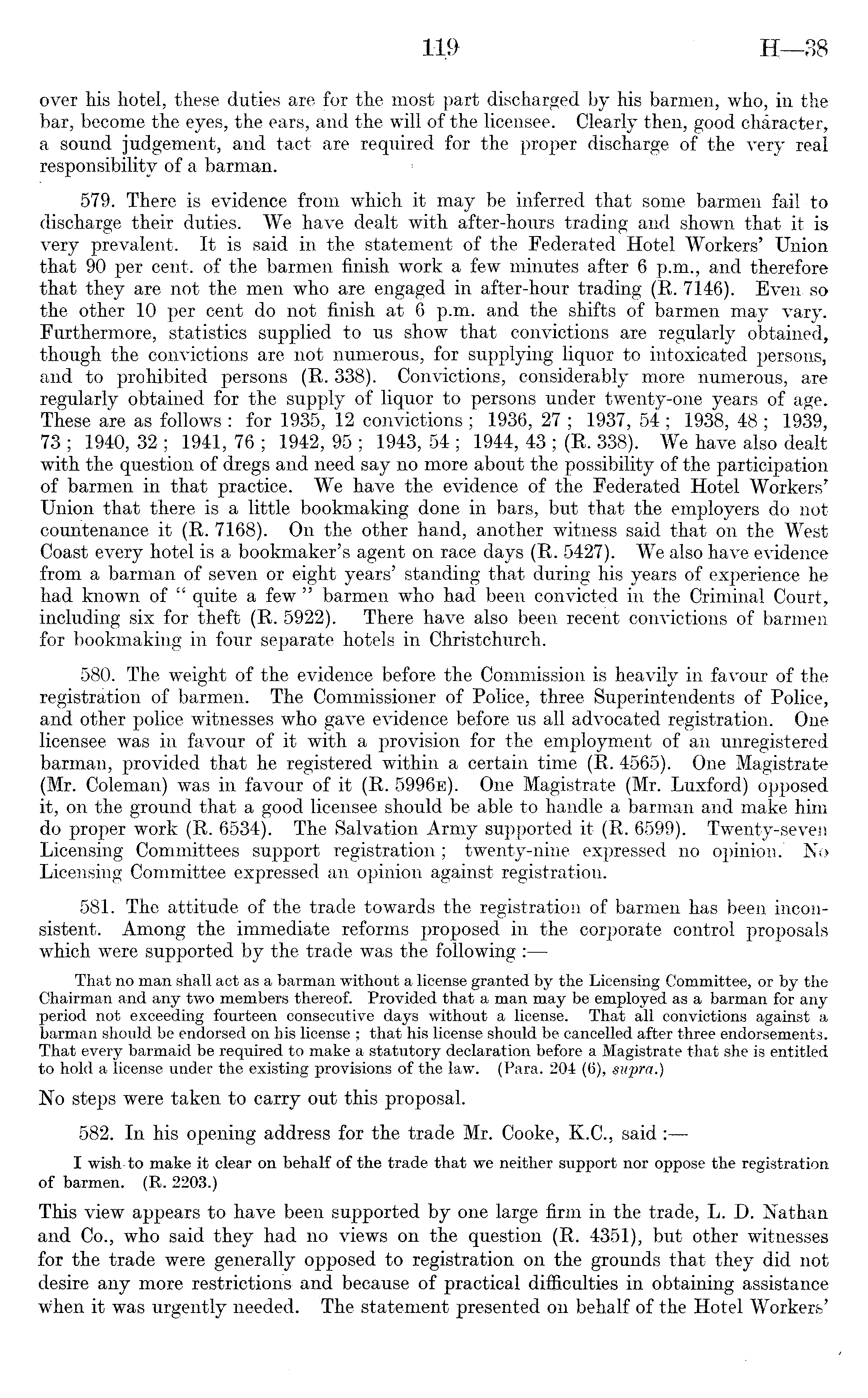 over his hotel, these duties are for the most part discharged by his barmen, who, in the bar, become the eyes, the ears, and the will of the licensee. Clearly then, good character, a sound judgement, and tact are required for the proper discharge of the very real responsibility of a barman. 579. There is evidence from which it may be inferred that some barmen fail to discharge their duties. We have dealt with after-hours trading and shown that it is very prevalent. It is said in the statement of the Federated Hotel Workers' Union that 90 per cent, of the barmen finish work a few minutes after 6 p.m., and therefore that they are not the men who are engaged in after-hour trading (R. 7146). Even so the other 10 per cent do not finish at 6 p.m. and the shifts of barmen may vary. Furthermore, statistics supplied to us show that convictions are regularly obtained, though the convictions are not numerous, for supplying liquor to intoxicated persons, and to prohibited persons (R. 338). Convictions, considerably more numerous, are regularly obtained for the supply of liquor to persons under twenty-one years of age. These are as follows : for 1935, 12 convictions ; 1936, 27 ; 1937, 54 ; 1938, 48 ; 1939, 73 ; 1940, 32 ; 1941, 76 ; 1942, 95 ; 1943, 54 ; 1944, 43 ; (R. 338). We have also dealt with the question of dregs and need say no more about the possibility of the participation of barmen in that practice. We have the evidence of the Federated Hotel Workers' Union that there is a little bookmaking done in bars, but that the employers do not countenance it (R. 7168). On the other hand, another witness said that on the West Coast every hotel is a bookmaker's agent on race days (R. 5427). We also have evidence from a barman of seven or eight years' standing that during his years of experience he had known of " quite a few " barmen who had been convicted in the Criminal Court, including six for theft (R. 5922). There have also been recent convictions of barmen for bookmaking in four separate hotels in Christchurch. 580. The weight of the evidence before the Commission is heavily in favour of the registration of barmen. The Commissioner of Police, three Superintendents of Police, and other police witnesses who gave evidence before us all advocated registration. One licensee was in favour of it with a provision for the employment of an unregistered barman, provided that he registered within a certain time (R. 4565). One Magistrate (Mr. Coleman) was in favour of it (R. 5996e). One Magistrate (Mr. Luxford) opposed it, on the ground that a good licensee should be able to handle a barman and make him do proper work (R. 6534). The Salvation Army supported it (R. 6599). Twenty-seven Licensing Committees support registration ; twenty-nine expressed no opinion. No Licensing Committee expressed an opinion against registration. 581. The attitude of the trade towards the registration of barmen has been inconsistent. Among the immediate reforms proposed in the corporate control proposals which were supported by the trade was the following : That no man shall act as a barman without a license granted by the Licensing Committee, or by the Chairman and any two members thereof. Provided that a man may be employed as a barman for any period not exceeding fourteen consecutive days without a license. That all convictions against a barman should be endorsed on his license ; that his license should be cancelled after three endorsements. That every barmaid be required to make a statutory declaration before a Magistrate that she is entitled to hold a license under the existing provisions of the law. (Para. 204 (6), supra.) No steps were taken to carry out this proposal. 582. In his opening address for the trade Mr. Cooke, K.C., said : I wish to make it clear on behalf of the trade that we neither support nor oppose the registration of barmen. (R. 2203.) This view appears to have been supported by one large firm in the trade, L. D. Nathan and Co., who said they had no views on the question (R. 4351), but other witnesses for the trade were generally opposed to registration on the grounds that they did not desire any more restrictions and because of practical difficulties in obtaining assistance when it was urgently needed. The statement presented on behalf of the Hotel Workers'