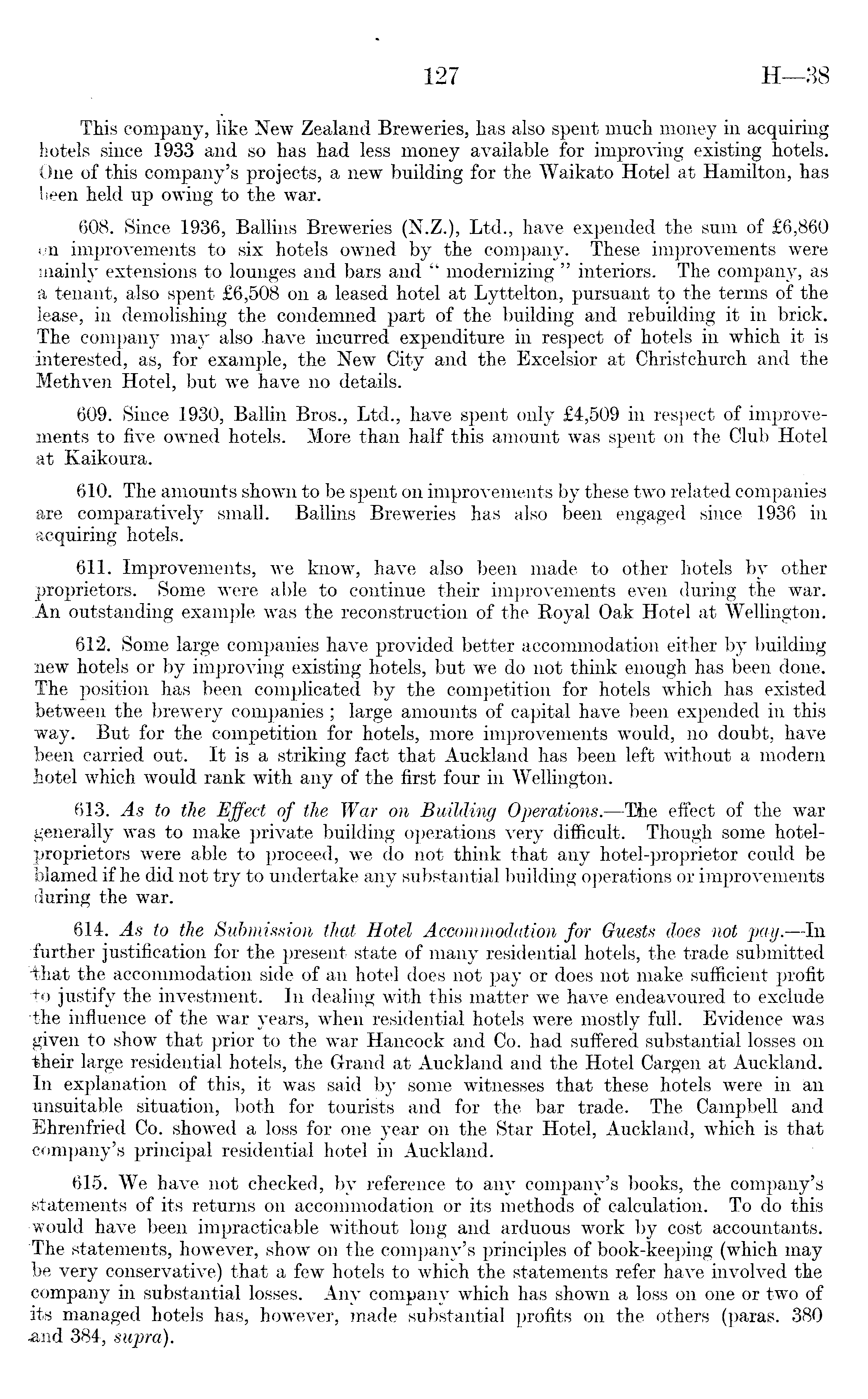 This company, like New Zealand Breweries, has also spent much money in acquiring hotels since 1933 and so has had less money available for improving existing hotels. One of this company's projects, a new building for the Waikato Hotel at Hamilton, has been held up owing to the war. 608. Since 1936, Ballins Breweries (N.Z.), Ltd., have expended the sum of £6,860 on improvements to six hotels owned by the company. These improvements were mainly extensions to lounges and bars and " modernizing " interiors. The company, as a tenant, also spent £6,508 on a leased hotel at Lyttelton, pursuant to the terms of the lease, in demolishing the condemned part of the building and rebuilding it in brick. The company may also have incurred expenditure in respect of hotels in which it is interested, as, for example, the New City and the Excelsior at Christchurch and the Methven Hotel, but we have no details. 609. Since 1930, Ballin Bros., Ltd., have spent only £4,509 in respect of improvements to five owned hotels. More than half this amount was spent on the Club Hotel at Kaikoura. 610. The amounts shown to be spent on improvements by these two related companies are comparatively small. Ballins Breweries has also been engaged since 1936 in acquiring hotels. 611. Improvements, we know, have also been made to other hotels by other proprietors. Some were able to continue their improvements even during the war. An outstanding example was the reconstruction of the Royal Oak Hotel at Wellington. 612. Some large companies have provided better accommodation either by building new hotels or by improving existing hotels, but we do not think enough has been done. The position has been complicated by the competition for hotels which has existed between the brewery companies; large amounts of capital have been expended in this way. But for the competition for hotels, more improvements would, no doubt, have been carried out. It is a striking fact that Auckland has been left without a modern hotel which would rank with any of the first four in Wellington. 613. As to the Effect of the War on Building Operations.—The effect of the war .generally was to make private building operations very difficult. Though some hotelproprietors were able to proceed, we do not think that any hotel-proprietor could be blamed if he did not try to undertake any substantial building operations or improvements during the war. 614. As to the Submission that Hotel Accommodation for Guests does not pay. —In further justification for the present state of many residential hotels, the trade submitted "that the accommodation side of an hotel does not pay or does not make sufficient profit to justify the investment. In dealing with this matter we have endeavoured to exclude the influence of the war years, when residential hotels were mostly full. Evidence was given to show that prior to the war Hancock and Co. had suffered substantial losses on their large residential hotels, the Grand at Auckland and the Hotel Cargen at Auckland. In explanation of this, it was said by some witnesses that these hotels were in an unsuitable situation, both for tourists and for the bar trade. The Campbell and Ehrenfried Co. showed a loss for one year on the Star Hotel, Auckland, which is that company's principal residential hotel in Auckland. 615. We have not checked, by reference to any company's books, the company's statements of its returns on accommodation or its methods of calculation. To do this would have been impracticable without long and arduous work by cost accountants. The statements, however, show on the company's principles of book-keeping (which may be very conservative) that a few hotels to which the statements refer have involved the company in substantial losses. Any company which has shown a loss on one or two of its managed hotels has, however, made substantial profits on the others (paras. 380 ■and 384, supra).