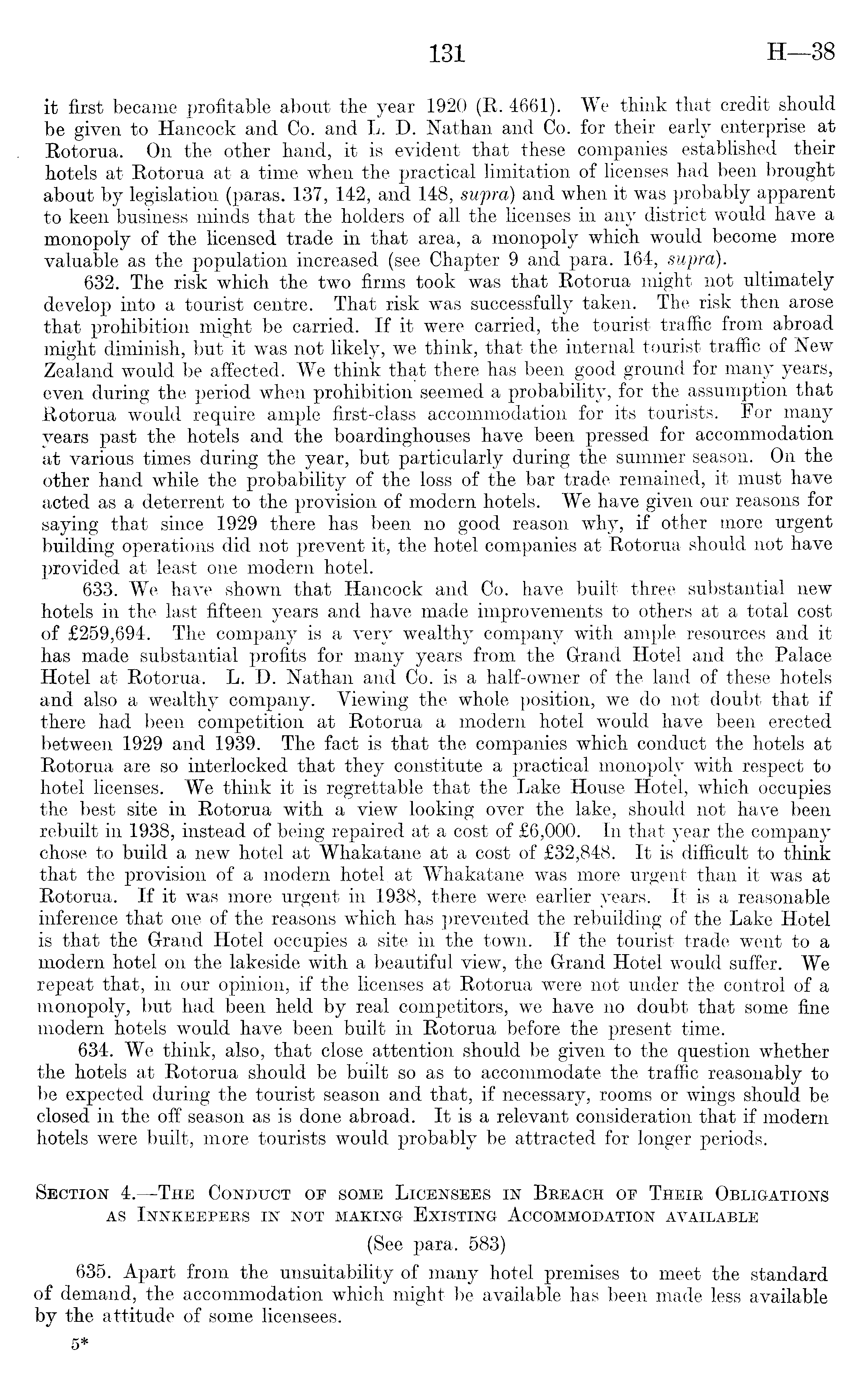 it first became profitable about the year 1920 (R. 4661). We think that credit should be given to Hancock and Co. and L. D. Nathan and Co. for their early enterprise at Rotorua. On the other hand, it is evident that these companies established their hotels at Rotorua at a time when the practical limitation of licenses had been brought about by legislation (paras. 137, 142, and 148, supra) and when it was probably apparent to keen business minds that the holders of all the licenses in any district would have a monopoly of the licensed trade in that area, a monopoly which would become more valuable as the population increased (see Chapter 9 and para. 164, supra). 632. The risk which the two firms took was that Rotorua might not ultimately develop into a tourist centre. That risk was successfully taken. The risk then arose that prohibition might be carried. If it were carried, the tourist traffic from abroad might diminish, but it was not likely, we think, that the internal tourist traffic of New Zealand would be affected. We think that there has been good ground for many years, even during the period when prohibition seemed a probability, for the assumption that Rotorua would require ample first-class accommodation for its tourists. For many years past the hotels and the boardinghouses have been pressed for accommodation at various times during the year, but particularly during the summer season. On the other hand while the probability of the loss of the bar trade remained, it must have acted as a deterrent to the provision of modern hotels. We have given our reasons for saying that since 1929 there has been no good reason why, if other more urgent building operations did not prevent it, the hotel companies at Rotorua should not have provided at least one modern hotel. 633. We have shown that Hancock and Co. have built three substantial new hotels in the last fifteen years and have made improvements to others at a total cost of £259,694. The company is a very wealthy company with ample resources and it has made substantial profits for many years from the Grand Hotel and the Palace Hotel at Rotorua. L. D. Nathan and Co. is a half-owner of the land of these hotels and also a wealthy company. Viewing the whole position, we do not doubt that if there had been competition at Rotorua a modern hotel would have been erected between 1929 and 1939. The fact is that the companies which conduct the hotels at Rotorua are so interlocked that they constitute a practical monopoly with respect to hotel licenses. We think it is regrettable that the Lake House Hotel, which occupies the best site in Rotorua with a view looking over the lake, should not have been rebuilt in 1938, instead of being repaired at a cost of £6,000. In that year the company chose to build a new hotel at Whakatane at a cost of £32,848. It is difficult to think that the provision of a modern hotel at Whakatane was more urgent than it was at Rotorua. If it was more urgent in 1938, there were earlier years. It is a reasonable inference that one of the reasons which has prevented the rebuilding of the Lake Hotel is that the Grand Hotel occupies a site in the town. If the tourist trade went to a modern hotel on the lakeside with a beautiful view, the Grand Hotel would suffer. We repeat that, in our opinion, if the licenses at Rotorua were not under the control of a monopoly, but had been held by real competitors, we have no doubt that some fine modern hotels would have been built in Rotorua before the present time. 634. We think, also, that close attention should be given to the question whether the hotels at Rotorua should be built so as to accommodate the traffic reasonably to be expected during the tourist season and that, if necessary, rooms or wings should be closed in the off season as is done abroad. It is a relevant consideration that if modern hotels were built, more tourists would probably be attracted for longer periods. Section 4.—The Conduct of some Licensees in Breach op Their Obligations as Innkeepers in not making Existing Accommodation available (See para. 583) 635. Apart from the unsuitability of many hotel premises to meet the standard of demand, the accommodation which might be available has been made less available by the attitude of some licensees.