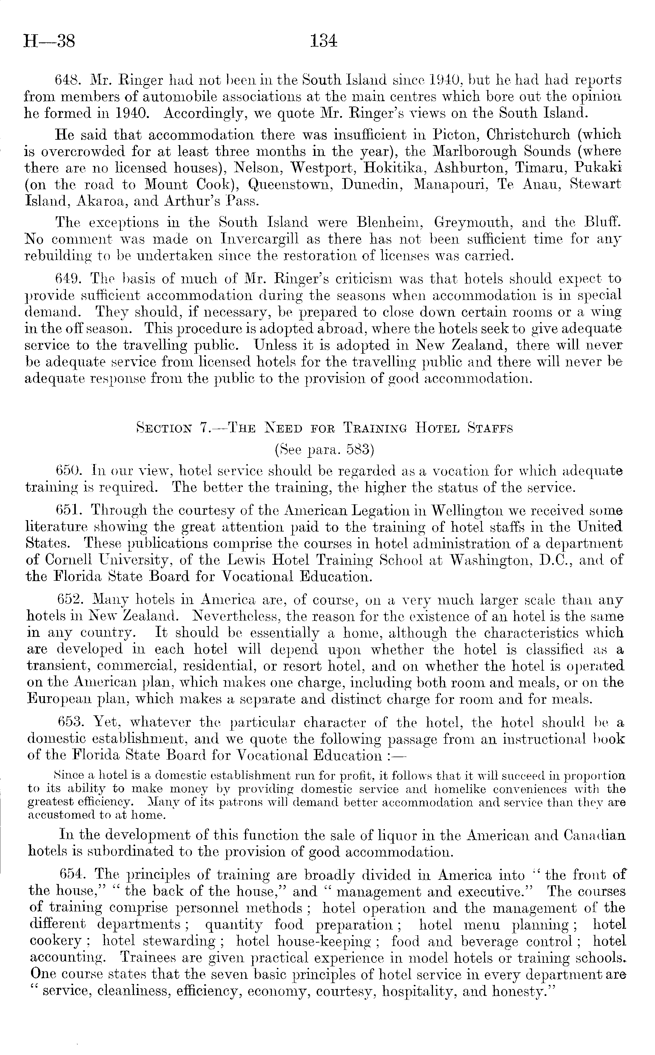 648. Mr. Ringer had not been in the South. Island since 1940, but he had had reports from members of automobile associations at the main centres which bore out the opinion he formed in 1940. Accordingly, we quote Mr. Ringer's views on the South Island. He said that accommodation there was insufficient in Picton, Christchurch (which is overcrowded for at least three months in the year), the Marlborough Sounds (where there are no licensed houses), Nelson, Westport, Hokitika, Ashburton, Timaru, Pukaki (on the road to Mount Cook), Queenstown, Dunedin, Manapouri, Te Anau, Stewart Island, Akaroa, and Arthur's Pass. The exceptions in the South Island were Blenheim, Greymouth, and the Bluff. No comment was made on Invercargill as there has not been sufficient time for any rebuilding to be undertaken since the restoration of licenses was carried. 649. The basis of much of Mr. Ringer's criticism was that hotels should expect to provide sufficient accommodation during the seasons when accommodation is in special demand. They should, if necessary, be prepared to close down certain rooms or a wing in the off season. This procedure is adopted abroad, where the hotels seek to give adequate service to the travelling public. Unless it is adopted in New Zealand, there will never be adequate service from licensed hotels for the travelling public and there will never be adequate response from the public to the provision of good accommodation. Section 7.—The Need for Training Hotel Staffs (See para. 583) 650. In our view, hotel service should be regarded as a vocation for which adequate training is required. The better the training, the higher the status of the service. 651. Through the courtesy of the American Legation in Wellington we received some literature showing the great attention paid to the training of hotel staffs in the United States. These publications comprise the courses in hotel administration of a department of Cornell University, of the Lewis Hotel Training School at Washington, D.C., and of the Florida State Board for Vocational Education. 652. Many hotels in America are, of course, on a very much larger scale than any hotels in New Zealand. Nevertheless, the reason for the existence of an hotel is the same in any country. It should be essentially a home, although the characteristics which are developed in each hotel will depend upon whether the hotel is classified as a transient, commercial, residential, or resort hotel, and on whether the hotel is operated on the American plan, which makes one charge, including both room and meals, or on the European plan, which makes a separate and distinct charge for room and for meals. 653. Yet, whatever the particular character of the hotel, the hotel should be a domestic establishment, and we quote the following passage from an instructional book of the Florida State Board for Vocational Education : Since a hotel is a domestic establishment run for profit, it follows that it will succeed in proportion to its ability to make money by providing domestic service and homelike conveniences with the greatest efficiency. Many of its patrons will demand better accommodation and service than they are accustomed to at home. In the development of this function the sale of liquor in the American and Canadian hotels is subordinated to the provision of good accommodation. 654. The principles of training are broadly divided in America into " the front of the house," " the back of the house," and " management and executive." The courses of training comprise personnel methods ; hotel operation and the management of the different departments; quantity food preparation; hotel menu planning; hotel cookery ; hotel stewarding ; hotel house-keeping ; food and beverage control; hotel accounting. Trainees are given practical experience in model hotels or training schools* One course states that the seven basic principles of hotel service in every department are " service, cleanliness, efficiency, economy, courtesy, hospitality, and honesty."