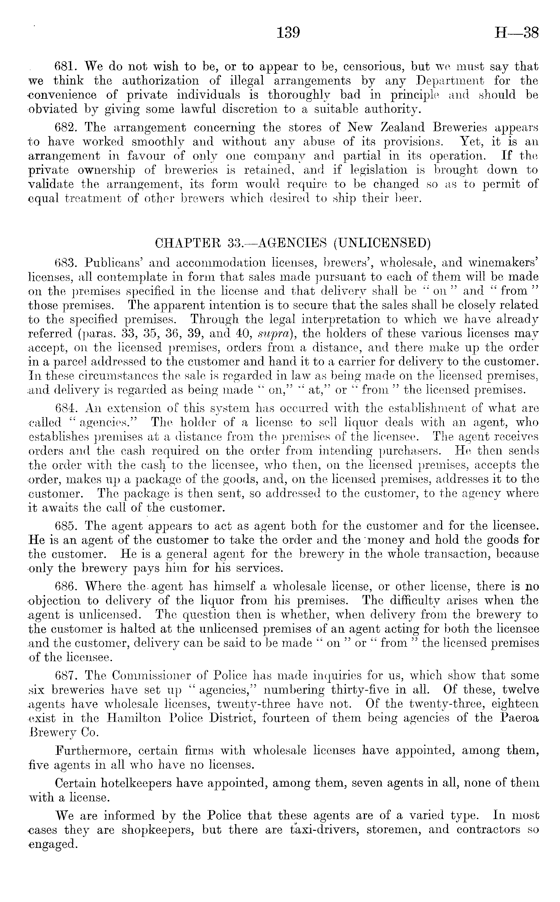 681. We do not wish to be, or to appear to be, censorious, but we must say that we think the authorization of illegal arrangements by any Department for the convenience of private individuals is thoroughly bad in principle and should be obviated by giving some lawful discretion to a suitable authority. 682. The arrangement concerning the stores of New Zealand Breweries appears to have worked smoothly and without any abuse of its provisions. Yet, it is an arrangement in favour of only one company and partial in its operation. If the private ownership of breweries is retained, and if legislation is brought down to validate the arrangement, its form would require to be changed so as to permit of equal treatment of other brewers which desired to ship their beer. CHAPTER 33.—AGENCIES (UNLICENSED) 683. Publicans' and accommodation licenses, brewers', wholesale, and winemakers' licenses, all contemplate in form that sales made pursuant to each of them will be made on the premises specified in the license and that delivery shall be " on " and " from " those premises. The apparent intention is to secure that the sales shall be closely related to the specified premises. Through the legal interpretation to which we have already referred (paras. 33, 35, 36, 39, and 40, supra), the holders of these various licenses may accept, on the licensed premises, orders from a distance, and there make up the order in a parcel addressed to the customer and hand it to a carrier for delivery to the customer. In these circumstances the sale is regarded in law as being made on the licensed premises, and delivery is regarded as being made " on," " at," or " from " the licensed premises. 684. An extension of this system has occurred with the establishment of what are ■called " agencies." The holder of a license to sell liquor deals with an agent, who ■establishes premises at a distance from the premises of the licensee. The agent receives orders and the cash required on the order from intending purchasers. He then sends the order with the cash to the licensee, who then, on the licensed premises, accepts the order, makes up a package of the goods, and, on the licensed premises, addresses it to the customer. The package is then sent, so addressed to the customer, to the agency where it awaits the call of the customer. 685. The agent appears to act as agent both for the customer and for the licensee. He is an agent of the customer to take the order and the money and hold the goods for the customer. He is a general agent for the brewery in the whole transaction, because •only the brewery pays him for his services. 686. Where the-agent has himself a wholesale license, or other license, there is no objection to delivery of the liquor from his premises. The difficulty arises when the agent is unlicensed. The question then is whether, when delivery from the brewery to the customer is halted at the unlicensed premises of an agent acting for both the licensee and the customer, delivery can be said to be made " on " or " from " the licensed premises of the licensee. 687. The Commissioner of Police has made inquiries for us, which show that some six breweries have set up " agencies," numbering thirty-five in all. Of these, twelve agents have wholesale licenses, twenty-three have not. Of the twenty-three, eighteen exist in the Hamilton Police District, fourteen of them being agencies of the Paeroa Brewery Co. Furthermore, certain firms with wholesale licenses have appointed, among them, five agents in all who have no licenses. Certain hotelkeepers have appointed, among them, seven agents in all, none of them with a license. We are informed by the Police that these agents are of a varied type. In most cases they are shopkeepers, but there are taxi-drivers, storemen, and contractors so ■engaged.