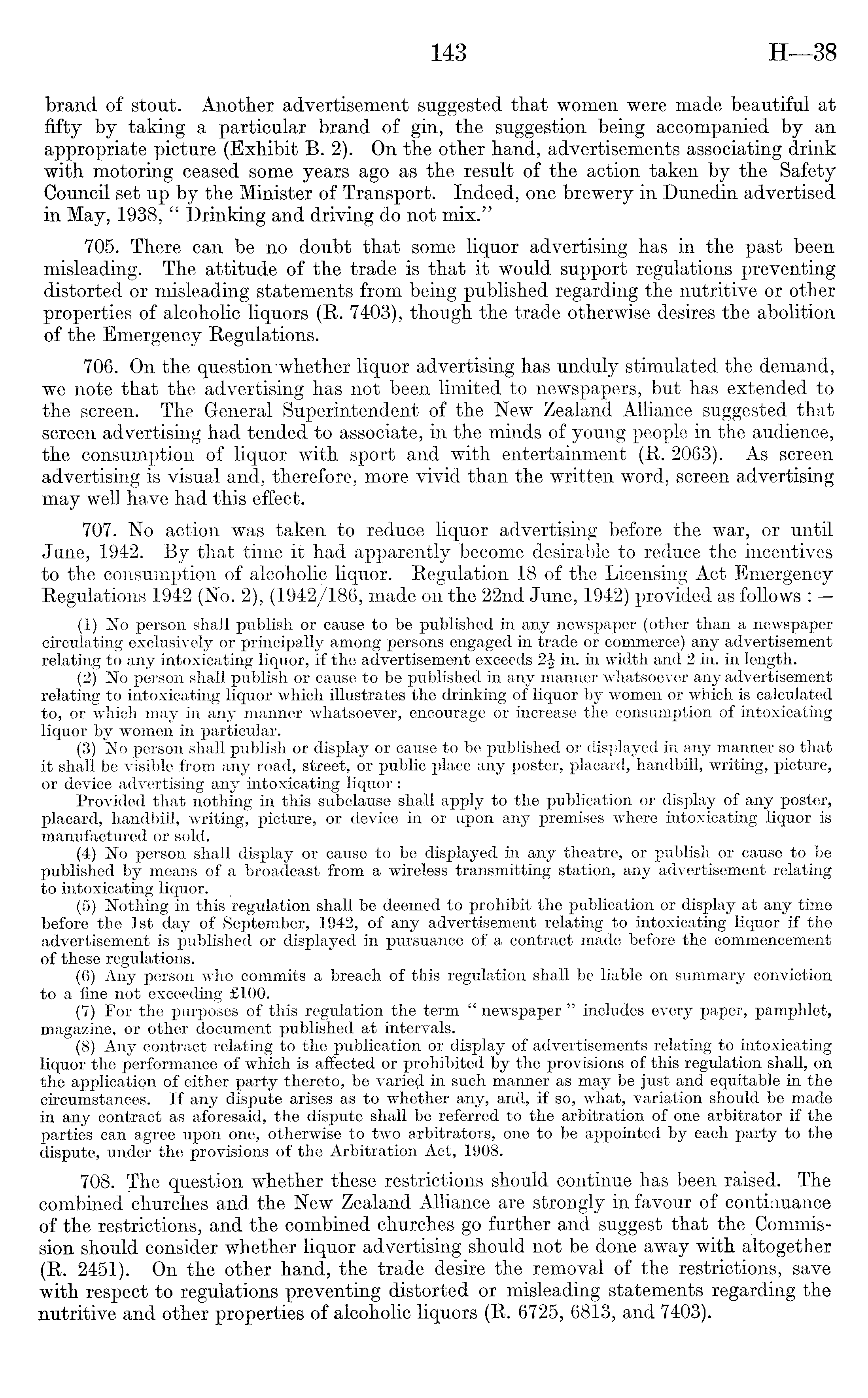 brand of stout. Another advertisement suggested that women were made beautiful at fifty by taking a particular brand of gin, the suggestion being accompanied by an appropriate picture (Exhibit B. 2). On the other hand, advertisements associating drink with motoring ceased some years ago as the result of the action taken by the Safety Council set up by the Minister of Transport. Indeed, one brewery in Dunedin advertised in May, 1938, " Drinking and driving do not mix." 705. There can be no doubt that some liquor advertising has in the past been misleading. The attitude of the trade is that it would support regulations preventing distorted or misleading statements from being published regarding the nutritive or other properties of alcoholic liquors (R. 7403), though the trade otherwise desires the abolition of the Emergency Regulations. 706. On the question whether liquor advertising has unduly stimulated the demand, we note that the advertising has not been limited to newspapers, but has extended to the screen. The General Superintendent of the New Zealand Alliance suggested that screen advertising had tended to associate, in the minds of young people in the audience, the consumption of liquor with sport and with entertainment (R. 2063). As screen advertising is visual and, therefore, more vivid than the written word, screen advertising may well have had this effect. 707. No action was taken to reduce liquor advertising before the war, or until June, 1942. By that time it had apparently become desirable to reduce the incentives to the consumption of alcoholic liquor. Regulation 18 of the Licensing Act Emergency Regulations 1942 (No. 2), (1942/186, made on the 22nd June, 1942) provided as follows : (1) No person shall publish or cause to be published in any newspaper (other than a newspaper circulating exclusively or principally among persons engaged in trade or commerce) any advertisement relating to any intoxicating liquor, if the advertisement exceeds in. in width and 2 in. in length. (2) No person shall publish or cause to be published in any manner whatsoever any advertisement relating to intoxicating liquor which illustrates the drinking of liquor by women or which is calculated to, or which may in any manner whatsoever, encourage or increase the consumption of intoxicating liquor by women in particular. (3) No person shall publish or display or cause to be published or displayed in any manner so that it shall be visible from any road, street, or public place any poster, placard, handbill, writing, picture, or device advertising any intoxicating liquor: Provided that nothing in this subclause shall apply to the publication or display of any poster, placard, handbill, writing, picture, or device in or upon any premises where intoxicating liquor is manufactured or sold. (4) No person shall display or cause to be displayed in any theatre, or publish or cause to be published by means of a, broadcast from a wireless transmitting station, any advertisement relating to intoxicating liquor. (5) Nothing in this regulation shall be deemed to prohibit the publication or display at any time before the Ist day of September, 1942, of any advertisement relating to intoxicating liquor if the advertisement is published or displayed in pursuance of a contract made before the commencement of these regulations. (6) Any person who commits a breach of this regulation shall be liable on summary conviction to a fine not exceeding £lOO. (7) For the purposes of this regulation the term " newspaper " includes every paper, pamphlet, magazine, or other document published at intervals. ' (8) Any contract relating to the publication or display of advertisements relating to intoxicating liquor the performance of which is affected or prohibited by the provisions of this regulation shall, on the application of either party thereto, be varied in such manner as may be just and equitable in the circumstances. If any dispute arises as to whether any, and, if so, what, variation should be made in any contract as aforesaid, the dispute shall be referred to the arbitration of one arbitrator if the parties can agree upon one, otherwise to two arbitrators, one to be appointed by each party to the dispute, under the provisions of the Arbitration Act, 1908. 708. The question whether these restrictions should continue has been raised. The combined churches and the New Zealand Alliance are strongly in favour of continuance of the restrictions, and the combined churches go further and suggest that the Commission should consider whether liquor advertising should not be done away with altogether (R. 2451). On the other hand, the trade desire the removal of the restrictions, save with respect to regulations preventing distorted or misleading statements regarding the nutritive and other properties of alcoholic liquors (R. 6725, 6813, and 7403).