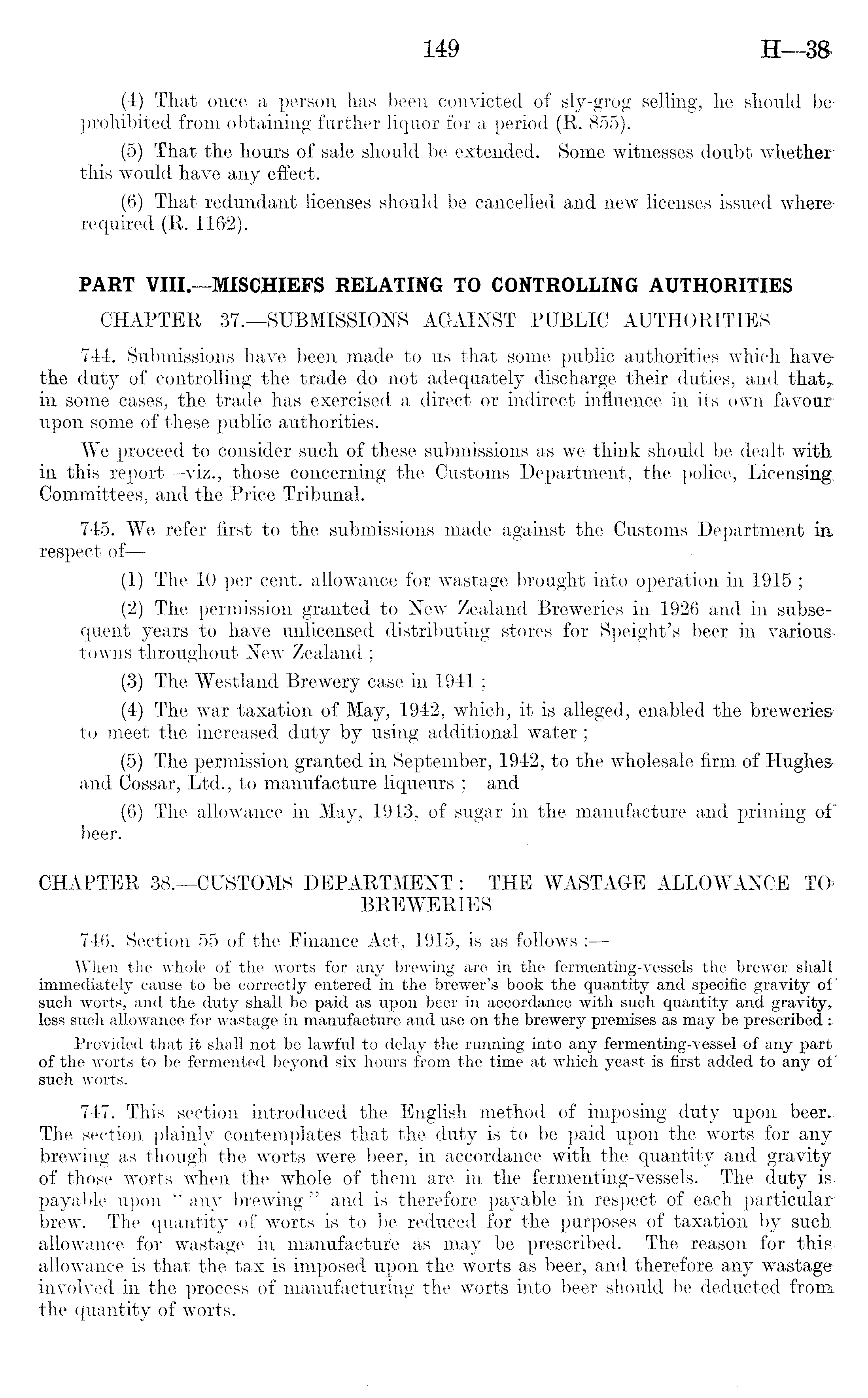 (4) That once a person lias been convicted of sly-grog selling, he should beprohibited from obtaining further liquor for a period (R. 855). (5) That the hours of sale should be extended. Some witnesses doubt whether this would have any effect. (6) That redundant licenses should be cancelled and new licenses issued whererequired (R. 116-2). PART VIII.—MISCHIEFS RELATING TO CONTROLLING AUTHORITIES CHAPTER 37.—SUBMISSIONS AGAINST PUBLIC AUTHORITIES 744. Submissions have been made to us that some public authorities which havethe duty of controlling the trade do not adequately discharge their duties, and that,, in some cases, the trade has exercised a direct or indirect influence in its own favour upon some of these public authorities. We proceed to consider such of these submissions as we think should be dealt with, in this report —viz., those concerning the Customs Department, the police, Licensing. Committees, and the Price Tribunal. 745. We refer first to the submissions made against the Customs Department in. respect of — (1) The 10 per cent, allowance for wastage brought into operation in 1915 ; (2) The permission granted to New Zealand Breweries in 1926 and in subsequent years to have unlicensed distributing stores for Speight's beer in varioustowns throughout New Zealand; (3) The Westland Brewery case in 1941 ; (4) The war taxation of May, 1942, which, it is alleged, enabled the breweriesto meet the increased duty by using additional water; (5) The permission granted in September, 1942, to the wholesale firm of Hughesand Cossar, Ltd., to manufacture liqueurs ; and (6) The allowance in May, 1943, of sugar in the manufacture and priming of beer. CHAPTER 38.—CUSTOMS DEPARTMENT : THE WASTAGE ALLOWANCE TO* BREWERIES 746. Section 55 of the Finance Act, 1915, is as follows : When the whole of the worts for any brewing are in the fermenting-vessels the brewer shall immediately cause to be correctly entered in the brewer's book the quantity and specific gravity of" such worts, and the duty shall be paid as upon beer in accordance with such quantity and gravity, less such allowance for wastage in manufacture and use on the brewery premises as may be prescribed r Provided that it shall not be lawful to delay the running into any fermenting-vessel of any part of the worts to be fermented beyond six hours from the time at which yeast is first added to any of such worts. 747. This section introduced the English method of imposing duty upon The section plainly contemplates that the duty is to be paid upon the worts for any brewing as though the worts were beer, in accordance with the quantity and gravity of those worts when the whole of them are in the fermenting-vessels. The duty ispayable upon " any brewing " and is therefore payable in respect of each particular brew. The quantity of worts is to be reduced for the purposes of taxation by such allowance for wastage in manufacture' as may be prescribed. The reason for thisallowance is that the tax is imposed upon the worts as beer, and therefore any wastages involved in the process of manufacturing the worts into beer should be deducted from, the quantity of worts.