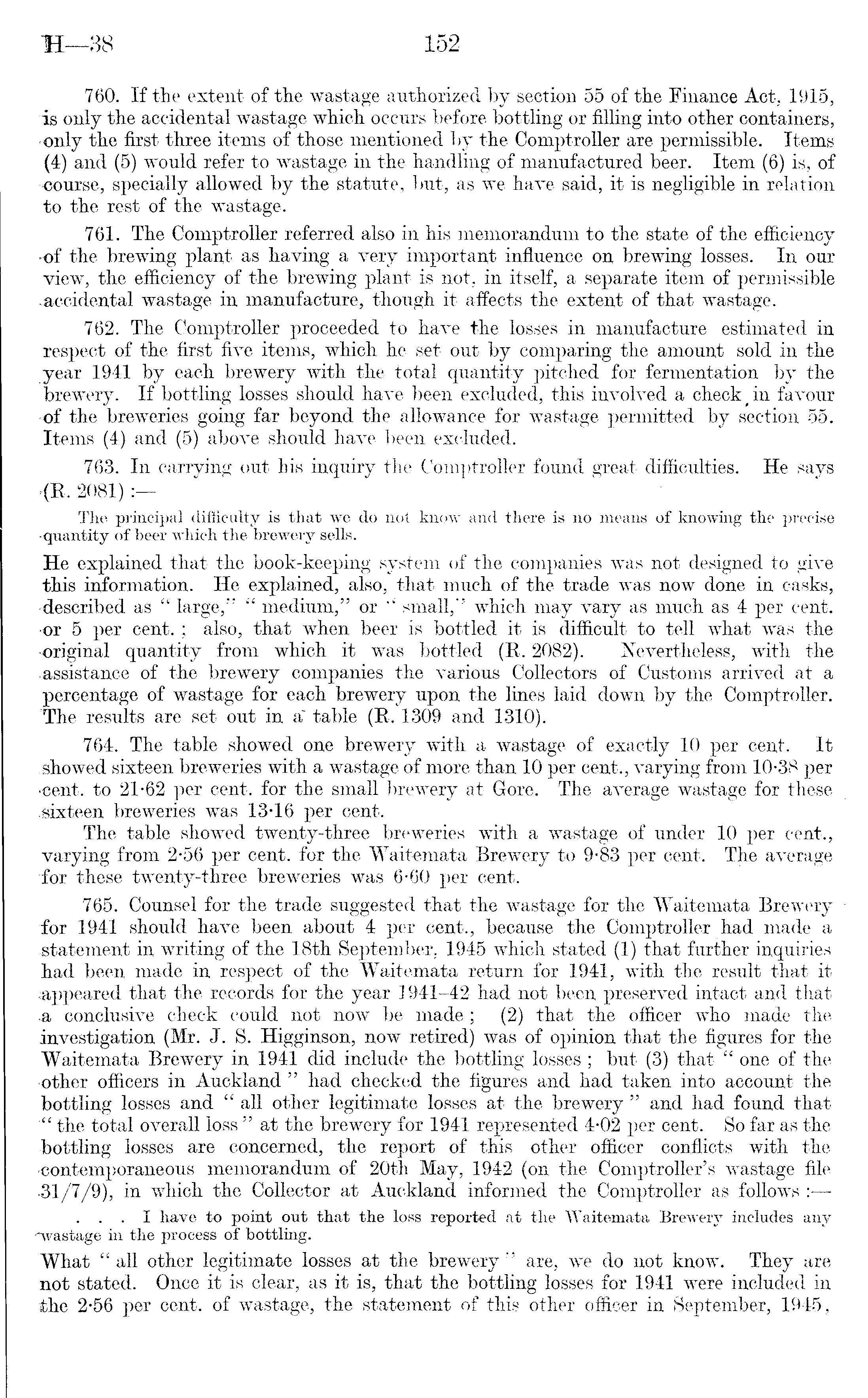 760. If the extent of the wastage authorized by section 55 of the Finance Act, 1915, is only the accidental wastage which occurs before bottling or filling into other containers, -only the first three items of those mentioned by the Comptroller are permissible. Items -(4) and (5) would refer to wastage in the handling of manufactured beer. Item (6) is, of -course, specially allowed by the statute, bnt, as we have said, it is negligible in relation to the rest of the wastage. 761. The Comptroller referred also in his memorandum to the state of the efficiency ■of the brewing plant as having a very important influence on brewing losses. In our view, the efficiency of the brewing plant is not, in itself, a separate item of permissible -accidental wastage in manufacture, though it affects the extent of that wastage. 762. The Comptroller proceeded to have the losses in manufacture estimated in Tespect of the first five items, which he set out by comparing the amount sold in the year 1941 by each brewery with the total quantity pitched for fermentation by the brewery. If bottling losses should have been excluded, this involved a check ( in favour -of the breweries going far beyond the allowance for wastage permitted by section 55. Items (4) and (5) above should have been excluded. 763. In carrying out his inquiry the Comptroller found great difficulties. He says <R. 2081): — The principal difficulty is that we do not know and there is no means of knowing the precise -quantity of beer which the brewery sells. He explained that the book-keeping system of the companies was not designed to give this information. He explained, also, that much of the trade was now done in casks, -described as " large," " medium," or " small," which may vary as much as 4 per cent, •or 5 per cent. ; also, that when beer is bottled it is difficult to tell what was the original quantity from which it was bottled (R. 2082). Nevertheless, with the -assistance of the brewery companies the various Collectors of Customs arrived ,at a percentage of wastage for each brewery upon the lines laid down by the Comptroller. The results are set out in aT table (R. 1309 and 1310). 764. The table showed one brewery with a wastage of exactly 10 per cent. It sixteen breweries with a wastage of more than 10 per cent., varying from 10-38 per -cent, to 21*62 per cent, for the small brewery at Gore. The average wastage for these .sixteen breweries was 13*16 per cent. The table showed twenty-three breweries with a wastage of under 10 per cent.,, varying from 2*56 per cent, for the Waitemata Brewery to 9*83 per cent. The average for these twenty-three breweries was 6*60 per cent. 765. Counsel for the trade suggested that the wastage for the Waitemata Brewery for 1941 should have been about 4 per cent., because the Comptroller had made a .statement in writing of the 18th September, 1945 which stated (1) that further inquiries liad been made in respect of the Waitemata return for 1941, with the result that it that the records for the year 1941-42 had not been preserved intact and that ■a conclusive check could not now be made ; (2) that the officer who made the investigation (Mr. J. S. Higginson, now retired) was of opinion that the figures for the Waitemata Brewery in 1941 did include the bottling losses ; but (3) that " one of the other officers in Auckland " had checked the figures and had taken into account the bottling losses and " all other legitimate losses at the brewery " and had found that the total overall loss "at the brewery for 1941 represented 4*02 per cent. So far as the bottling losses are concerned, the report of this other officer conflicts with the ■contemporaneous memorandum of 20th May, 1942 (on the Comptroller's wastage file •31 /7/9), in which the Collector at Auckland informed the Comptroller as follows : . . . I have to point out that the loss reported at the Waitemata Brewery includes any 'Wastage in the process of bottling. What " all other legitimate losses at the brewery " are, we do not know. They are not stated. Once it is clear, as it is, that the bottling losses for 1941 were included in the 2*56 per cent, of wastage, the statement of this other officer in September, 1945,