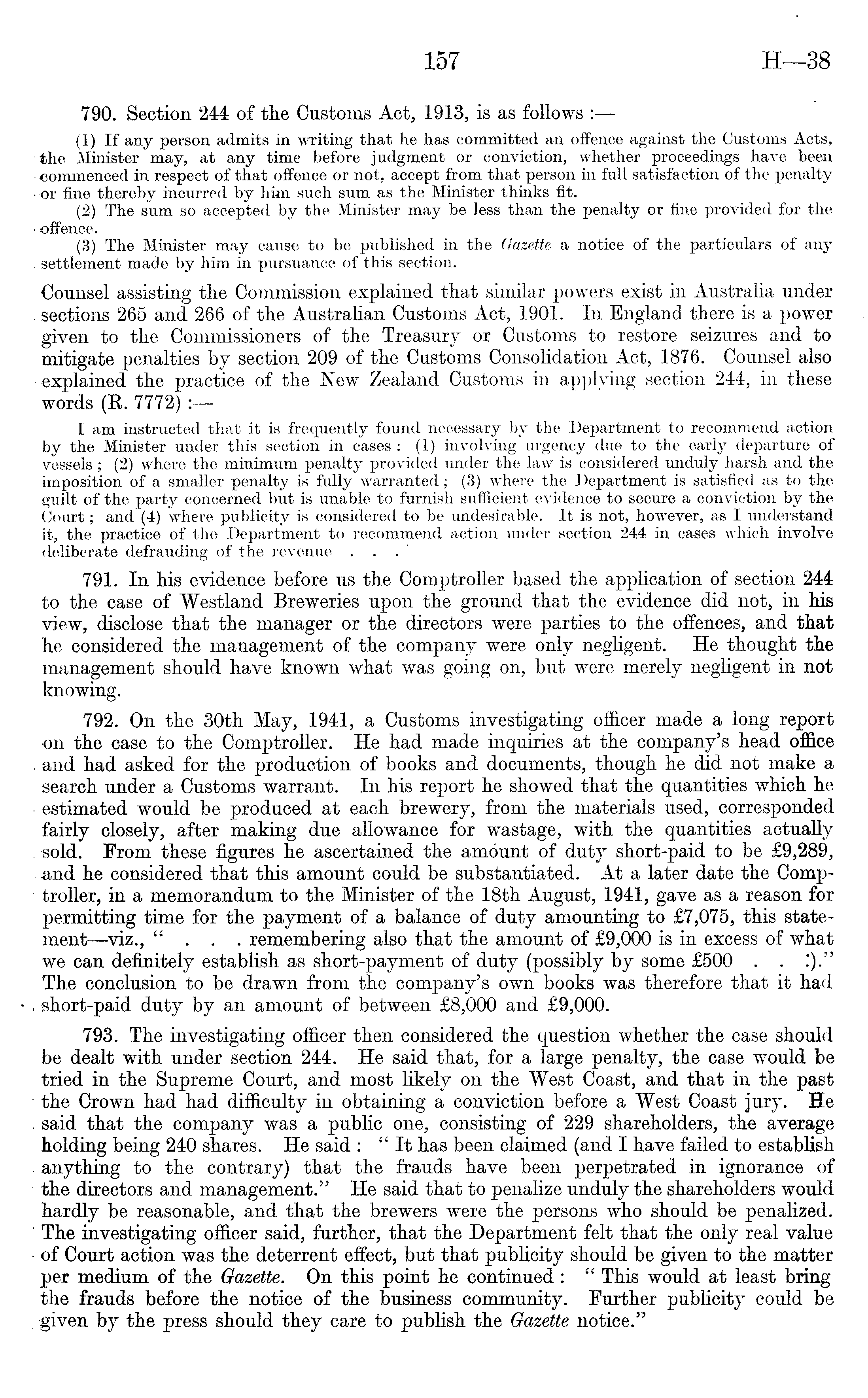 790. Section 244 of the Customs Act, 1913, is as follows : (1) If any person admits in writing that he has committed an offence against the Customs Acts, the Minister may, at any time before judgment or conviction, whether proceedings have been commenced in respect of that offence or not, accept from that person in full satisfaction of the penalty or fine thereby incurred by him such sum as the Minister thinks fit. (2) The sum so accepted by the Minister may be less than the penalty or fine provided for the offence. (3) The Minister may cause to be published in the Gazette a notice of the particulars of any settlement made by him in pursuance of this section. Counsel assisting the Commission explained that similar powers exist in Australia under sections 265 and 266 of the Australian Customs Act, 1901. In England there is a power given to the Commissioners of the Treasury or Customs to restore seizures and to mitigate penalties by section 209 of the Customs Consolidation Act, 1876. Counsel also explained the practice of the New Zealand Customs in applying section 244, in these words (R. 7772) I am instructed that it is frequently found necessary by the Department to recommend action by the Minister under this section in cases : (1) involving urgency due to the early departure of vessels; (2) where the minimum penalty provided under the law is considered unduly harsh and the imposition of a smaller penalty is fully warranted; (3) where the Department is satisfied as to the guilt of the party concerned but is unable to furnish sufficient evidence to secure a conviction by the <3ourt; and (4) where publicity is considered to be undesirable. It is not, however, as I understand it, the practice of the Department to recommend action under section 244 in cases which involve deliberate defrauding of the revenue . . . 791. In his evidence before us the Comptroller based the application of section 24:4 to the case of Westland Breweries upon the ground that the evidence did not, in his view, disclose that the manager or the directors were parties to the offences, and that he considered the management of the company were only negligent. He thought the management should have known what was going on, but were merely negligent in not knowing. 792. On the 30th May, 1941, a Customs investigating officer made a long report on the case to the Comptroller. He had made inquiries at the company's head office and had asked for the production of books and documents, though he did not make a search under a Customs warrant. In his report he showed that the quantities which he estimated would be produced at each brewery, from the materials used, corresponded fairly closely, after making due allowance for wastage, with the quantities actually sold. From these figures he ascertained the amount of duty short-paid to be £9,289, and he considered that this amount could be substantiated. At a later date the Comptroller, in a memorandum to the Minister of the 18th August, 1941, gave as a reason for permitting time for the payment of a balance of duty amounting to £7,075, this statement —viz., "... remembering also that the amount of £9,000 is in excess of what we can definitely establish as short-payment of duty (possibly by some £5OO . . The conclusion to be drawn from the company's own books was therefore that it had short-paid duty by an amount of between £B,OOO and £9,000. 793. The investigating officer then considered the question whether the case should be dealt with under section 244. He said that, for a large penalty, the case would be tried in the Supreme Court, and most likely on the West Coast, and that in the past the Crown had had difficulty in obtaining a conviction before a West Coast jury. He said that the company was a public one, consisting of 229 shareholders, the average holding being 240 shares. He said : "It has been claimed (and I have failed to establish anything to the contrary) that the frauds have been perpetrated in ignorance of the directors and management." He said that to penalize unduly the shareholders would hardly be reasonable, and that the brewers were the persons who should be penalized. The investigating officer said, further, that the Department felt that the only real value of Court action was the deterrent effect, but that publicity should be given to the matter per medium of the Gazette. On this point he continued : " This would at least bring the frauds before the notice of the business community. Further publicity could be •given by the press should they care to publish the Gazette notice."