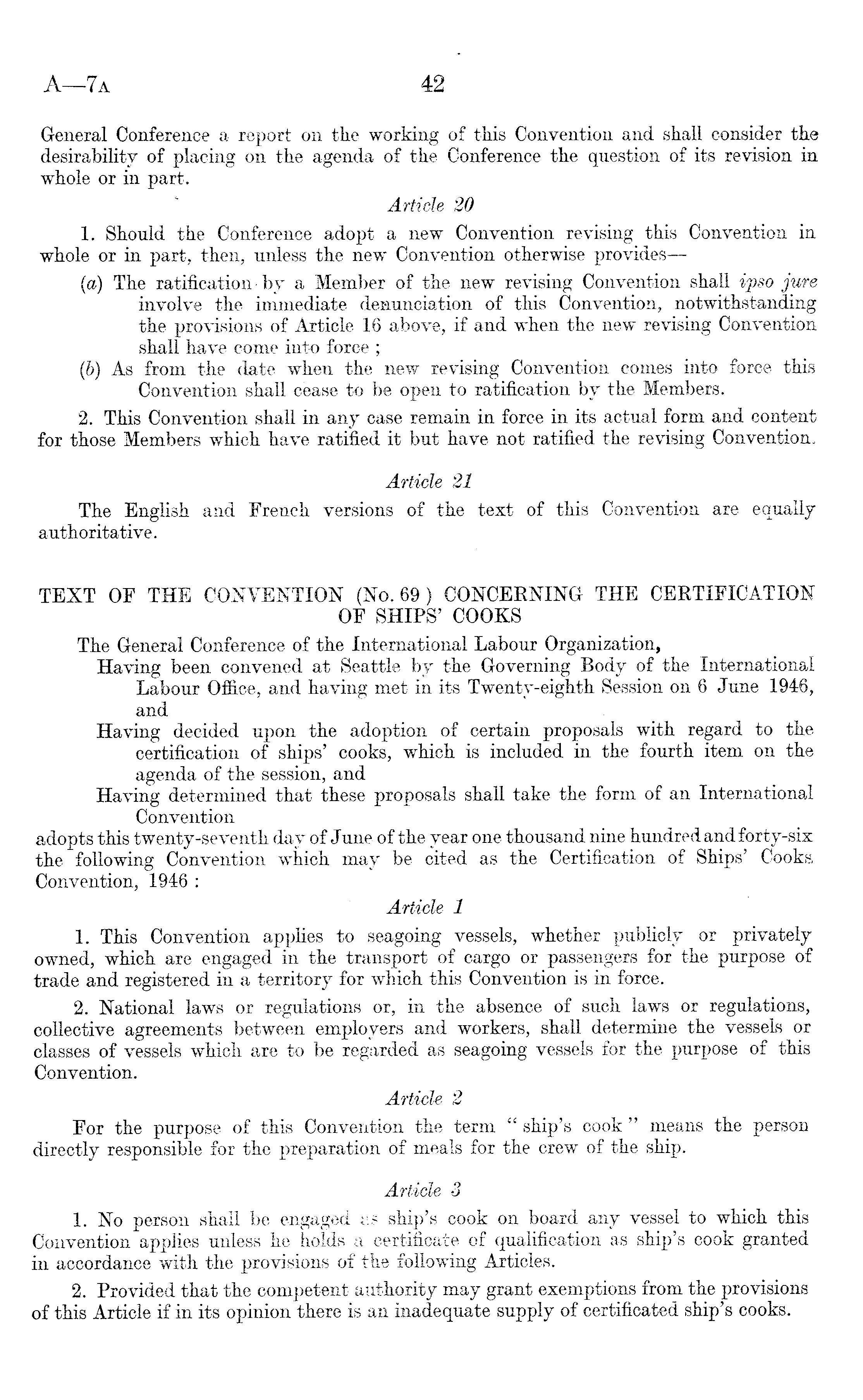 General Conference a report on the working of this Convention and shall consider the desirability of placing on the agenda of the Conference the question of its revision in whole or in part. Article 20 1. Should the Conference adopt a new Convention revising this Convention in whole or in part, then, unless the new Convention otherwise provides—(a) The ratification-by a Member of the new revising Convention shall ipso jure involve the immediate denunciation of this Convention, notwithstanding the provisions of Article 16 above, if and when the new revising Convention shall have come into force ; (b) As from the date when the new revising Convention comes into force this Convention shall cease to be open to ratification by the Members. 2. This Convention shall in any case remain in force in its actual form and content for those Members which have ratified it but have not ratified the revising Convention. Article 21 The English and French versions of the text of this Convention are equally authoritative. TEXT OF THE CONVENTION (No. 69 ) CONCERNING THE CERTIFICATION OF SHIPS' COOKS The General Conference of the International Labour Organization, Having been convened at Seattle by the Governing Body of the International Labour Office, and having met in its Twenty-eighth Session on 6 June 1946, and Having decided upon the adoption of certain proposals with regard to the certification of ships' cooks, which is included in the fourth item on the agenda of the session, and Having determined that these proposals shall take the form of an International Convention adopts this twenty-seventh day of June of the year one thousand nine hundred and forty-six the following Convention which may be cited as the Certification of Ships' Cooks Convention, 1946 : Article 1 1. This Convention applies to seagoing vessels, whether publicly or privately owned, which are engaged in the transport of cargo or passengers for the purpose of trade and registered in a territory for which this Convention is in force. 2. National laws or regulations or, in the absence of such laws or regulations, collective agreements between employers and workers, shall determine the vessels or classes of vessels which are to be regarded as seagoing vessels for the purpose of this Convention. Article 2 For the purpose of this Convention the term " ship's cook " means the person directly responsible for the preparation of meals for . the crew of the ship. Article 3 1. No person shall be engaged as ship's cook on board any vessel to which this Convention applies unless he holds a certificate of qualification as ship's cook granted in accordance with the provisions of the following Articles. 2. Provided that the competent authority may grant exemptions from the provisions of this Article if in its opinion there is an inadequate supply of certificated ship's cooks.