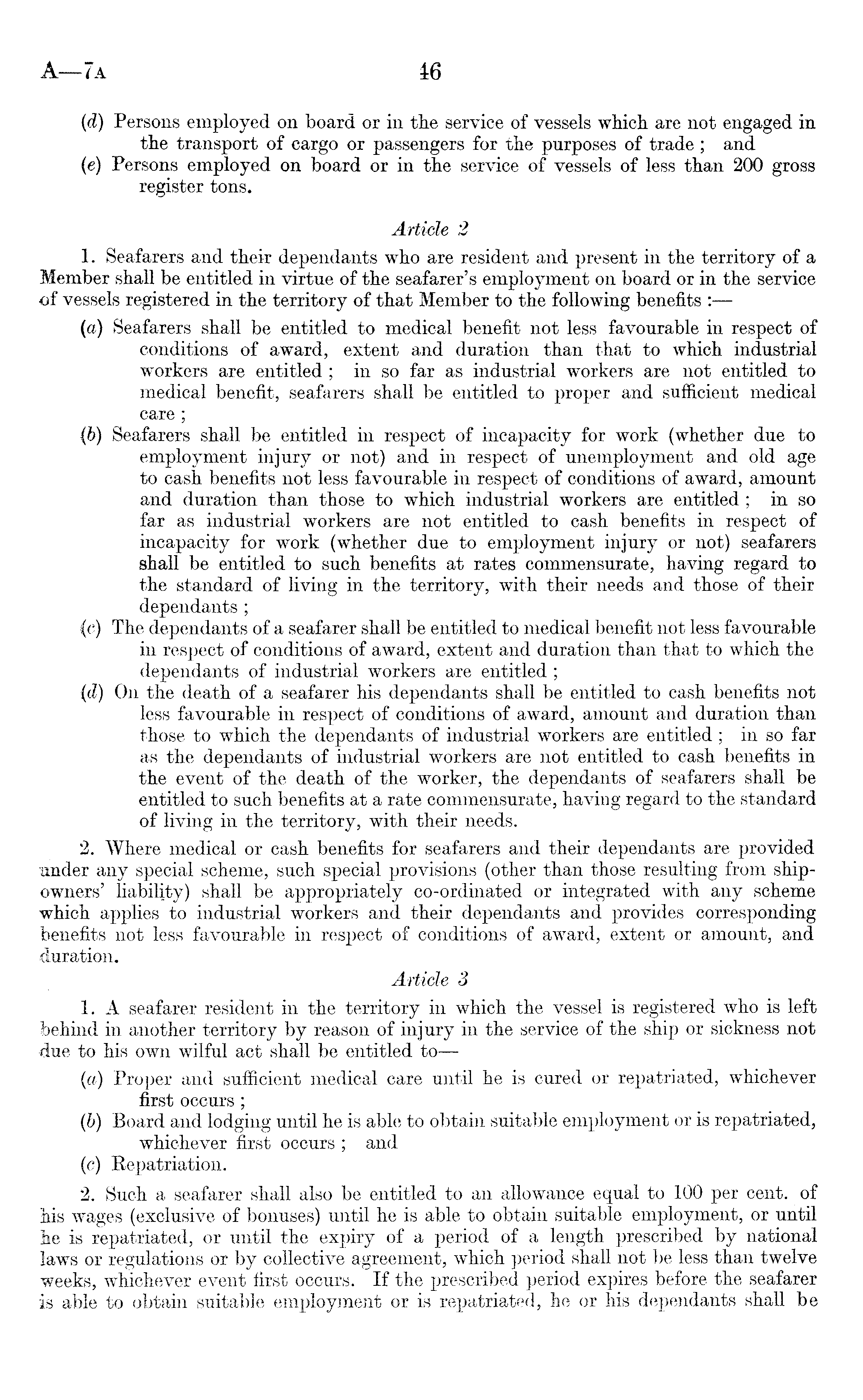 (d) Persons employed on board or in the service of vessels which are not engaged in the transport of cargo or passengers for the purposes of trade ; and (e) Persons employed on board or in the service of vessels of less than 200 gross register tons. Article 2 1. Seafarers and their dependants who are resident and present in the territory of a Member shall be entitled in virtue of the seafarer's employment on board or in the service of vessels registered in the territory of that Member to the following benefits : (a) Seafarers shall be entitled to medical benefit not less favourable in respect of conditions of award, extent and duration than that to which industrial workers are entitled ; in so far as industrial workers are not entitled to medical benefit, seafarers shall be entitled to proper and sufficient medical care; (b) Seafarers shall be entitled in respect of incapacity for work (whether due to employment injury or not) and in respect of unemployment and old age to cash benefits not less favourable in respect of conditions of award, amount and duration than those to which industrial workers are entitled ; in so far as industrial workers are not entitled to cash benefits in respect of incapacity for work (whether due to employment injury or not) seafarers shall be entitled to such benefits at rates commensurate, having regard to the standard of living in the territory, with their needs and those of their dependants ; (c) The dependants of a seafarer shall be entitled to medical benefit not less favourable in respect of conditions of award, extent and duration than that to which the dependants of industrial workers are entitled ; (d) On the death of a seafarer his dependants shall be entitled to cash benefits not less favourable in respect of conditions of award, amount and duration than those to which the dependants of industrial workers are entitled; in so far as the dependants of industrial workers are not entitled to cash benefits in the event of the death of the worker, the dependants of seafarers shall be entitled to such benefits at a rate commensurate, having regard to the standard of living in the territory, with their needs. 2. Where medical or cash benefits for seafarers and their dependants are provided under any special scheme, such special provisions (other than those resulting from shipowners' liability) shall be appropriately co-ordinated or integrated with any scheme which applies to industrial workers and their dependants and provides corresponding benefits not less favourable in respect of conditions of award, extent or amount, and duration. Article 3 1. A seafarer resident in the territory in which the vessel is registered who is left behind in another territory by reason of injury in the service of the ship or sickness not due to his own wilful act shall be entitled to — (a) Proper and sufficient medical care until he is cured or repatriated, whichever first occurs ; (b) Board and lodging until he is able to obtain suitable employment or is repatriated, whichever first occurs ; and (c) Repatriation. 2. Such a seafarer shall also be entitled to an allowance equal to 100 per cent, of his wages (exclusive of bonuses) until he is able to obtain suitable employment, or until he is repatriated, or until the expiry of a period of a length prescribed by national laws or regulations or by collective agreement, which period shall not be less than twelve weeks, whichever event first occurs. If the prescribed period expires before the seafarer is able to obtain suitable employment or is repatriated, he or his dependants shall be