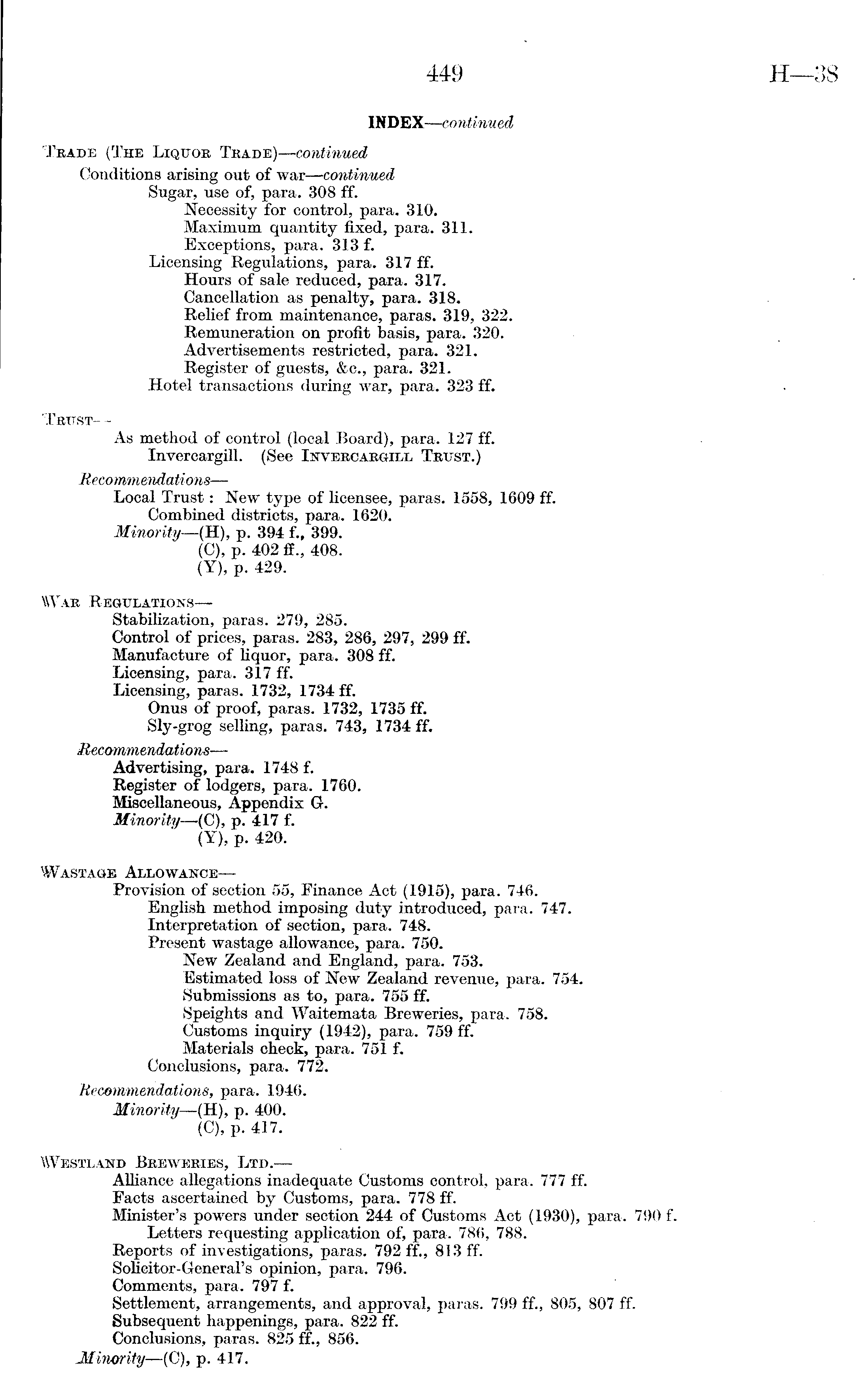 INDEX—continued Trade (The Liquor Trade) —continued Conditions arising out of war—continued Sugar, use of, para. 308 ff. Necessity for control, para. 310. Maximum quantity fixed, para. 311. Exceptions, para. 313 f. Licensing Regulations, para. 317 ff. Hours of sale reduced, para. 317. Cancellation as penalty, para. 318. Relief from maintenance, paras. 319, 322. Remuneration on profit basis, para. 320. Advertisements restricted, para. 321. Register of guests, &c., para. 321. Hotel transactions during war, para. 323 ff. Trust— As method of control (local Board), para. 127 ff. Invercargill. (See Invercargill Trust.) Recommendations— Local Trust: New type of licensee, paras. 1558, 1609 ff. Combined districts, para. 1620. Minority—(H), p. 394 f., 399. (C), p. 402 ff., 408. (Y), p. 429. War Regulations— Stabilization, paras. 279, 285. Control of prices, paras. 283, 286, 297, 299 ff. Manufacture of liquor, para. 308 ff. Licensing, para. 317 ff. Licensing, paras. 1732, 1734 ff. Onus of proof, paras. 1732, 1735 ff. Sly-grog selling, paras. 743, 1734 ff. ißecommendations Advertising, para. 1748 f. Register of lodgers, para. 1760. Miscellaneous, Appendix G. Minority—(C), p. 417 f. (Y), p. 420. Wastage Allowance— Provision of section 55, Finance Act (1915), para. 746. English method imposing duty introduced, para. 747. Interpretation of section, para. 748. Present wastage allowance, para. 750. New Zealand and England, para. 753. Estimated loss of New Zealand revenue, para. 754. Submissions as to, para. 755 ff. Speights and Waitemata Breweries, para. 758. Customs inquiry (1942), para. 759 ff. Materials check, para. 751 f. Conclusions, para. 772. Recommendations, para. 1946. Minority—(H), p. 400. (C), p. 417. Westland Breweries, Ltd. — Alliance allegations inadequate Customs control, para. 777 ff. Facts ascertained by Customs, para. 778 ff. Minister's powers under section 244 of Customs Act (1930), para. 790 f. Letters requesting application of, para. 786, 788. Reports of investigations, paras. 792 ff., 813 ff. Solicitor-General's opinion, para. 796. Comments, para. 797 f. Settlement, arrangements, and approval, paras. 799 ff., 805, 807 ff. Subsequent happenings, para. 822 ff. Conclusions, paras. 825 ff., 856. Minority—(C), p. 417.