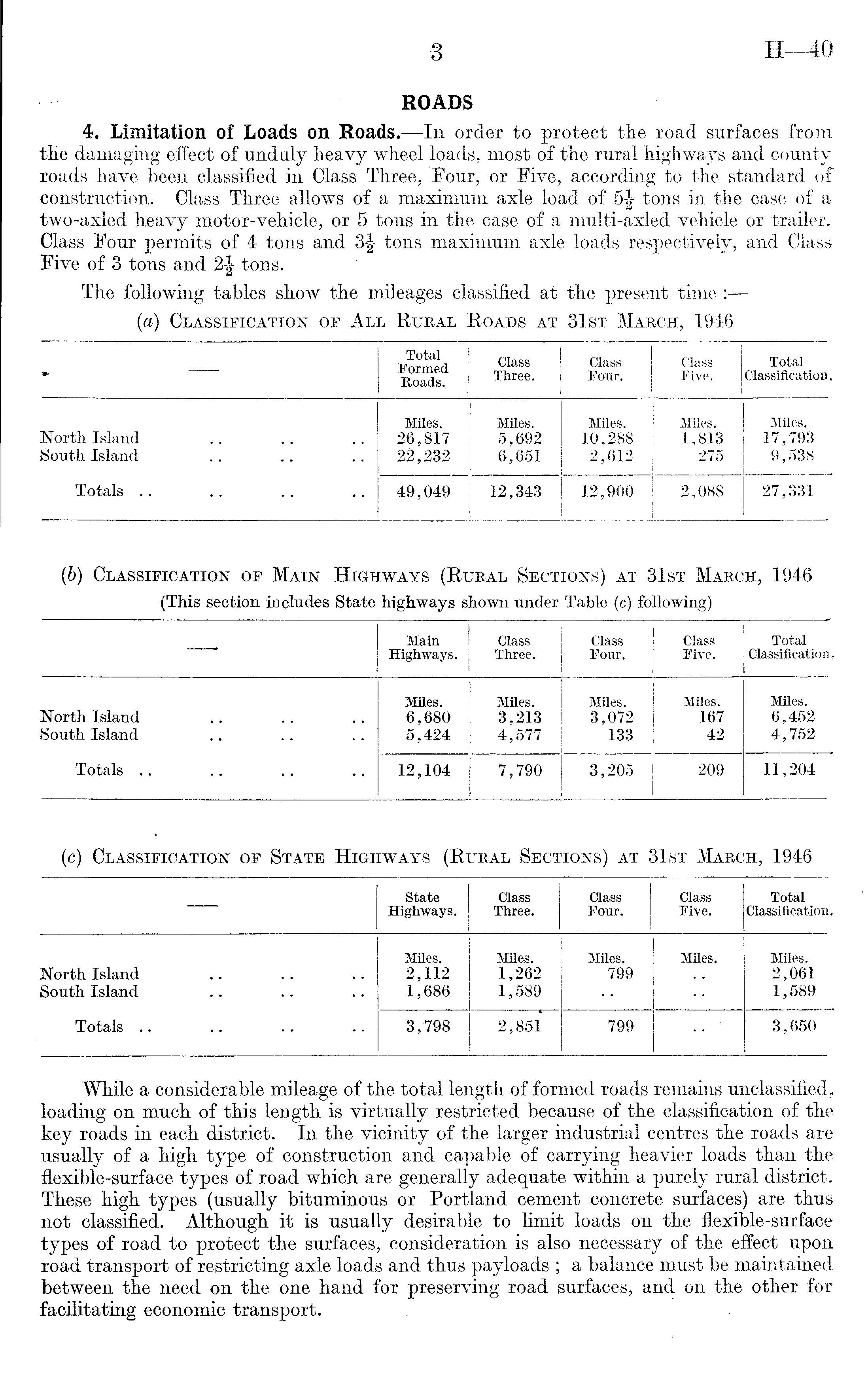 ROADS 4. Limitation of Loads on Roads. —In order to protect the road surfaces from the damaging effect of unduly heavy wheel loads, most of the rural highways and county roads have been classified in Class Three, Four, or Five, according to the standard of construction. Class Three allows of a maximum axle load of tons in the case of a two-axled heavy motor-vehicle, or 5 tons in the case of a multi-axled vehicle or trailer. Class Four permits of 4 tons and tons maximum axle loads respectively, and Class Five of 3 tons and tons. The following tables show the mileages classified at the present time :