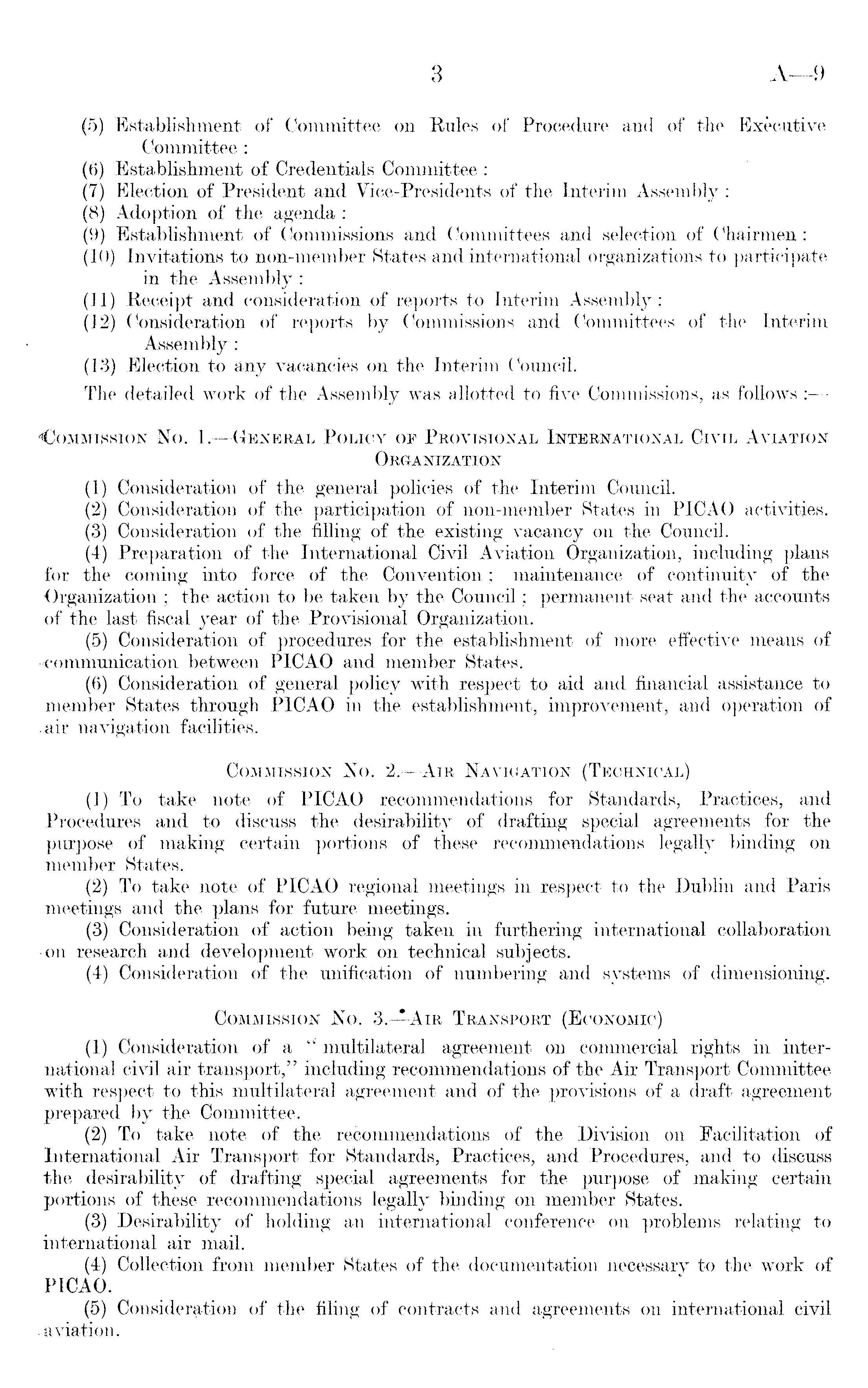 (5) Establishment of Committee on Rules of Procedure and of the Executive Committee : (6) Establishment of Credentials Committee : (7) Election of President and Vice-Presidents of the Interim Assembly : (8) Adoption of the agenda : (9) Establishment of Commissions and Committees and selection of Chairmen : (10) Invitations to non-member States and international organizations to participate in the Assembly : (11) Receipt and consideration of reports to Interim Assembly: (12) Consideration of reports by Commissions and Committees of the Interim Assembly : (13) Election to any vacancies on the Interim Council. The detailed work of the Assembly was allotted to five Commissions, as follows Commission No. I.—General Policy of Provisional International Civil Aviation Organization (1) Consideration of the general policies of the Interim Council. (2) Consideration of the participation of non-member States in PIC AO activities. (3) Consideration of the filling of the existing vacancy on the Council. (4) Preparation of the International Civil Aviation Organization, including plans for the coming into force of the Convention; maintenance of continuity of the Organization ; the action to be taken by the Council; permanent seat and the accounts -of the last fiscal year of the Provisional Organization. (5) Consideration of procedures for the establishment of more effective means of -communication between PICAO and member States. (6) Consideration of general policy with respect to aid and financial assistance to member States through PICAO in the establishment, improvement, and operation of ..air navigation facilities. Commission No. 2.—Air Navigation (Technical) (1) To take note of PICAO recommendations for Standards, Practices, and Procedures and to discuss the desirability of drafting special agreements for the purpose of making certain portions of these recommendations legally binding on member States. (2) To take note of PICAO regional meetings in respect to the Dublin and Paris meetings and the plans for future meetings. (3) Consideration of action being taken in furthering international collaboration -on research and development work on technical subjects. (4) Consideration of the unification of numbering and systems of dimensioning. Commission No. 3.—Air Transport (Economic) (1) Consideration of a " multilateral agreement on commercial rights in international civil air transport," including recommendations of the Air Transport Committee with respect to this multilateral agreement and of the provisions of a draft agreement prepared by the Committee. (2) To take note of the recommendations of the Division on Facilitation of International Air Transport for Standards, Practices, and Procedures, and to discuss the desirability of drafting special agreements for the purpose of making certain portions of these recommendations legally binding on member States. (3) Desirability of holding an international conference on problems relating to international air mail. (4) Collection from member States of the documentation necessary to the work of PICAO. (5) Consideration of the filing of contracts and agreements on international civil ..aviation.