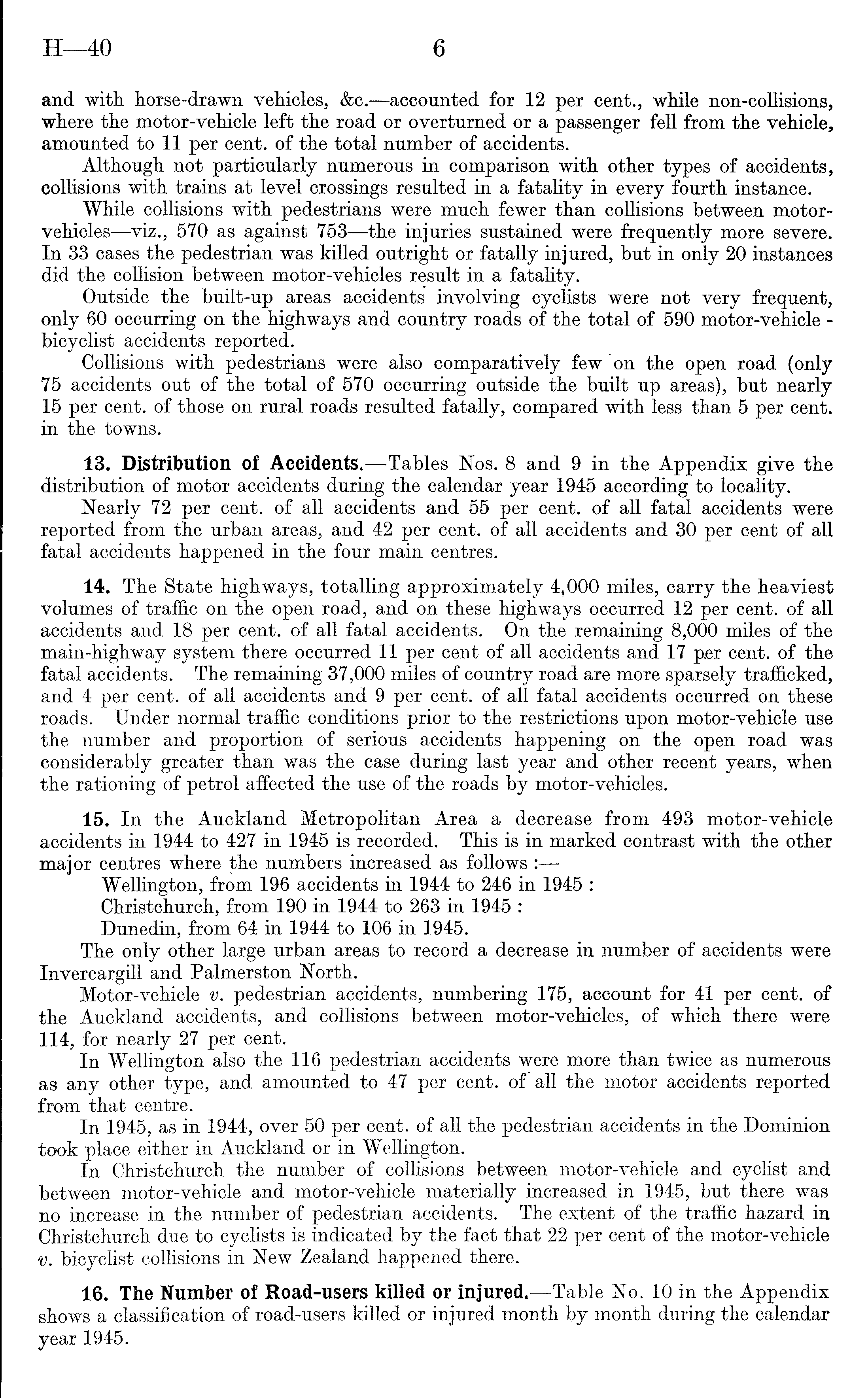 and with, horse-drawn vehicles, &c.—accounted for 12 per cent., while non-collisions, where the motor-vehicle left the road or overturned or a passenger fell from the vehicle, amounted to 11 per cent, of the total number of accidents. Although not particularly numerous- in comparison with other types of accidents, collisions with trains at level crossings resulted in a fatality in every fourth instance. While collisions with pedestrians were much fewer than collisions between motorvehicles—viz., 570 as against 753—the injuries sustained were frequently more severe. In 33 cases the pedestrian was killed outright or fatally injured, but in only 20 instances did the collision between motor-vehicles result in a fatality. Outside the built-up areas accidents involving cyclists were not very frequent, only 60 occurring on the highways and country roads of the total of 590 motor-vehicle - bicyclist accidents reported. Collisions with pedestrians were also comparatively few on the open road (only 75 accidents out of the total of 570 occurring outside the built up areas), but nearly 15 per cent, of those on rural roads resulted fatally, compared with less than 5 per cent, in the towns. 13. Distribution of Accidents. —Tables Nos. 8 and 9 in the Appendix give the distribution of motor accidents during the calendar year 1945 according to locality. Nearly 72 per cent, of all accidents and 55 per cent, of all fatal accidents were reported from the urban areas, and 42 per cent, of all accidents and 30 per cent of all fatal accidents happened in the four main centres. 14. The State highways, totalling approximately 4,000 miles, carry the heaviest volumes of traffic on the open road, and on these highways occurred 12 per cent, of all accidents and 18 per cent, of all fatal accidents. On the remaining 8,000 miles of the main-highway system there occurred 11 per cent of all accidents and 17 per cent, of the fatal accidents. The remaining 37,000 miles of country road are more sparsely trafficked, and 4 per cent, of all accidents and 9 per cent, of all fatal accidents occurred on these roads. Under normal traffic conditions prior to the restrictions upon motor-vehicle use the number and proportion of serious accidents happening on the open road was considerably greater than was the case during last year and other recent years, when the rationing of petrol affected the use of the roads by motor-vehicles. 15. In the Auckland Metropolitan Area a decrease from 493 motor-vehicle accidents in 1944 to 427 in 1945 is recorded. This is in marked contrast with the other major centres where the numbers increased as follows Wellington, from 196 accidents in 1944 to 246 in 1945 : Christchurch, from 190 in 1944 to 263 in 1945 : Dunedin, from 64 in 1944 to 106 in 1945. The only other large urban areas to record a decrease in number of accidents were Invercargill and Palmerston North. Motor-vehicle v. pedestrian accidents, numbering 175, account for 41 per cent, of the Auckland accidents, and collisions between motor-vehicles, of which there were 114, for nearly 27 per cent. In Wellington also the 116 pedestrian accidents were more than twice as numerous as any other type, and amounted to 47 per cent, of all the motor accidents reported from that centre. In 1945, as in 1944, over 50 per cent, of all the pedestrian accidents in the Dominion took place either in Auckland or in Wellington. In Christchurch the number of collisions between motor-vehicle and cyclist and between motor-vehicle and motor-vehicle materially increased in 1945, but there was no increase in the number of pedestrian accidents. The extent of the traffic hazard in Christchurch due to cyclists is indicated by the fact that 22 per cent of the motor-vehicle v. bicyclist collisions in New Zealand happened there. 16. The Number of Road-users killed or injured.—Table No. 10 in the Appendix shows a classification of road-users killed or injured month by month during the calendar year 1945.