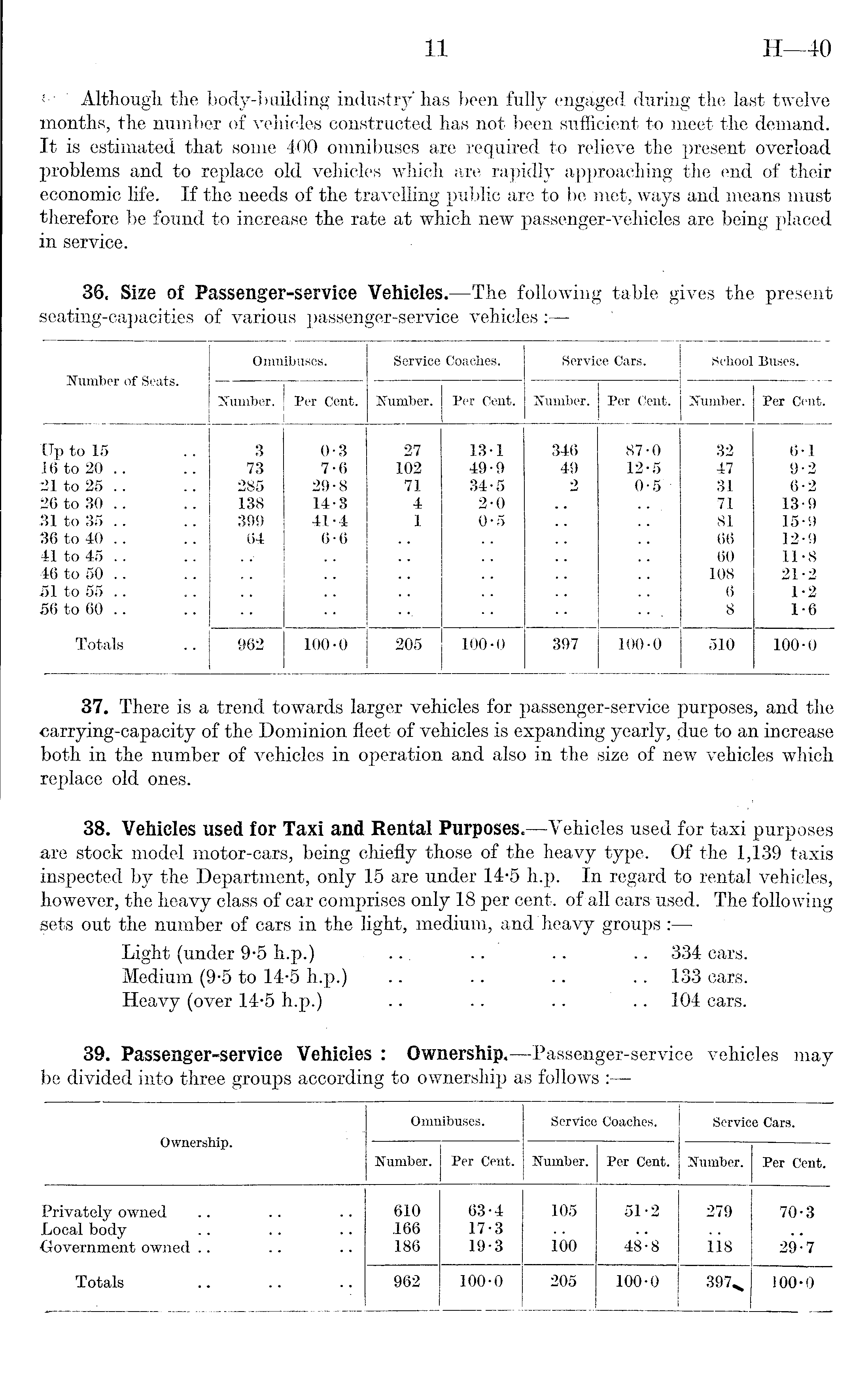 Although the body-building industry'has been fully engaged during the last twelve months, the number of vehicles constructed has not been sufficient to meet the demand. It is estimated that some 400 omnibuses are required to relieve the present Overload problems and to replace old vehicles which are rapidly approaching the end of their economic life. If the needs of the travelling public are to be met, ways and means must therefore be found to increase the rate at which new passenger-vehicles are being placed in service. 36. Size of Passenger-service Vehicles. —-The following table gives the present seating-capacities of various passenger-service vehicles: —
