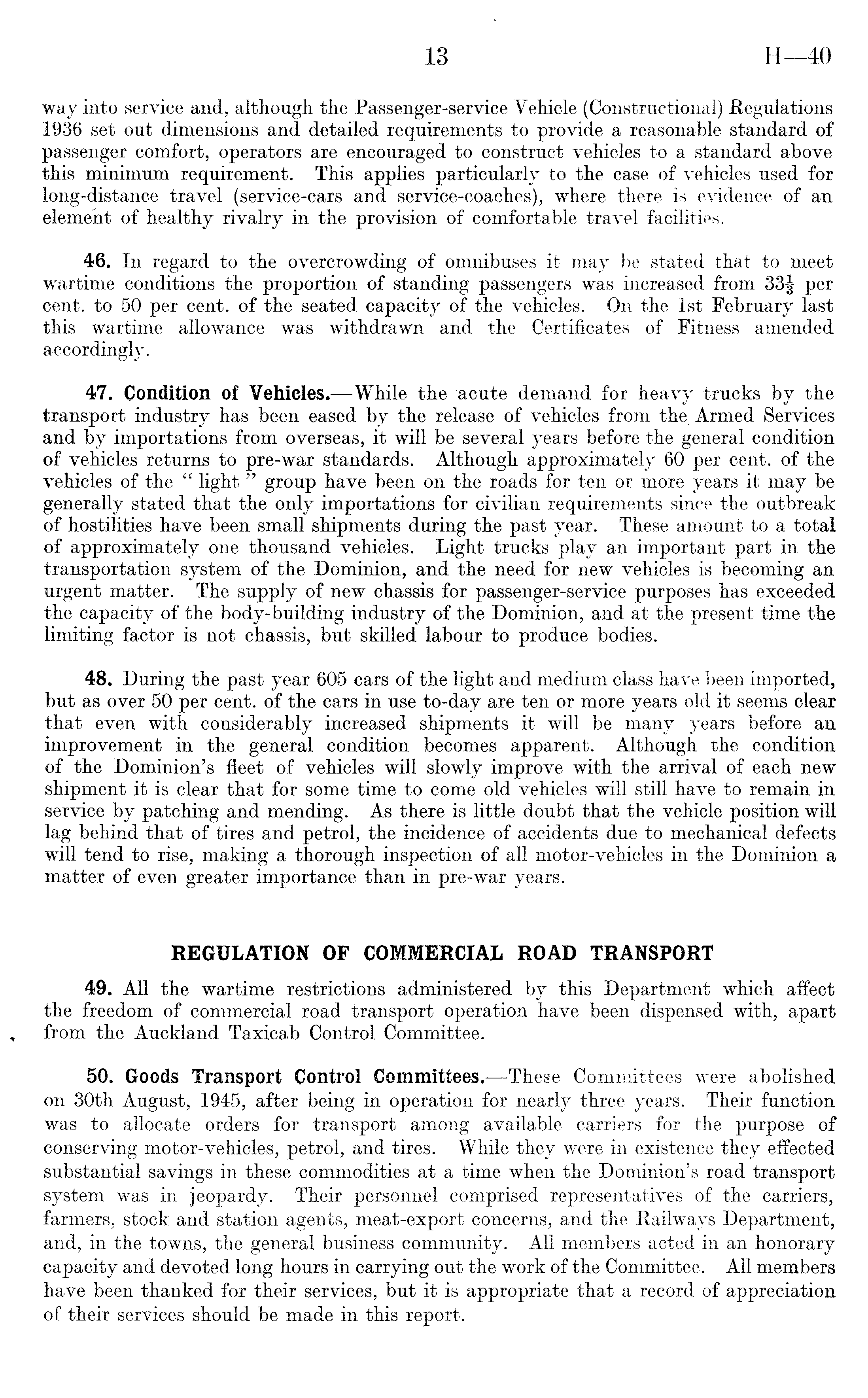 way into service and, although the Passenger-service Vehicle (Constructional) Regulations 1936 set out dimensions and detailed requirements to provide a reasonable standard of passenger comfort, operators are encouraged to construct vehicles to a standard above this minimum requirement. This applies particularly to the case of vehicles used for long-distance travel (service-cars and service-coaches), where there is evidence of an element of healthy rivalry in the provision of comfortable travel facilities. i 46. In regard to the overcrowding of omnibuses it may be stated that to meet wartime conditions the proportion of standing passengers was increased from 33J per cent, to 50 per cent, of the seated capacity of the vehicles. On the Ist February last this wartime allowance was withdrawn and the Certificates of Fitness amended accordingly. 47. Condition of Vehicles. —While the acute demand for heavy trucks by the transport industry has been eased by the release of vehicles from the Armed Services and by importations from overseas,' it will be several years before the general condition of vehicles returns to pre-war standards. Although approximately 60 per cent, of the vehicles of the " light " group have been on the roads for ten or more years it may be generally stated that the only importations for civilian requirements since the outbreak of hostilities have been small shipments during the past year. These amount to a total of approximately one thousand vehicles. Light trucks play an important part in the transportation system of the Dominion, and the need for new vehicles is becoming an urgent matter. The supply of new chassis for passenger-service purposes has exceeded the capacity of the body-building industry of the Dominion, and at the present time the limiting factor is not chassis, but skilled labour to produce bodies. 48. During the past year 605 cars of the light and medium class have been imported, but as over 50 per cent, of the dars in use to-day are ten or more years old it seems clear that even with considerably increased shipments it will be many years before an improvement in the general condition becomes apparent. Although the condition of the Dominion's fleet of vehicles will slowly improve with the arrival of each new shipment it is clear that for some time to come old vehicles will still have to remain in service by patching and mending. As there is little doubt that the vehicle position will lag behind that of tires and petrol, the incidence of accidents due to mechanical defects will tend to rise, making a thorough inspection of all motor-vehicles in the Dominion a matter of even greater importance than in pre-war years. REGULATION OF COMMERCIAL ROAD TRANSPORT 49. All the wartime restrictions administered by this Department which affect the freedom of commercial road transport operation have been dispensed with, apart from the Auckland Taxicab Control Committee. 50. Goods Transport Control Committees. —These Committees were abolished on 30th August, 1945, after being in operation for nearly three years. Their function was to allocate orders for transport among available carriers for the purpose of conserving motor-vehicles, petrol, and tires. While they were in existence they effected substantial savings in these commodities at a time when the Dominion's road transport system was in jeopardy. Their personnel comprised representatives of the carriers, farmers, stock and station agents, meat-export concerns, and the Railways Department, and, in the towns, the general business community. All members acted in an honorary capacity and devoted long hours in carrying out the work of the Committee. All members have been thanked for their services, but it is appropriate that a record of appreciation of their services should be made in this report.