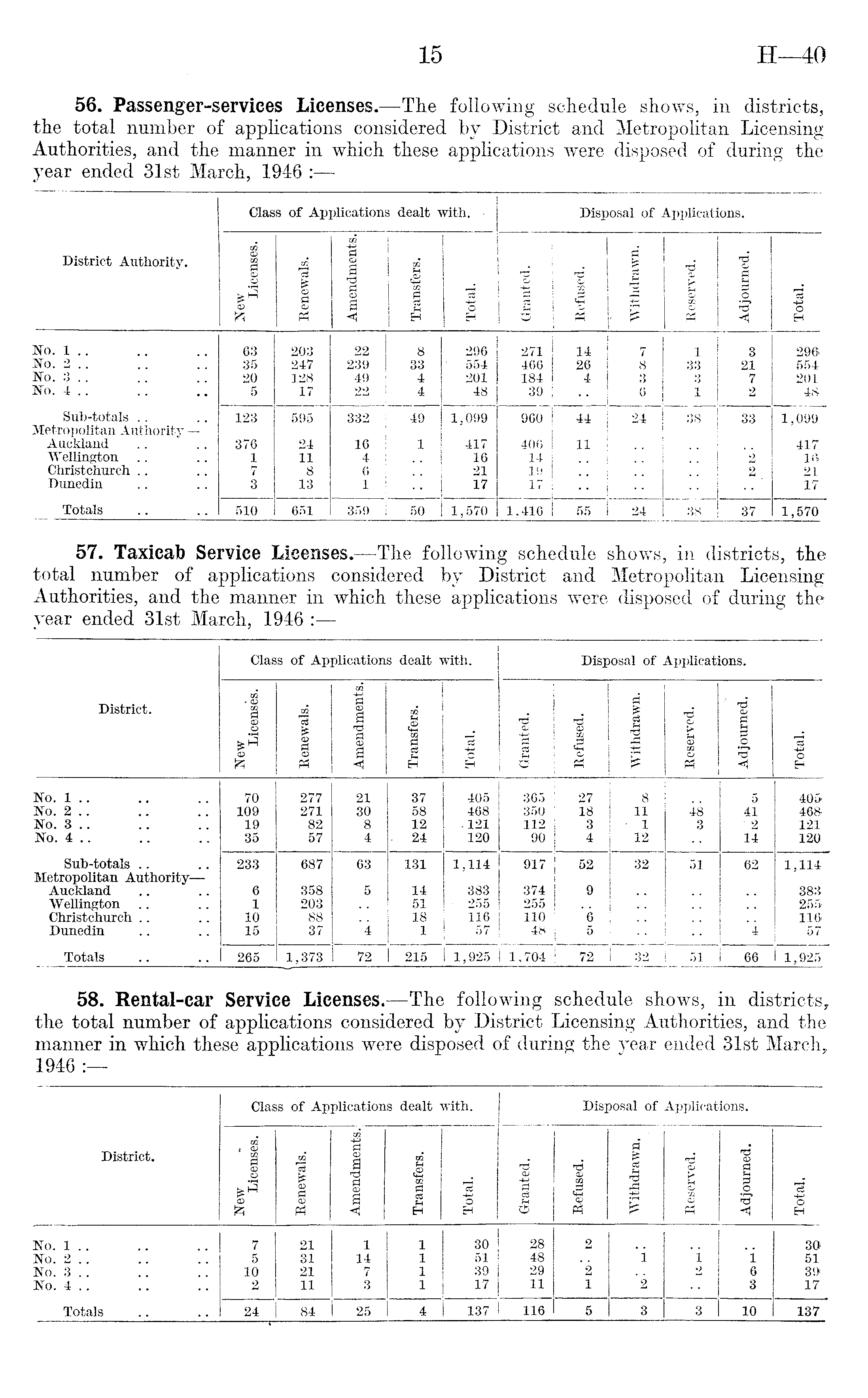 56. Passenger-services Licenses. —The following schedule shows, in districts, the total number of applications considered by District and Metropolitan Licensing Authorities, and the manner in which these applications were disposed of during the year ended 31st March, 1946 :