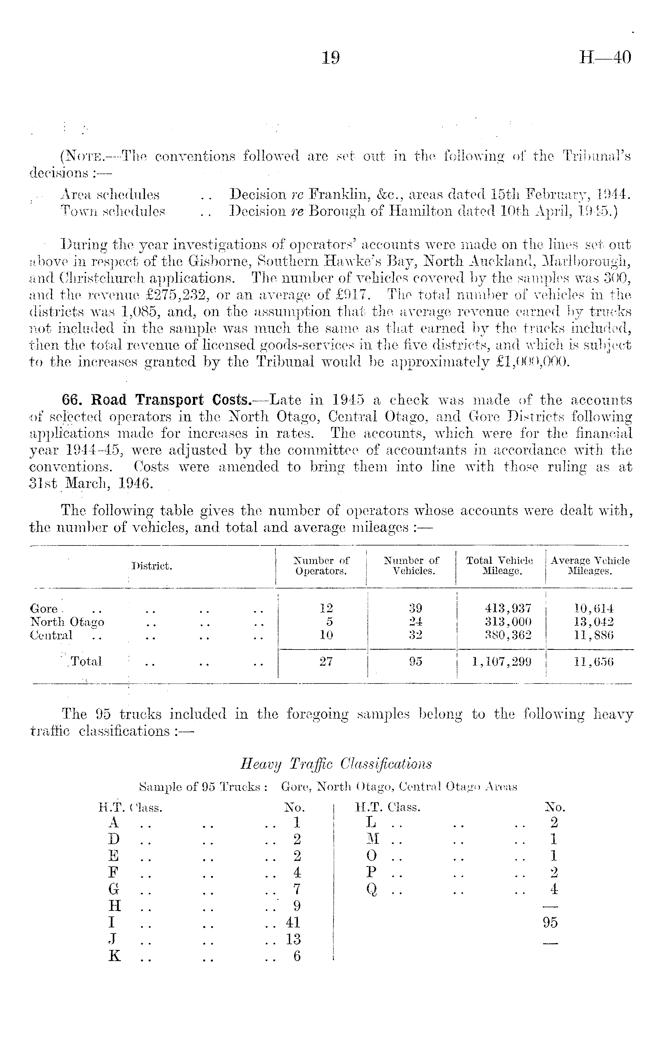 (Note. —The conventions followed are set out in the following of the Tribunal's decisions; — Area schedules .. Decision re Franklin, &c., areas dated 15th February, 1944. Town schedules .. Decision re Borough of Hamilton dated 10th April, 194-5.) During the year investigations of operators' accounts were made on the lines set out above in respect of the Grisborne, Southern Hawke's Bay, North Auckland, Marlborough, and Christchurch applications. The number of vehicles covered by the samples was 300, and the revenue £275,232, or an average of £917. The total number of vehicles in the districts was 1,085, and, on the assumption that the average revenue earned by trucks not included in the sample was much the same as that earned by the trucks included, then the total revenue of licensed goods-services in the five districts, and which is subject to the increases-granted by the Tribunal would be approximately £1,000,000. 66. Road Transport Costs. —Late in 1945 a check was made of the accounts of selected operators in the North Otago, Central Otago, and Gore Districts following applications made for increases in rates. The accounts, which were for the financial year 1944-45, were adjusted by the committee of accountants in accordance with the conventions. Costs were amended to bring them into line with those ruling as at 31st March, 1946. The following table gives the number of operators whose accounts were dealt with, the number of vehicles, and total and average mileages :