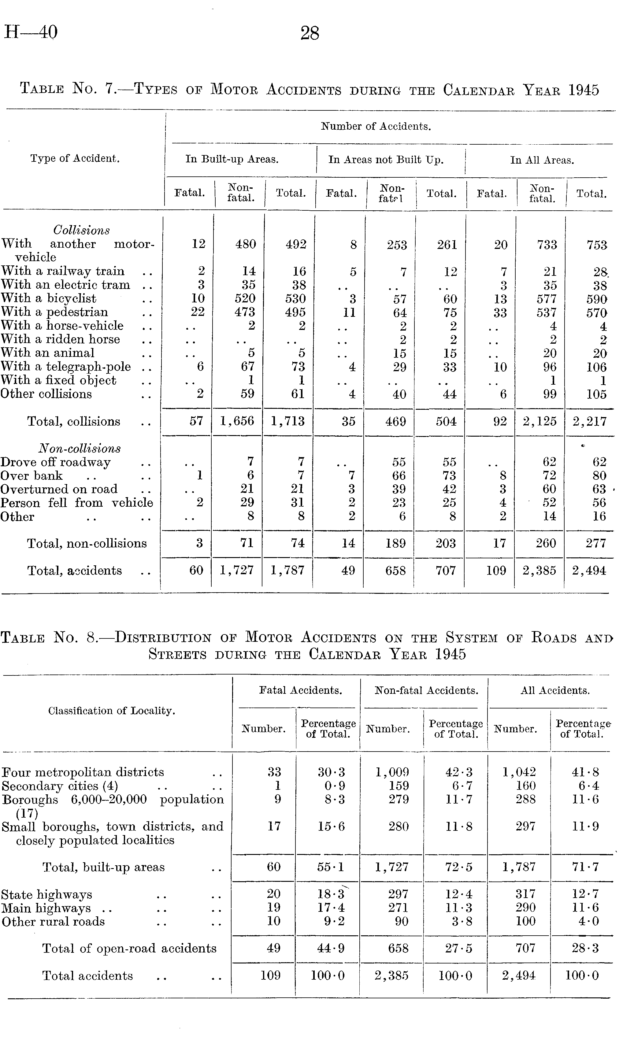 Table No. 8. —Distribution of Motor Accidents on the System of Roads and Streets during the Calendar Year 1945