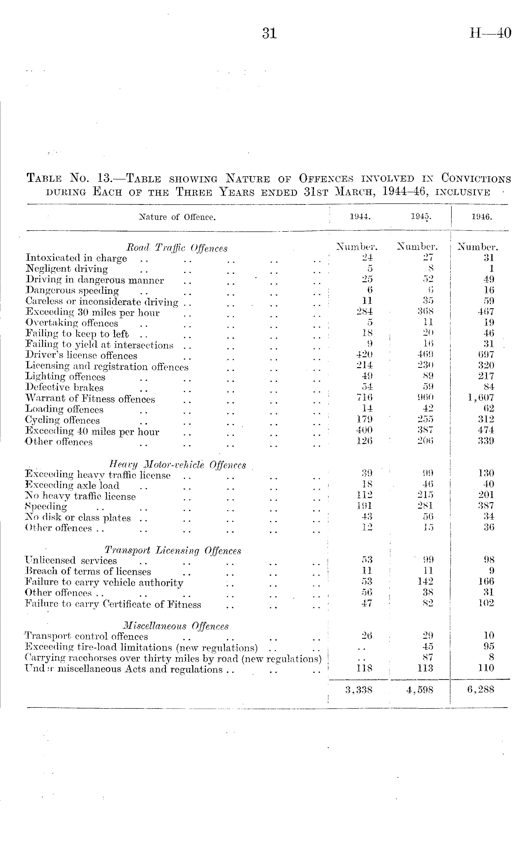 Nature of Offence. 1944. 1945. 1946. Road Traffic Offences Number. Number. Number. Intoxicated in charge 24 | 27 31 Negligent driving .. .. 5 8 1 Driving in dangercius manner .. .... 25 52 49 Dangerous speeding 6 6 16 Careless or inconsiderate driving 11 35 59 Exceeding 30 miles per hour 284 368 467 Overtaking offences 5 11 19 Failing to keep to left .. .. . „ 18 20 46 Failing to yield at intersections 9 16 31 . Driver's license offences 420 469 697 Licensing and registration offences .. .. ... 214 230 320 Lighting offences 49 j 89 217 Defective brakes 54 59 84 Warrant of Fitness offences 716 | 960 1,607 Loading offences .. .. .. .. 14 42 62 Cycling offences 179 i 255 312 Exceeding 40 miles per hour 400 387 474 Other offences 126 206 339 Heavy Motor-vehicle Offences Exceeding heavy traffic license 39 99 130 Exceeding axle load 18 46 40 No heavy traffic license 112 215 201 Speeding 191 281 387 No disk or class plates .. 43 56 34 Other offences 12 15 36 Transport Licensing Offences 53 ' 99 Unlicensed services 98 Breach of terms of licenses 11 11 9 Failure to carry vehicle authority 53 142 166 Other offences .. .. .. .. 56 38 31 Failure to carry Certificate of Fitness 47 82 102 Miscellaneous Offences Transport control offences 26 29 10 Exceeding tire-load limitations (new regulations) 45 95 Carrying racehorses over thirty miles by road (new regulations) 87 8 Und>r miscellaneous Acts and regulations 118 113 110 3,338 4,598 6,288