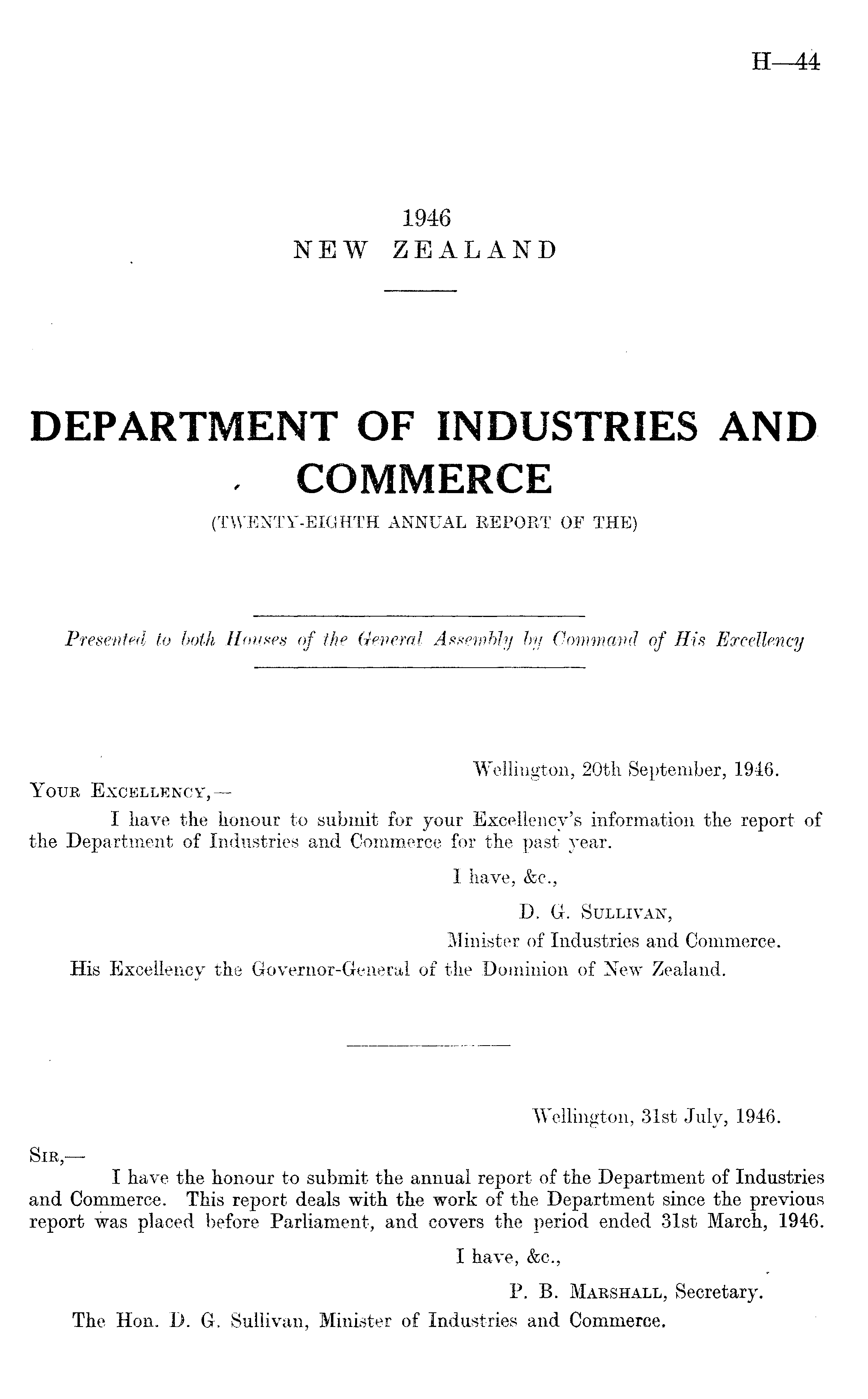 Presented to both Houses of the General Assembly by Command of His Excellency Wellington, 20th September, 1946. Your Excellency,— I have the honour to submit for your Excellency's information the report of the Department of Industries and Commerce for the past year. I have, &c., D. G. Sullivan, Minister of Industries and Commerce. His Excellency the Governor-General of the Dominion of New Zealand. Wellington, 31st July, 1946. Sir, — I have the honour to submit the annual report of the Department of Industries and Commerce. This report deals with the work of the Department since the previous report was placed before Parliament, and covers the period ended 31st March, 1946. I have, &c., P. B. Marshall, Secretary. The Hon. D. G. Sullivan, Minister of Industries and Commerce.