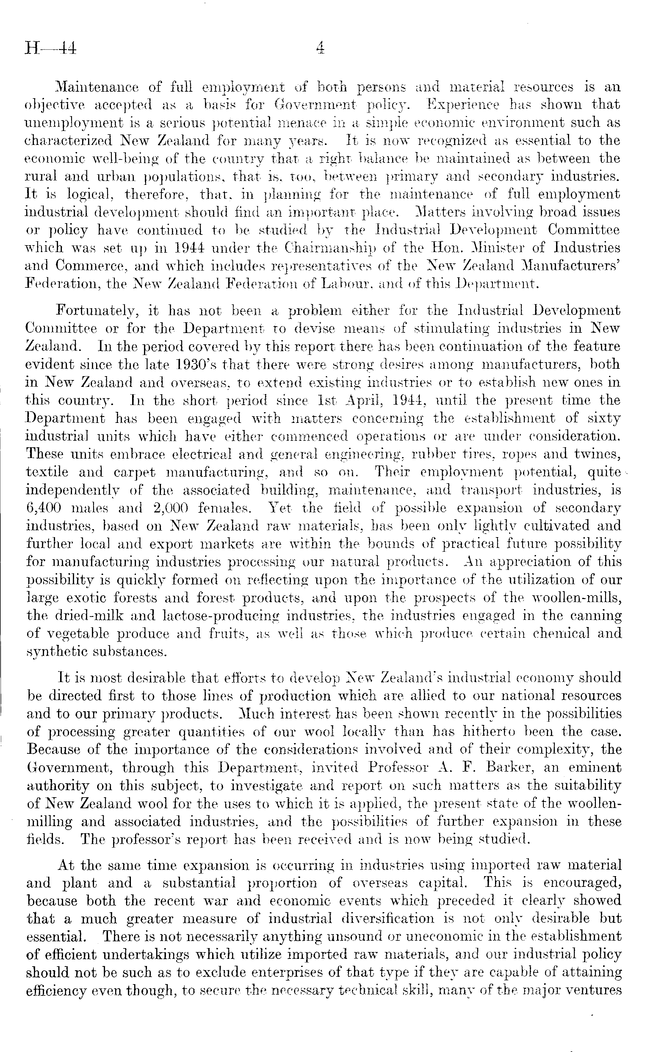 Maintenance of full employment of both persons and material resources is an objective accepted as a basis for Government policy. Experience has shown that unemployment is a serious potential menace in a simple economic environment such as characterized New Zealand for many years. It is now recognized as essential to the economic well-being of the country that a right balance be maintained as between the rural and urban populations, that is, too, between primary and secondary industries. It is logical, therefore, that, in planning for the maintenance of full employment industrial development should find an important place. Matters involving broad issues or policy have continued to be studied by the Industrial Development Committee which was set up in 1944 under the Chairmanship of the Hon. Minister of Industries and Commerce, and which includes representatives of the New Zealand Manufacturers' Federation, the New Zealand Federation of Labour, and of this Department. Fortunately, it has not been a problem either for the Industrial Development Committee or for the Department to devise means of stimulating industries in New Zealand. In the period covered by this report there has been continuation of the feature evident since the late 1930's that there were strong desires among manufacturers, both in New Zealand and overseas, to extend existing industries or to establish new ones in this country. In the short period since Ist April, 1944, until the present time the Department has been engaged with matters concerning the establishment of sixty industrial units which have either commenced operations or are under consideration. These units embrace electrical and general engineering, rubber tires, ropes and twines, textile and carpet. manufacturing, and so on. Their employment potential, quite independently of the associated building, maintenance, and transport industries, is 6,400 males and 2,000 females. Yet the field of possible expansion of secondary industries, based on New Zealand raw materials, has been only lightly cultivated and further local and export markets are within the bounds of practical future possibility for manufacturing industries processing our natural products. An appreciation of this possibility is quickly formed on reflecting upon the importance of the utilization of our large exotic forests and forest products, and upon the prospects of the woollen-mills, the dried-milk and lactose-producing industries, the industries engaged in the canning of vegetable produce and fruits, as well as those which produce certain chemical and synthetic substances. It is most desirable that efforts to develop New Zealand's industrial economy should be directed first to those lines of production which are allied to our national resources and to our primary products. Much interest has been shown recently in the possibilities of processing greater quantities of our wool locally than has hitherto been the case. Because of the importance of the considerations involved and of their complexity, the Government, through this Department, invited Professor A. F. Barker, an eminent authority on this subject, to investigate and report on such matters as the suitability of New Zealand wool for the uses to which it is applied, the present state of the woollenmilling and associated industries, and the possibilities of further expansion in these fields. The professor's report has been received and is now being studied. At the same time expansion is occurring in industries using imported raw material and plant and a substantial proportion of overseas capital. This is encouraged, because both the recent war and economic events which preceded it clearly showed that a much greater measure of industrial diversification is not only desirable but essential. There is not necessarily anything unsound or uneconomic in the establishment of efficient undertakings which utilize imported raw materials, and our industrial policy should not be such as to exclude enterprises of that type if they are capable of attaining efficiency even though, to secure the necessary technical skill, many of the major ventures