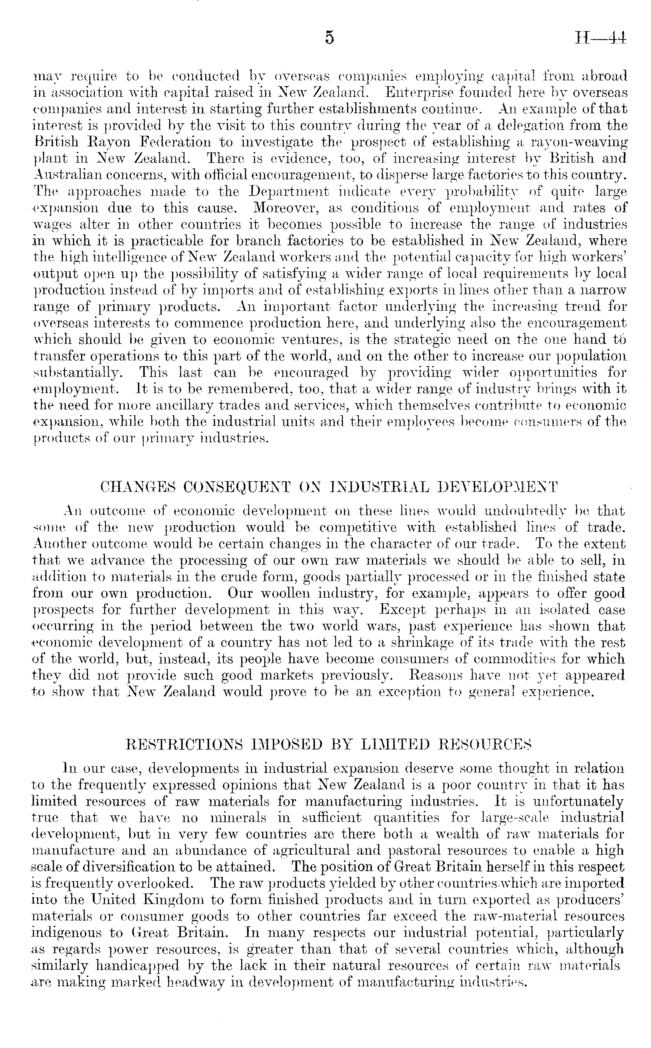 may require to be conducted by overseas companies employing capital from abroad in association with capital raised in New Zealand. Enterprise founded here by overseas companies and interest in starting further establishments continue. An example of that interest is provided by the visit to this country during the year of a delegation from the British Rayon Federation to investigate the prospect of establishing a rayon-weaving plant in New Zealand. There is evidence, too, of increasing interest by British and Australian concerns, with official encouragement, to disperse large factories to this country. The approaches made to the Department indicate every probability of quite large •expansion due to this cause. Moreover, as conditions of employment and rates of wages alter in other countries it becomes possible to increase the range of industries in which it is practicable for branch factories to be established in New Zealand, where the high intelligence of New Zealand workers and the potential capacity for high workers' output open up the possibility of satisfying a wider range of local requirements by local production instead of by imports and of establishing exports in lines other than a narrow range of primary products. An important factor underlying the increasing trend for overseas interests to commence production here, and underlying also the encouragement which should be given to economic ventures, is the strategic need on the one hand t6' transfer operations to this part of the world, and on the other to increase our population substantially. This last can be encouraged by providing wider opportunities for employment. It is to be remembered, too, that a wider range of industry brings with it the need for more ancillary trades and services, which themselves contribute to economic expansion, while both the industrial units and their employees become consumers of the products of our primary industries. CHANGES CONSEQUENT ON INDUSTRIAL DEVELOPMENT An outcome of economic development on these lines would undoubtedly be that some of the new production would be competitive with established lines of trade. Another outcome would be certain changes in the character of our trade. To the extent that we advance the processing of our own raw materials we should be able to sell, in addition to materials in the crude form, goods partially processed or in the finished state from our own production. Our woollen industry, for example, appears to offer good prospects for further development in this way. Except perhaps in an isolated case occurring in the period between the two world wars, past experience has shown that economic development of a country has not led to a shrinkage of its trade with the rest of the world, but, instead, its people have become consumers of commodities for which they did not provide such good markets previously. Reasons have not yet appeared to show that New Zealand would prove to be an exception to general experience. RESTRICTIONS IMPOSED BY LIMITED RESOURCES In our case, developments in industrial expansion deserve some thought in relation to the frequently expressed opinions that New Zealand is a poor country in that it has limited resources of raw materials for manufacturing industries. It is unfortunately true that we have no minerals in sufficient quantities for large-scale industrial development, but in very few countries are there both a wealth of raw materials for manufacture and an abundance of agricultural and pastoral resources to enable a high scale of diversification to be attained. The position of Great Britain herself in this respect is frequently overlooked. The raw products yielded by other countries which are imported into the United Kingdom to form finished products and in turn exported as producers' materials or consumer goods to other countries far exceed the raw-material resources indigenous to Great Britain. In many respects our industrial potential, particularly as regards power resources, is greater than that of several countries which, although similarly handicapped by the lack in their natural resources of certain raw materials are making marked headway in development of manufacturing industries.