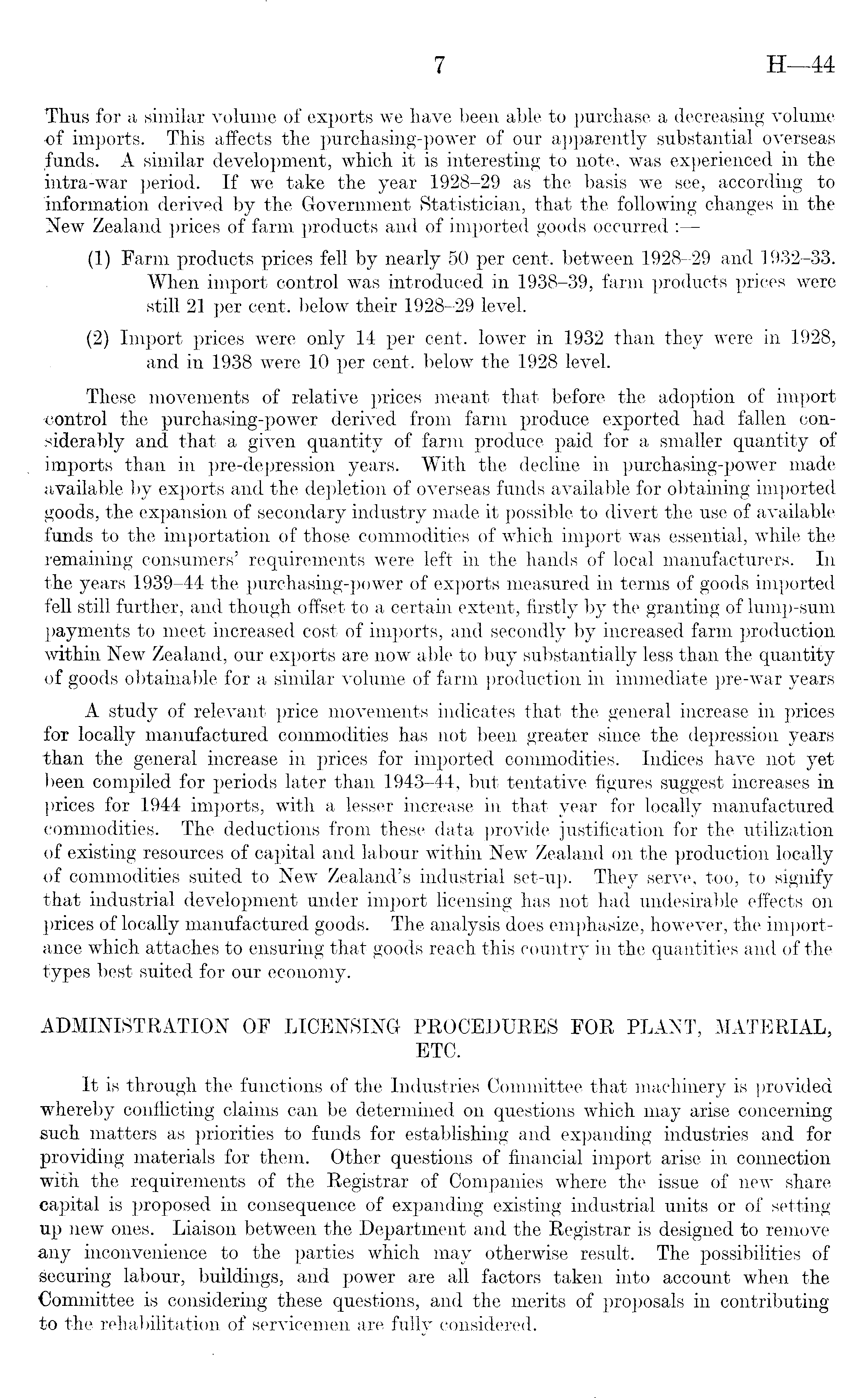 Thus for a similar volume of exports we have been able to purchase a decreasing volume ■of imports. This affects the purchasing-power of our apparently substantial overseas .funds. A similar development, which it is interesting to note, was experienced in the intra-war period. If we take the year 1928-29 as the basis we see, according to information derived by the Government Statistician, that the following changes in the New Zealand prices of farm products and of imported goods occurred : (1) Farm products prices fell by nearly 50 per cent, between 1928-29 and 1932-33. When import control was introduced in 1938-39, farm products prices were still 21 per cent, below their 1928-29 level. (2) Import prices were only 14 per cent, lower in 1932 than they were in 1928, and in 1938 were 10 per cent, below the 1928 level. These movements of relative prices meant that before the adoption of import control the purchasing-power derived from farm produce exported had fallen considerably and that a given quantity of farm produce paid for a smaller quantity of imports than in pre-depression years. With the decline in purchasing-power made available by exports and the depletion of overseas funds available for obtaining imported goods, the expansion of secondary industry made it possible to divert the use of available funds to the importation of those commodities of which import was essential, while the remaining consumers' requirements were left in the hands of local manufacturers. In the years 1939-44 the purchasing-power of exports measured in terms of goods imported fell still further, and though offset to a certain extent, firstly by the granting of lump-sum payments to meet increased cost of imports, and secondly by increased farm production within New Zealand, our exports are now able to buy substantially less than the quantity of goods obtainable for a similar volume of farm production in immediate pre-war years A study of relevant price movements indicates that the general increase in prices for locally manufactured commodities has not been greater since the depression years than the general increase in prices for imported commodities. Indices have not yet been compiled for periods later than 1943-44, but tentative figures suggest increases in prices for 1944 imports, with a lesser increase in that year for locally manufactured commodities. The deductions from these data provide justification for the utilization of existing resources of capital and labour within New Zealand on the production locally of commodities suited to New Zealand's industrial set-up. They serve, too, to signify that industrial development under import licensing has not had undesirable effects on prices of locally manufactured goods. The analysis does emphasize, however, the importance which attaches to ensuring that goods reach this country in the quantities and of the types best suited for our economy. ADMINISTRATION OF LICENSING PROCEDURES FOR PLANT, MATERIAL, ETC. It is through the functions of the Industries Committee that machinery is provided whereby conflicting claims can be determined on questions which may arise concerning such matters as priorities to funds for establishing and expanding industries and for providing materials for them. Other questions of financial import arise in connection with the requirements of the Registrar of Companies where the issue of new share capital is proposed in consequence of expanding existing industrial units or of setting up new ones. Liaison between the Department and the Registrar is designed to remove any inconvenience to the parties which may otherwise result. The possibilities of securing labour, buildings, and power are all factors taken into account when the Committee is considering these questions, and the merits of proposals in contributing to the rehabilitation of servicemen are fully considered.