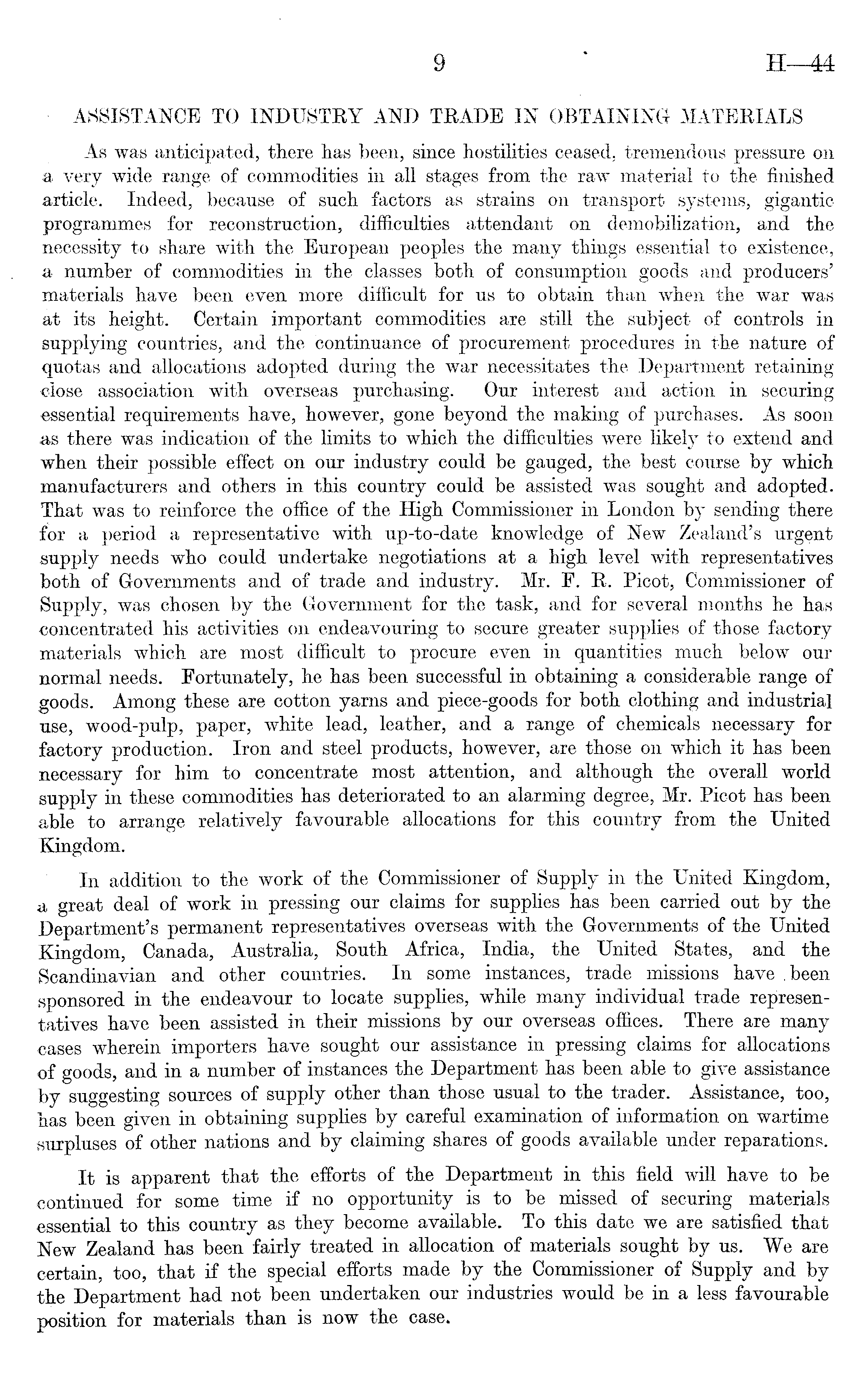 ASSISTANCE TO INDUSTRY AND TRADE IN OBTAINING MATERIALS As was anticipated, there has been, since hostilities ceased, tremendous pressure on a very wide range of commodities in all stages from the raw material to the finished article. Indeed, because of such factors as strains on transport systems, gigantic programmes for reconstruction, difficulties attendant on demobilization, and the necessity to share with the European peoples the many things essential to existence, a number of commodities in the classes both of consumption goods and producers' materials have been even more difficult for us to obtain than when the war was at its height. Certain important commodities are still the subject of controls in supplying countries, and the continuance of procurement procedures in the nature of quotas and allocations adopted during the war necessitates the Department retaining close association with overseas purchasing. Our interest and action in securing essential requirements have, however, gone beyond the making of purchases. As soon a>s there was indication of the limits to which the difficulties were likely to extend and when their possible effect on our industry could be gauged, the best course by which manufacturers and others in this country could be assisted was sought and adopted. That was to reinforce the office of the High Commissioner in London by sending there for a period a representative with up-to-date knowledge of New Zealand's urgent supply needs who could undertake negotiations at a high level with representatives both of Governments and of trade and industry. Mr. F. R. Picot, Commissioner of Supply, was chosen by the Government for the task, and for several months he has concentrated his activities on endeavouring to secure greater supplies of those factory materials which are most difficult to procure even in quantities much below our normal needs. Fortunately, he has been successful in obtaining a considerable range of goods. Among these are cotton yarns and piece-goods for both clothing and industrial use, wood-pulp, paper, white lead, leather, and a range of chemicals necessary for factory production. Iron and steel products, however, are those on which it has been necessary for him to concentrate most attention, and although the overall world supply in these commodities has deteriorated to an alarming degree, Mr. Picot has been able to arrange relatively favourable allocations for this country from the United Kingdom. In addition to the work of the Commissioner of Supply in the United Kingdom, a great deal of work in pressing our claims for supplies has been carried out by the Department's permanent representatives overseas with the Governments of the United Kingdom, Canada, Australia, South Africa, India, the United States, and the Scandinavian and other countries. In some instances, trade missions have .been sponsored in the endeavour to locate supplies, while many individual trade representatives have been assisted in their missions by our overseas offices. There are many cases wherein importers have sought our assistance in pressing claims for allocations of goods, and in a number of instances the Department has been able to give assistance by suggesting sources of supply other than those usual to the trader. Assistance, too, has been given in obtaining supplies by careful examination of information on wartime surpluses of other nations and by claiming shares of goods available under reparations. It is apparent that the efforts of the Department in this field will have to be continued for some time if no opportunity is to be missed of securing materials essential to this country as they become available. To this date we are satisfied that New Zealand has been fairly treated in allocation of materials sought by us. We are certain, too, that if the special efforts made by the Commissioner of Supply and by the Department had not been undertaken our industries would be in a less favourable position for materials than is now the case.